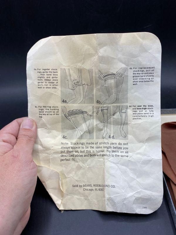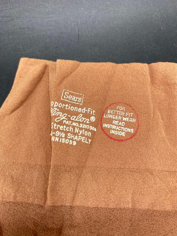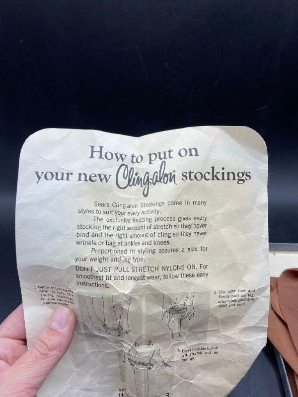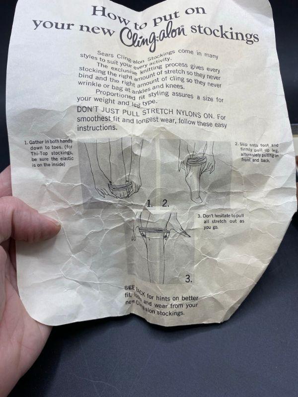 Pair of vintage Sears Cling-alon knee high stockings. Look unused. Come with instructions. Size says 8 1/2-9 1/2 Shapely.