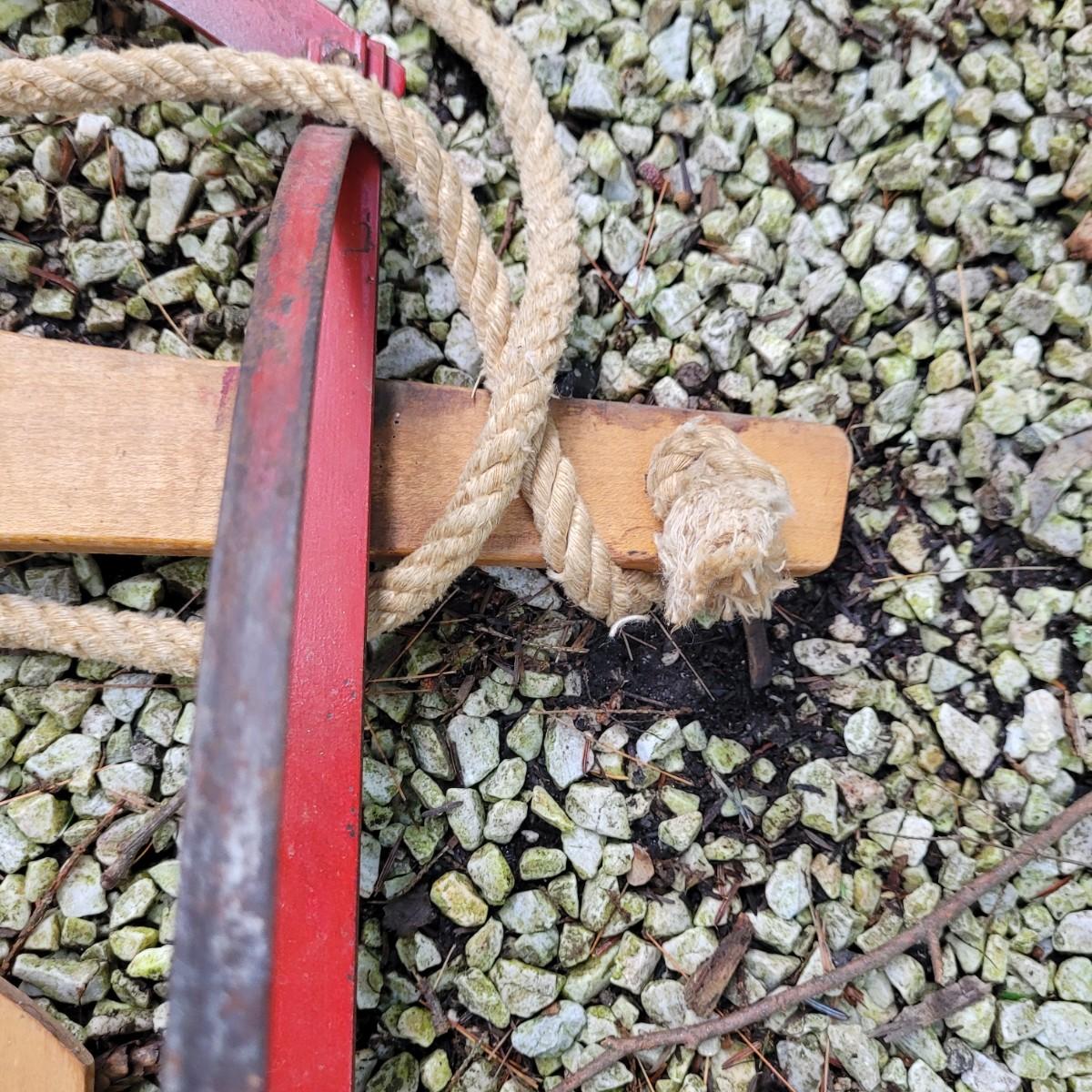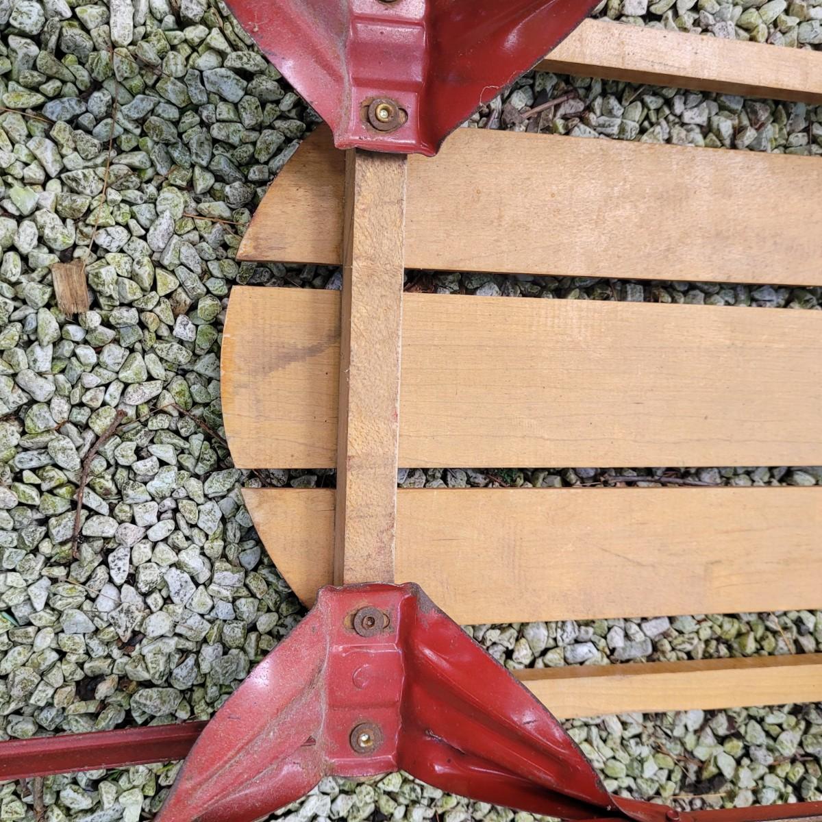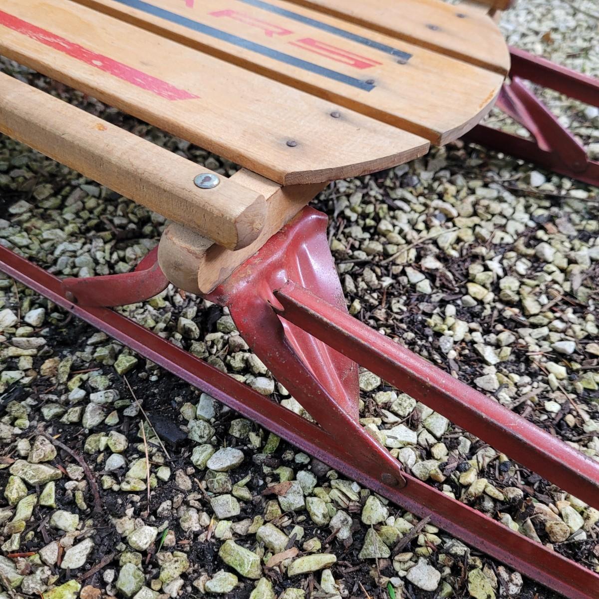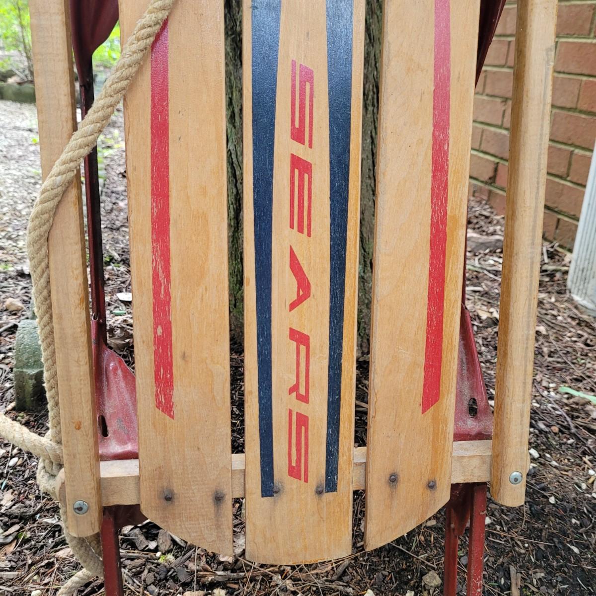 Vintage Sears sleigh with wooden seat and steering blade. Wood appears to be intact with no splitting or rot. Metal has normal wear and tear with some scratches and slight rust at hardware. Unable to test performance. Measures approximately 60"L x13"W x6"H. Wooden seat 41"L x9"W. Local pickup only.