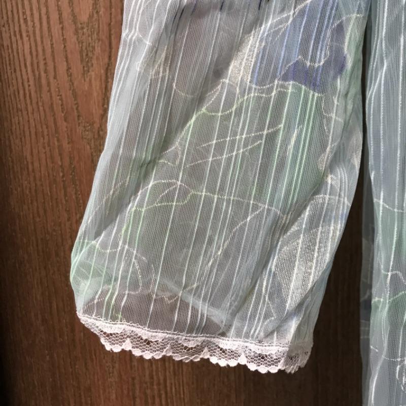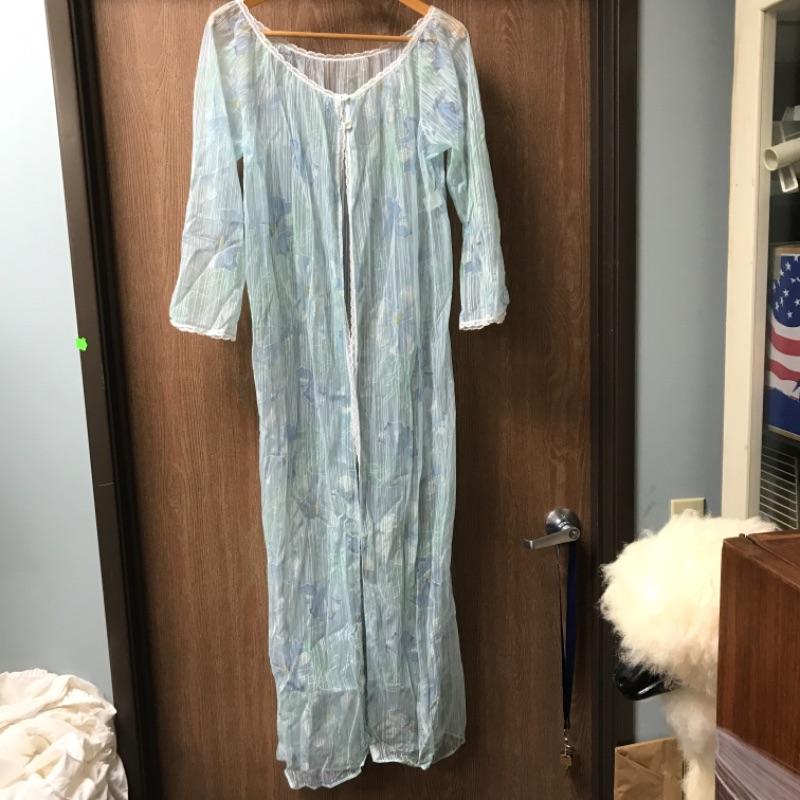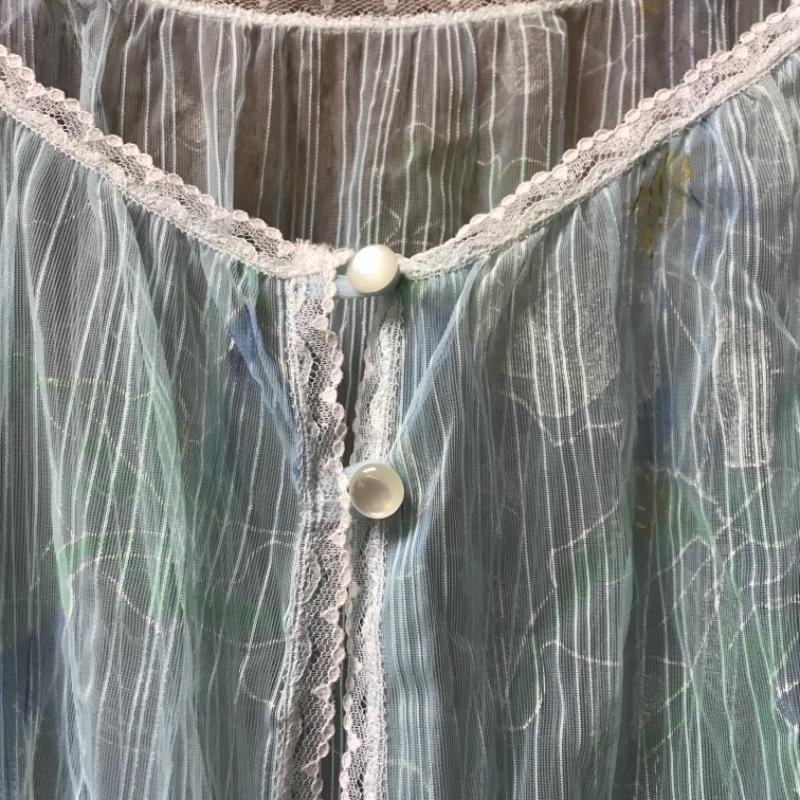 Up for auction is a vintage nylon nightgown made by Sears Roebuck and Company. It is a light aqua blue with white and yellow floral designs on the front. There are no rips, tears, or snags; see pictures.
