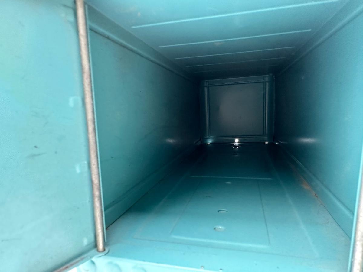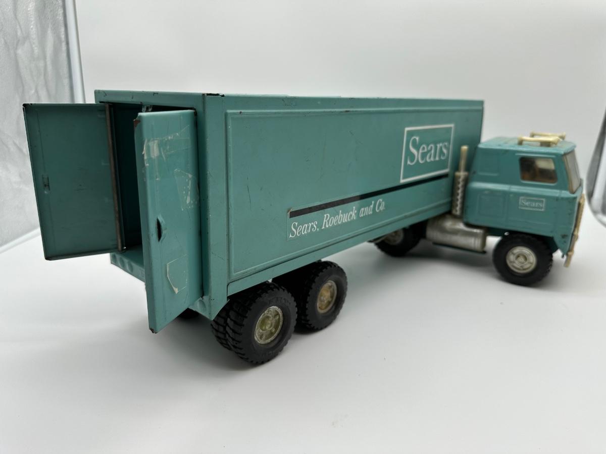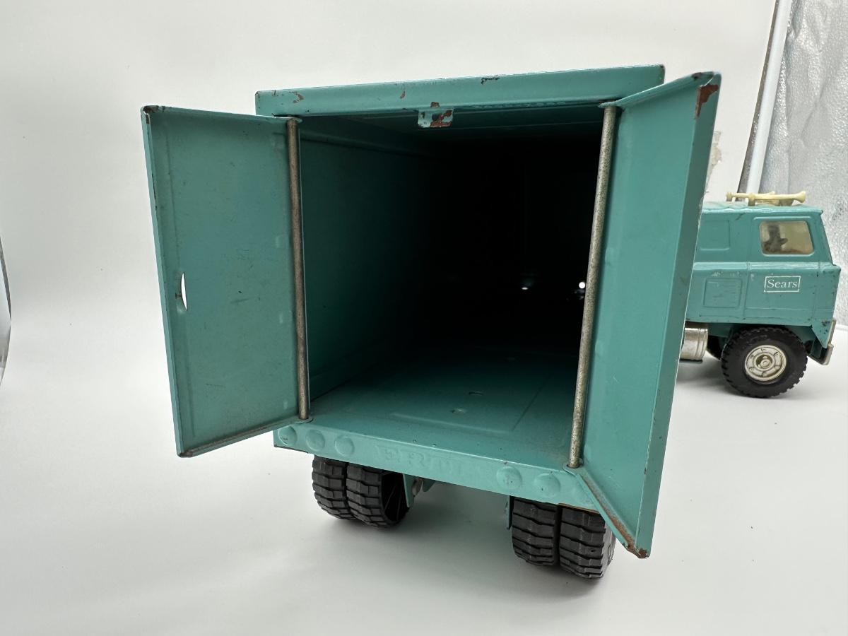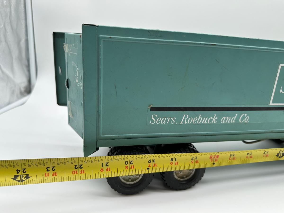 Vintage pressed steel Sears semi truck with matching box trailer, branded Sears, Roebuck and Co. Features International-style cab, opening rear trailer doors, tandem axles, and original teal/green paint. Large display-size toy with strong mid-century department store graphics.