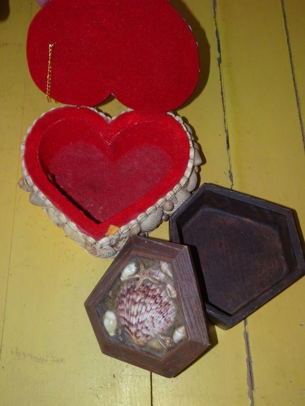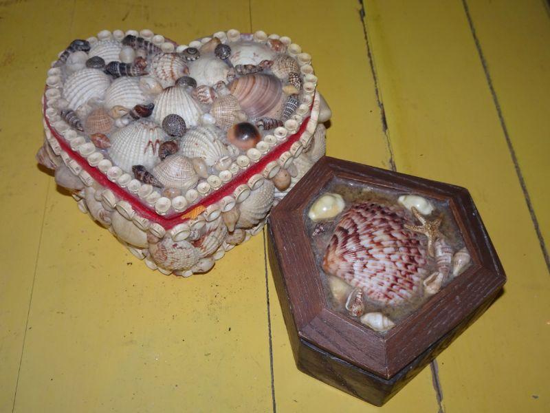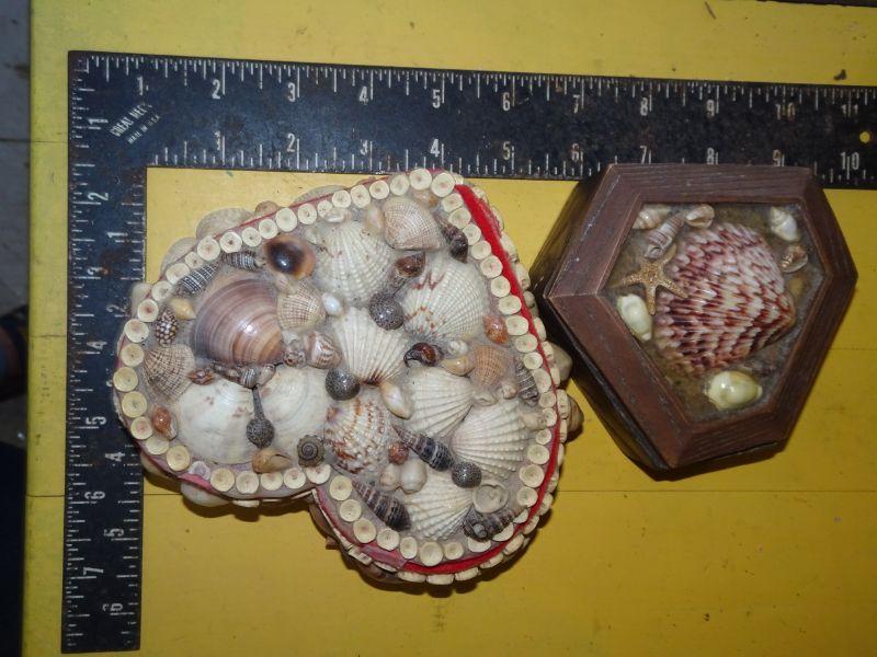 Vintage Seashell Trinket Boxes, Heart Shaped, Wood Seashell Box