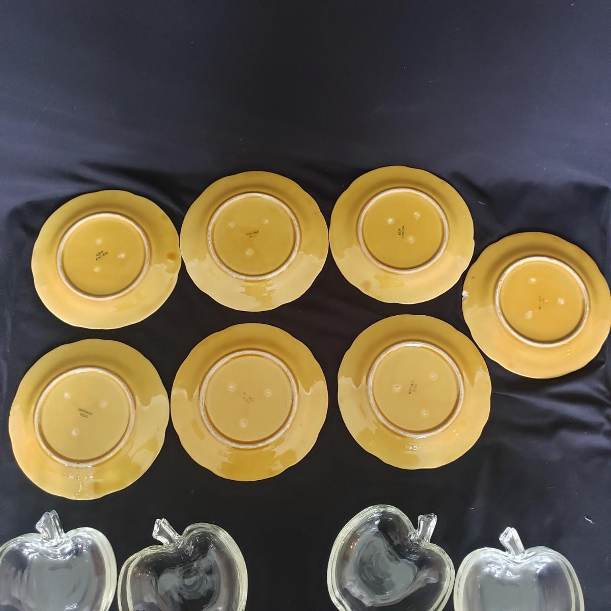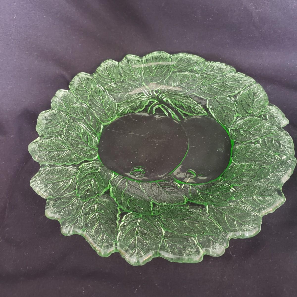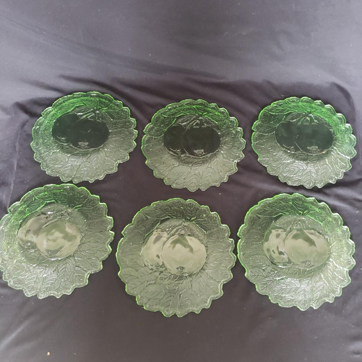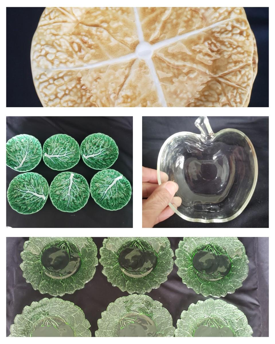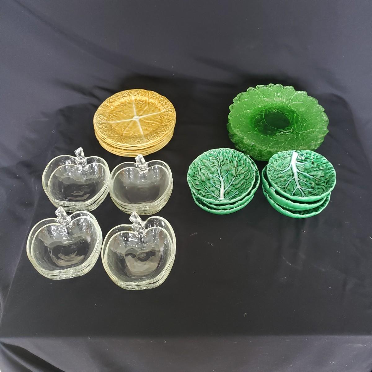This lot features seven yellow cabbage plates made in Portugal. Each plate measures 7". One plate has a small chip, see pictures. The six green cabbage bowls are also made in Portugal. There appears to be no blemishes on these. The clear apple shaped bowls measure 5" x 1.5"H. Finally, are six avocado green sweet pear plates. The underside is textured.
