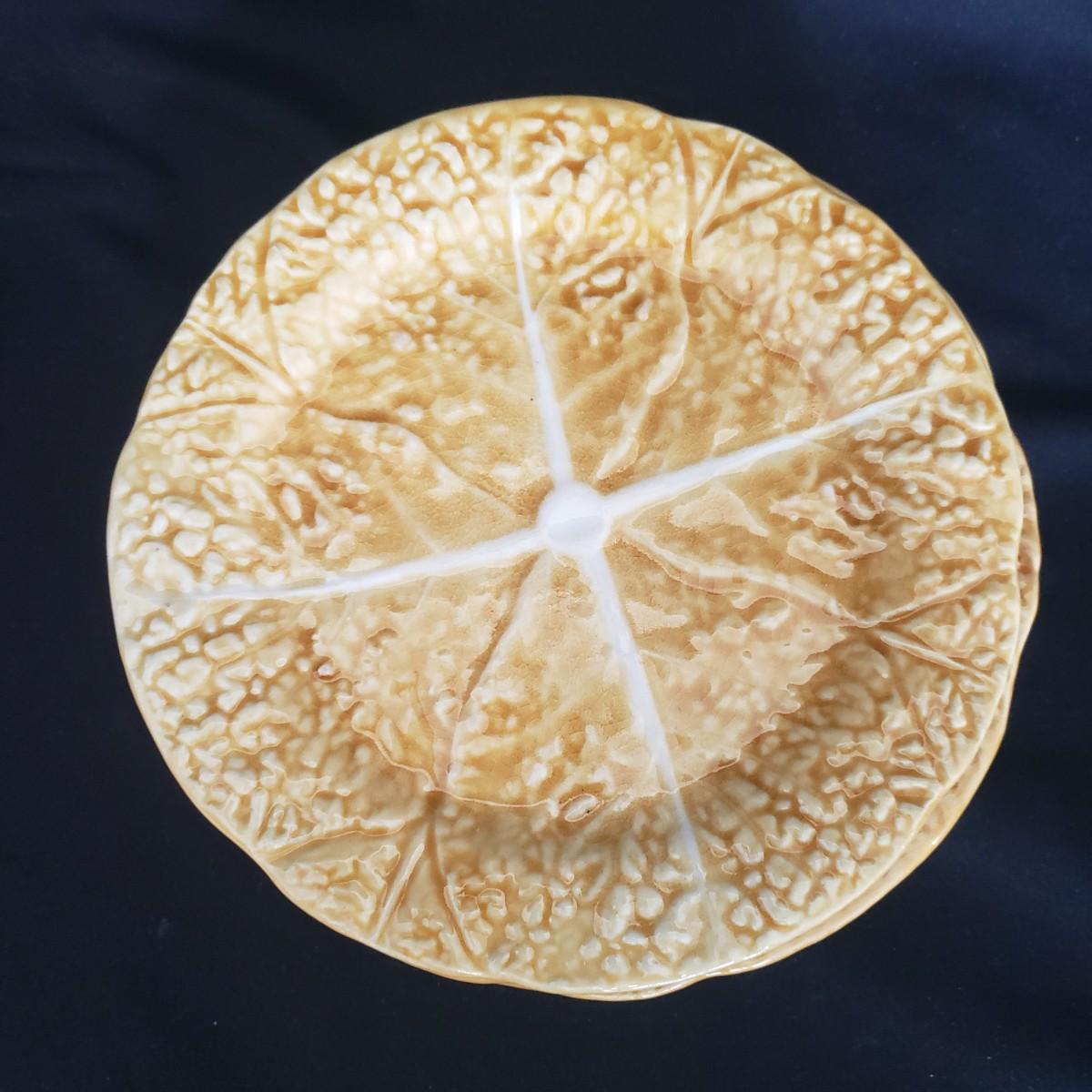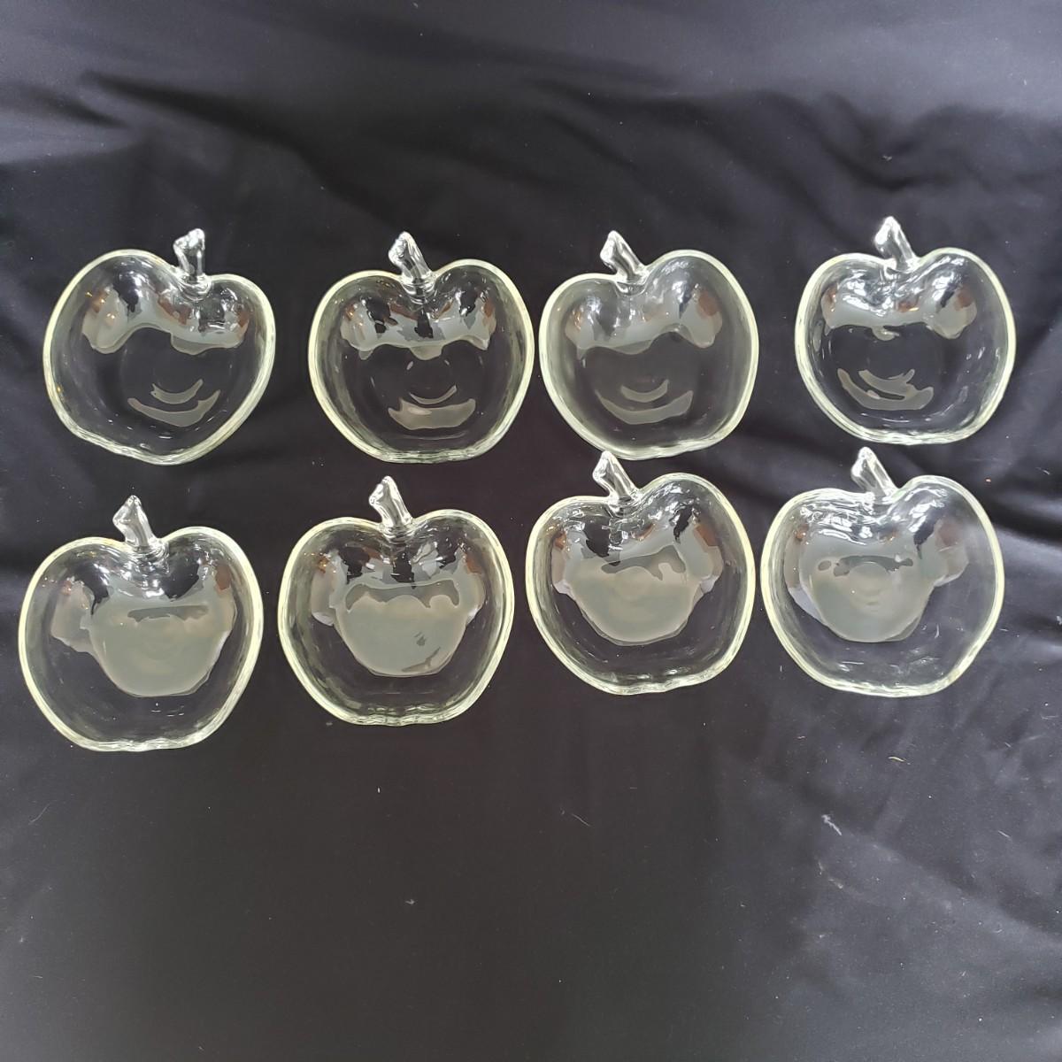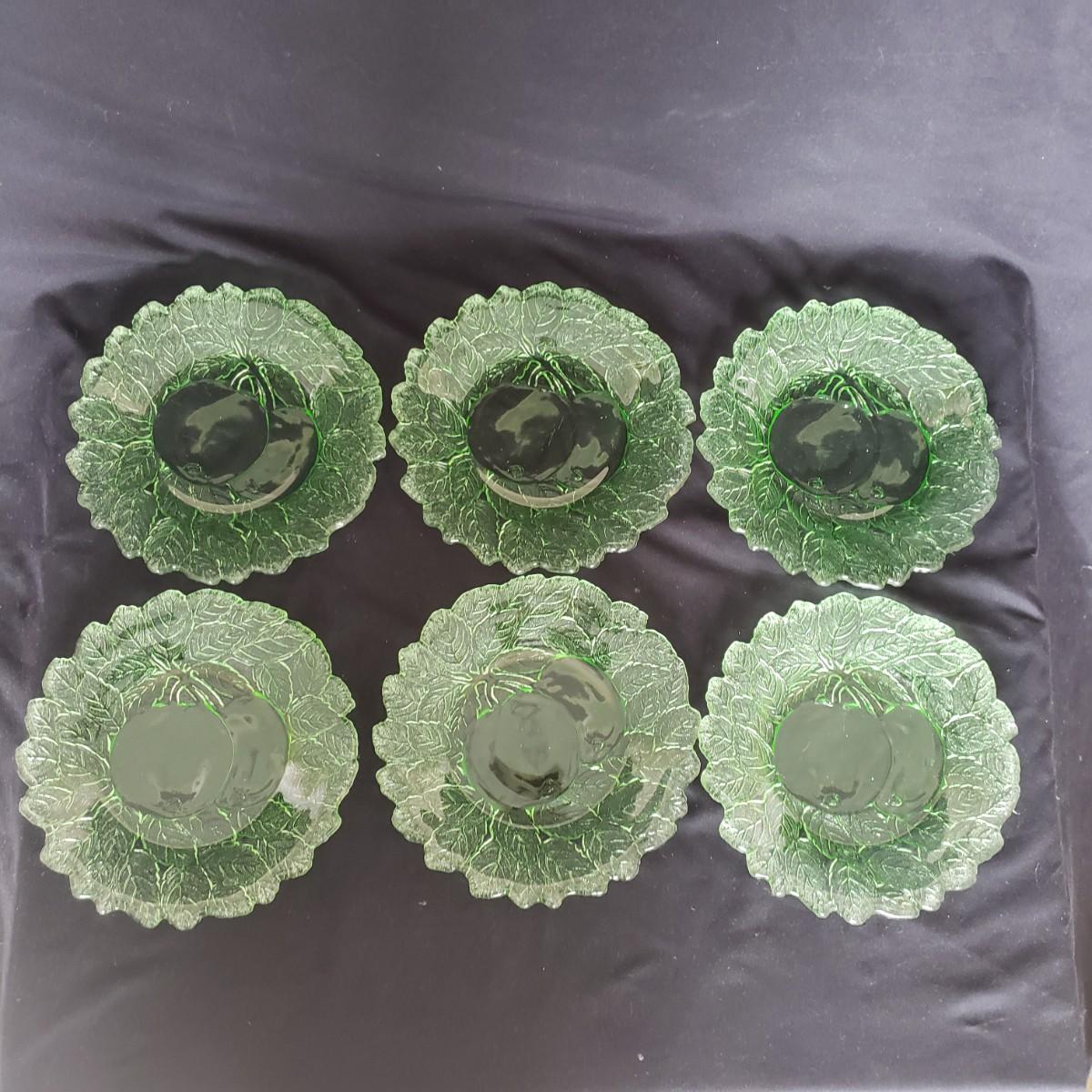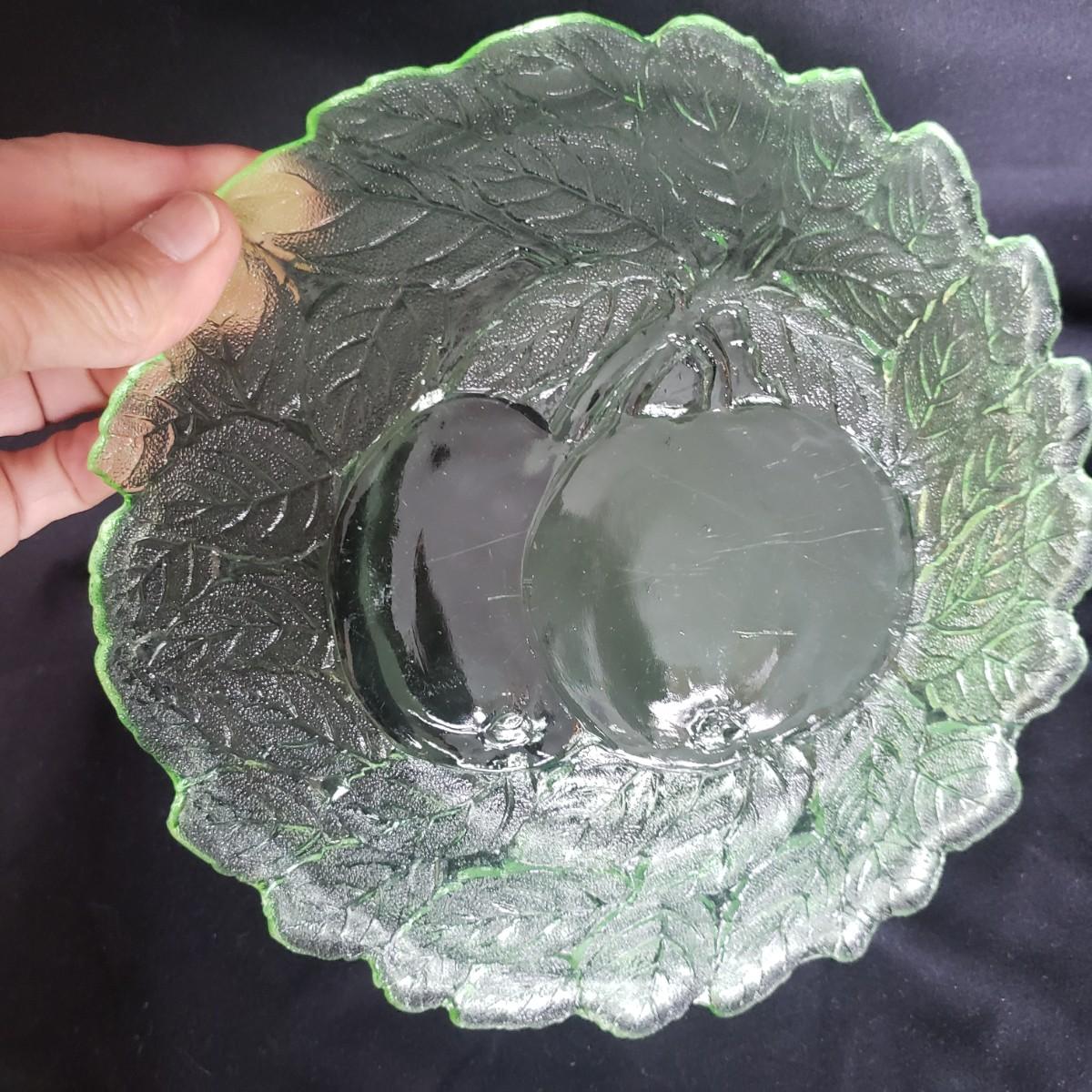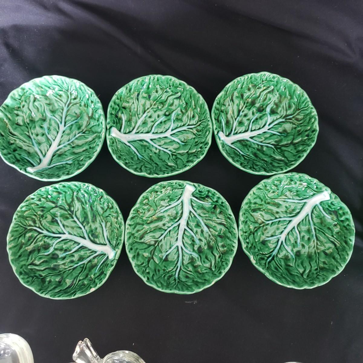 This lot features seven yellow cabbage plates made in Portugal. Each plate measures 7". One plate has a small chip, see pictures. The six green cabbage bowls are also made in Portugal. There appears to be no blemishes on these. The clear apple shaped bowls measure 5" x 1.5"H. Finally, are six avocado green sweet pear plates. The underside is textured.