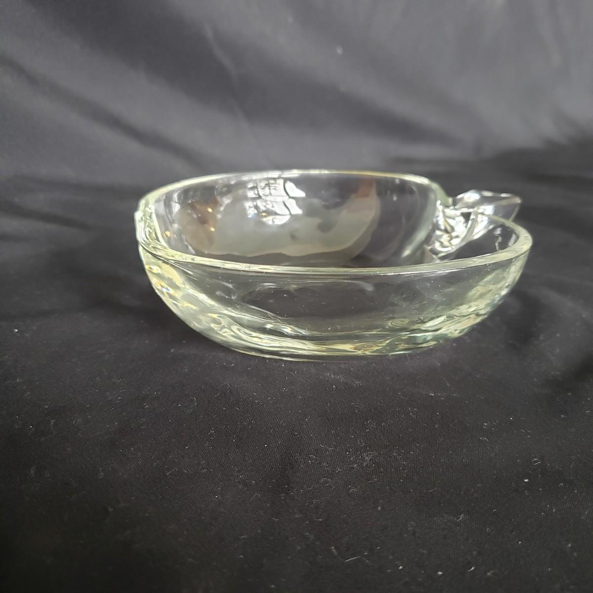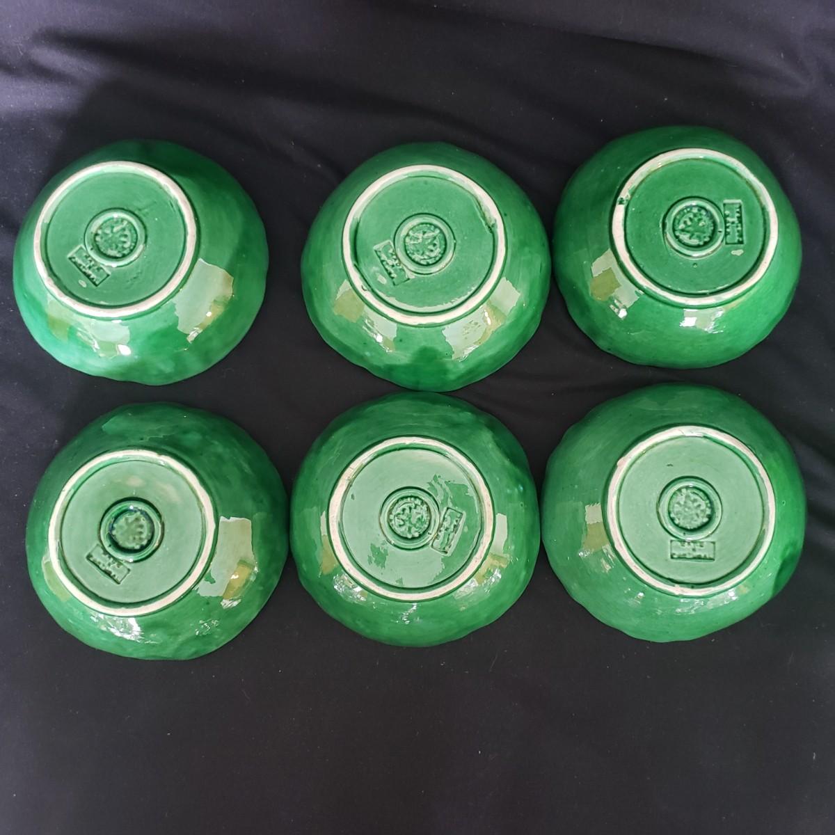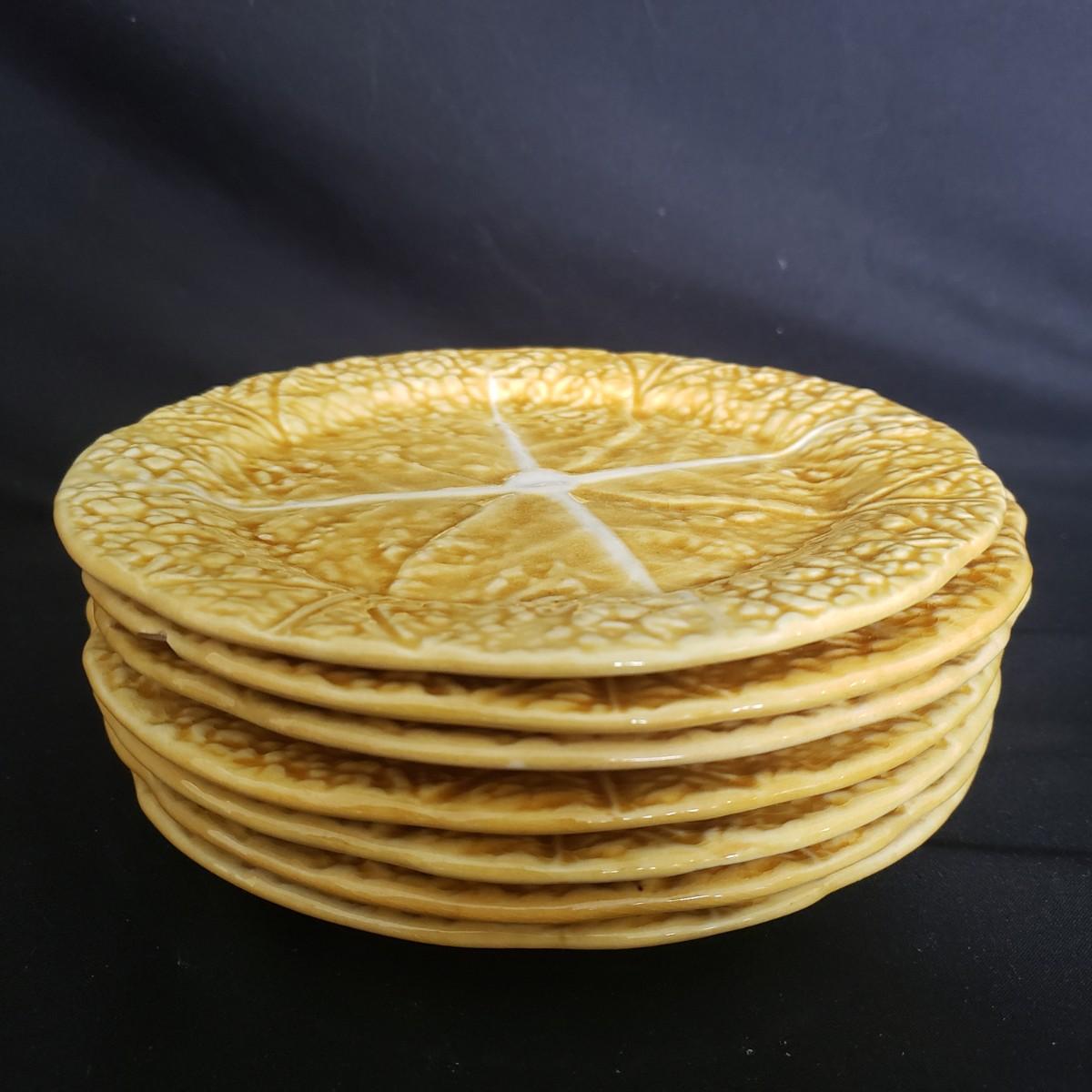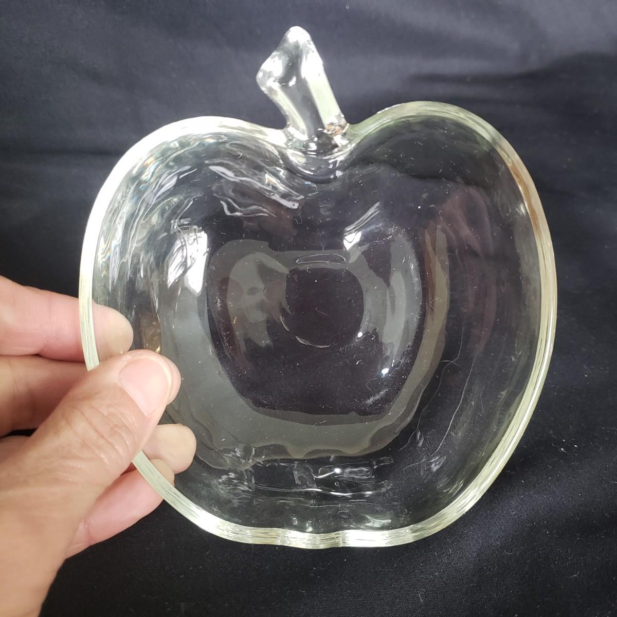 This lot features seven yellow cabbage plates made in Portugal. Each plate measures 7". One plate has a small chip, see pictures. The six green cabbage bowls are also made in Portugal. There appears to be no blemishes on these. The clear apple shaped bowls measure 5" x 1.5"H. Finally, are six avocado green sweet pear plates. The underside is textured.