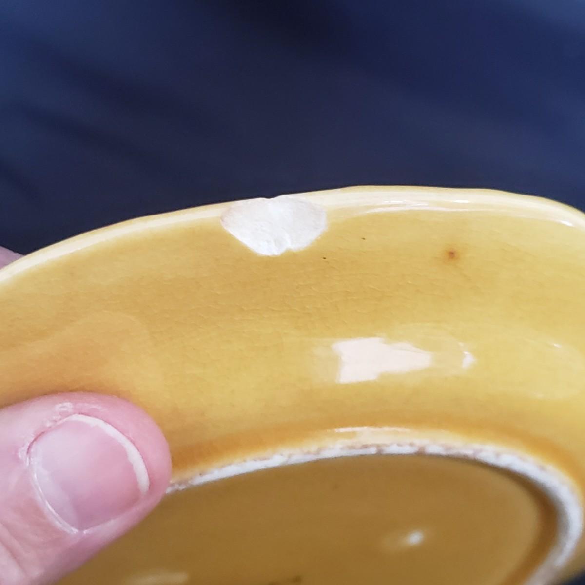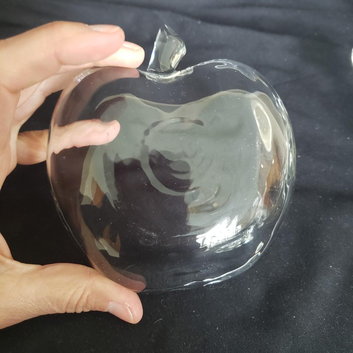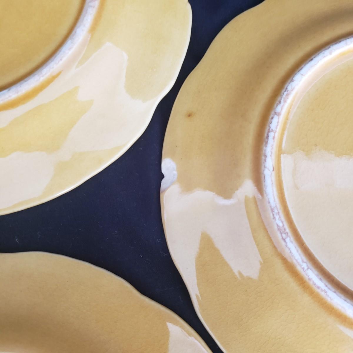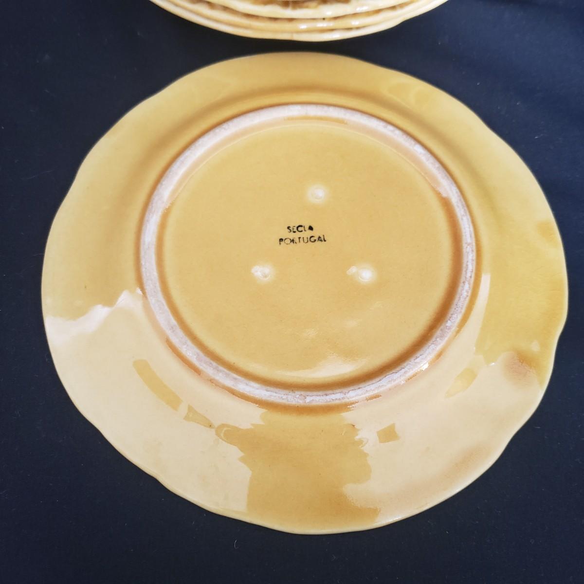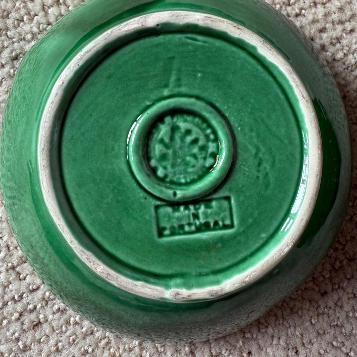 This lot features seven yellow cabbage plates made in Portugal. Each plate measures 7". One plate has a small chip, see pictures. The six green cabbage bowls are also made in Portugal. There appears to be no blemishes on these. The clear apple shaped bowls measure 5" x 1.5"H. Finally, are six avocado green sweet pear plates. The underside is textured.