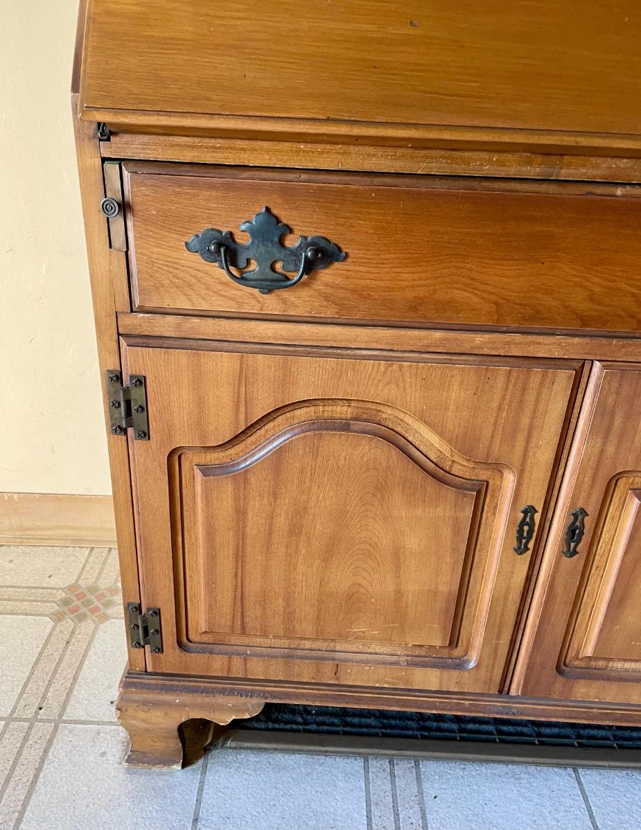 Measures approx. 71” x 34” x 16” deep. Has 2 skeleton keys for locking desk and bottom cabinet. Made from maple, Good condition.