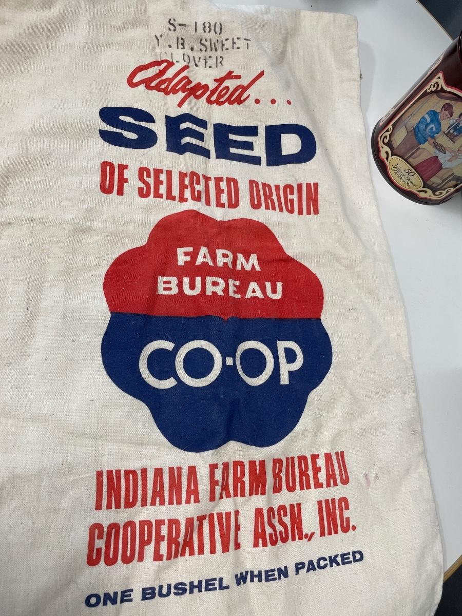 Vintage seed bag and 3 metal tins