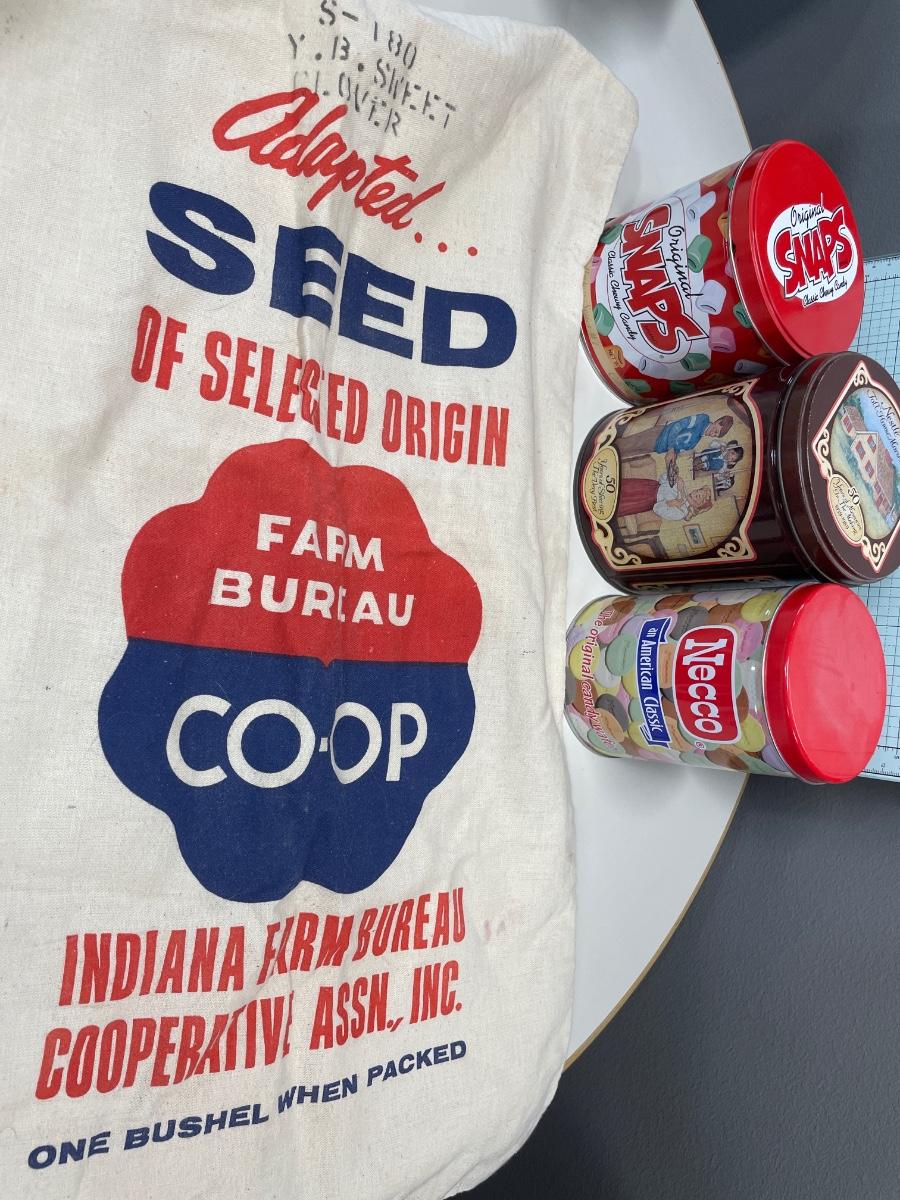 Vintage seed bag and tins