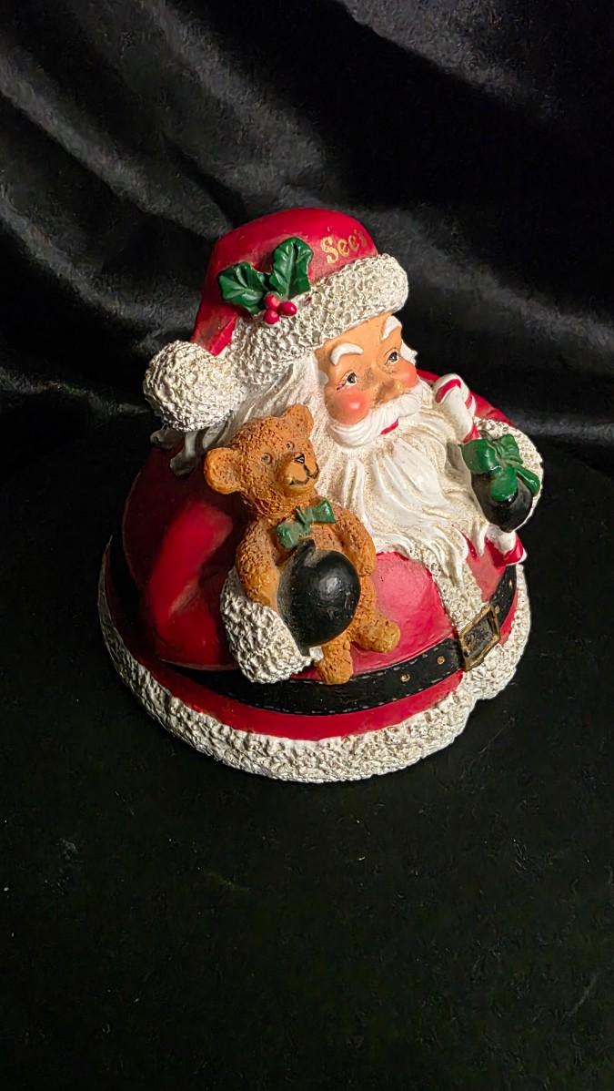A charming vintage See’s Christmas Santa figurine, bursting with nostalgic holiday character. This festive piece features Santa in rich red and white textures, holding a cheerful teddy bear on one side and a candy-striped treat on the other, all accented with classic See’s branding on his hat. His warm expression, snowy beard, and sculpted detailing bring out the classic old-fashioned holiday feel collectors love.