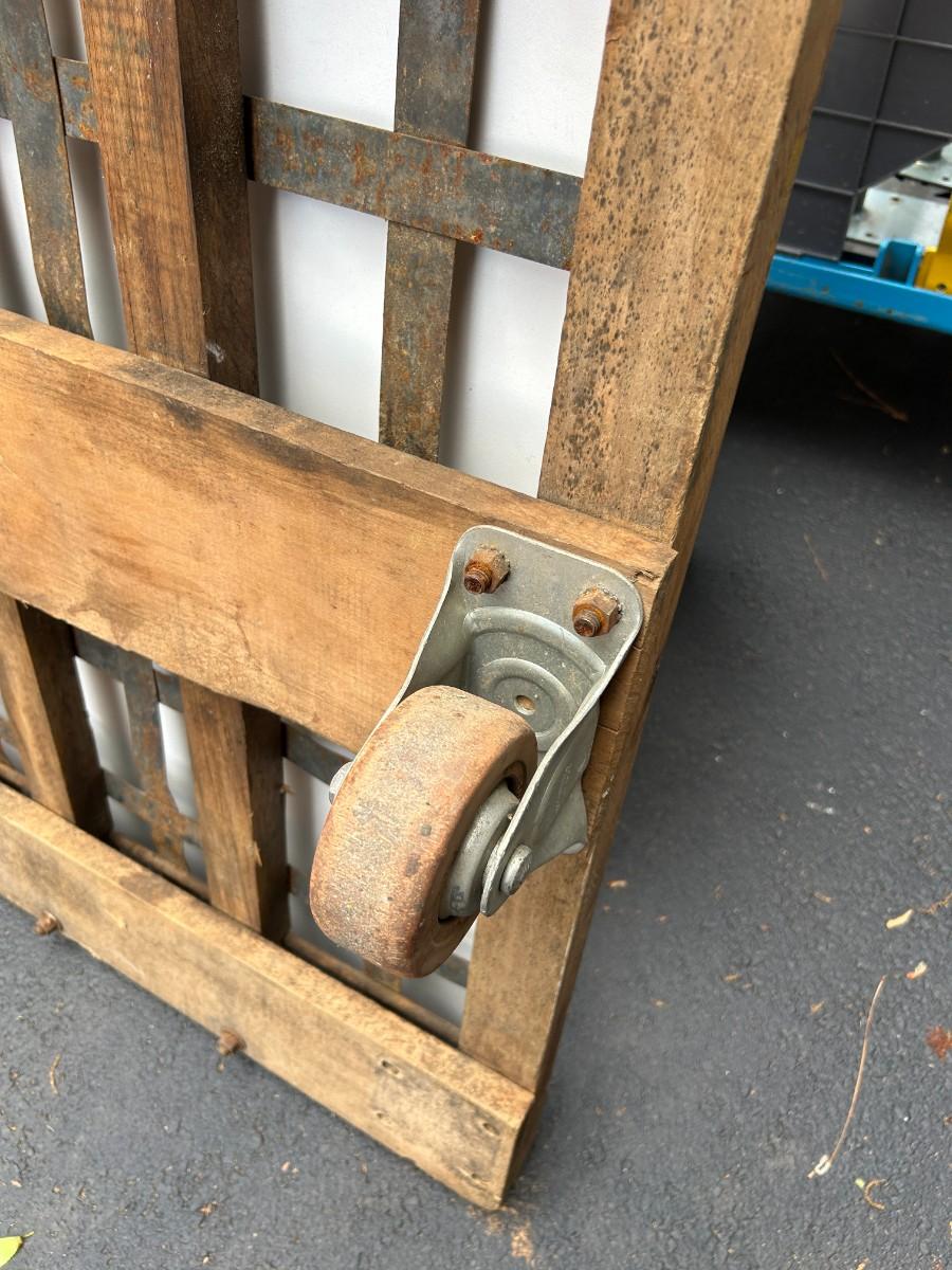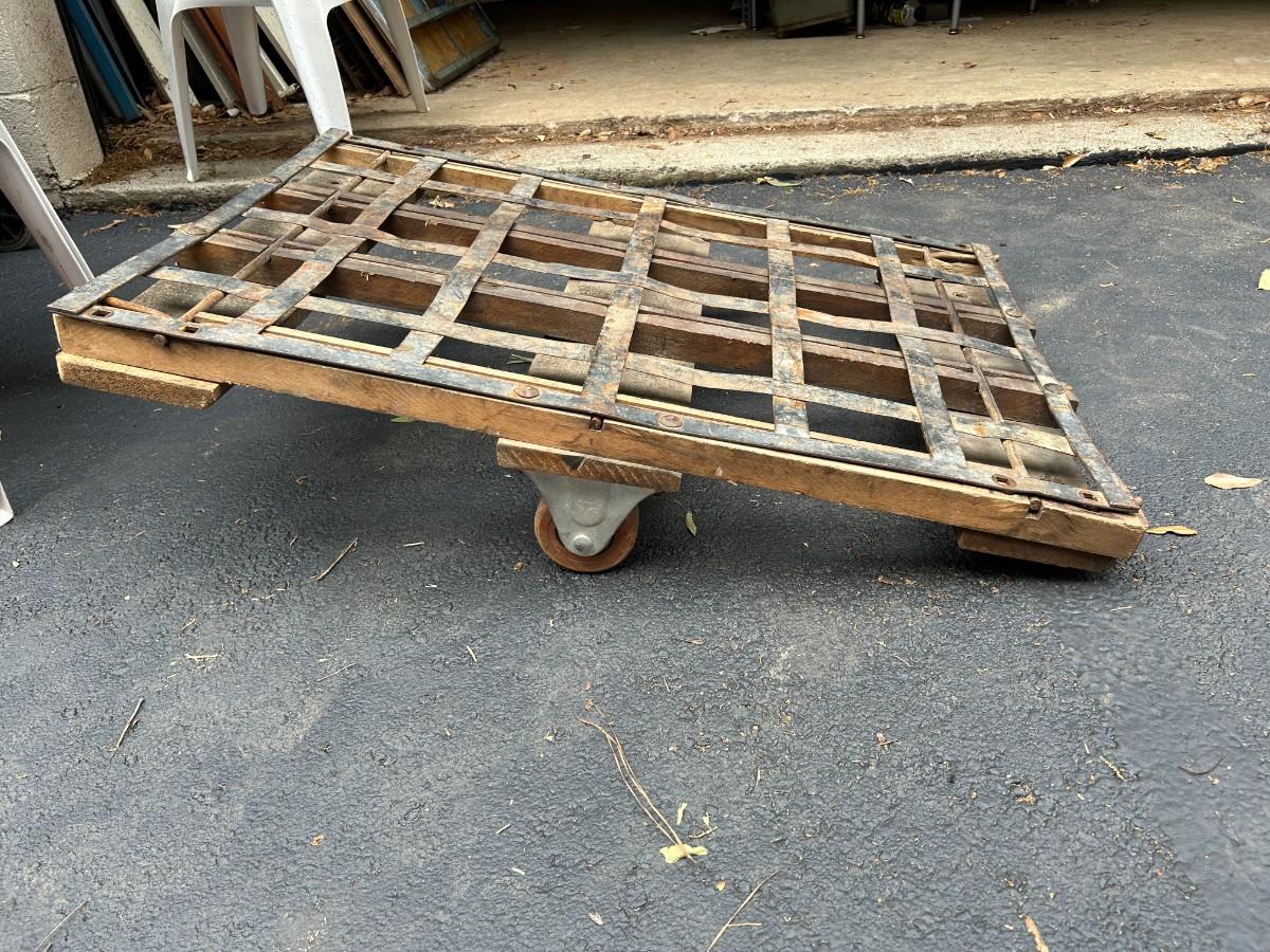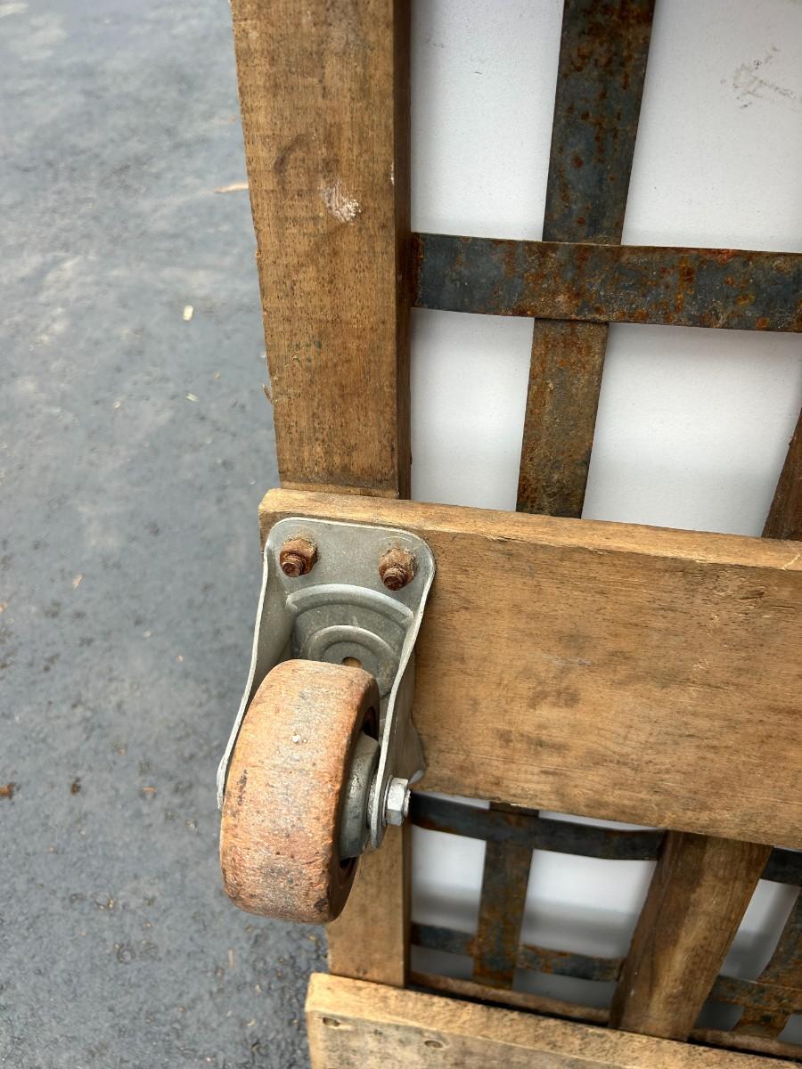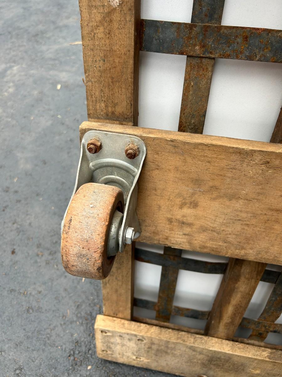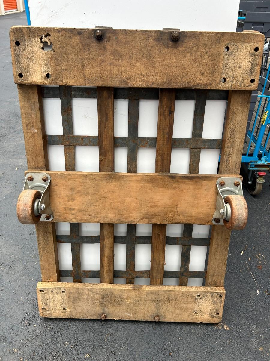 Vintage See-Saw Rolling Warehouse Cart Featuring Metal and Wood Construction