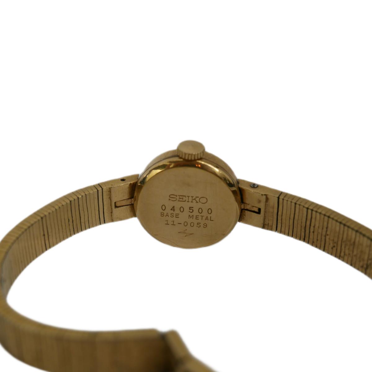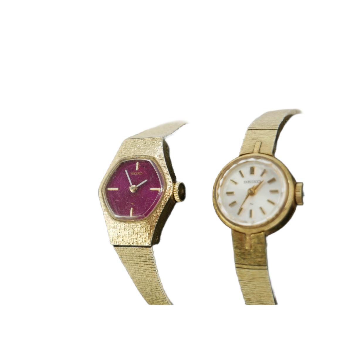 Vintage c. 1970's Seiko gold women's watches. Burgandy faced watch is operational and measures approximately 5.25" with a 17mm face. Silver faced watch is non-operational and measures 5.75" with a 20mm face. Lot weighs 1.5 oz. (J7)