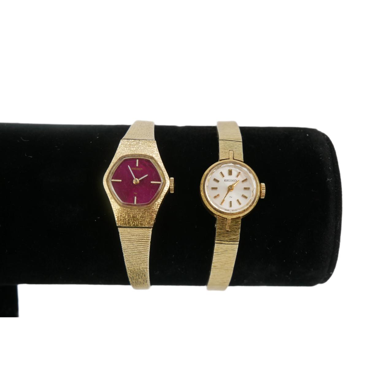 Vintage c. 1970's Seiko gold women's watches. Burgandy faced watch is operational and measures approximately 5.25" with a 17mm face. Silver faced watch is non-operational and measures 5.75" with a 20mm face. Lot weighs 1.5 oz. (J7)