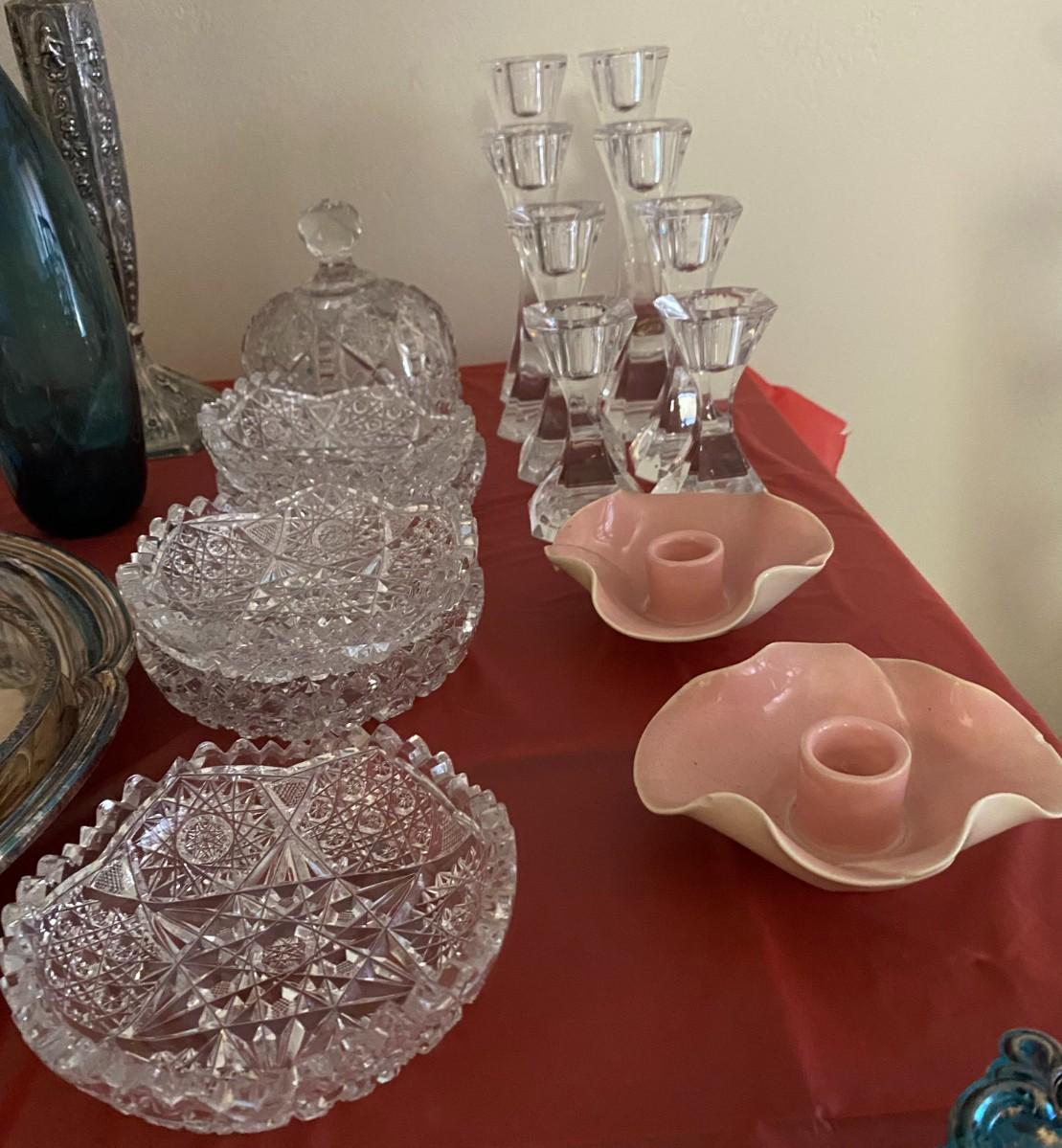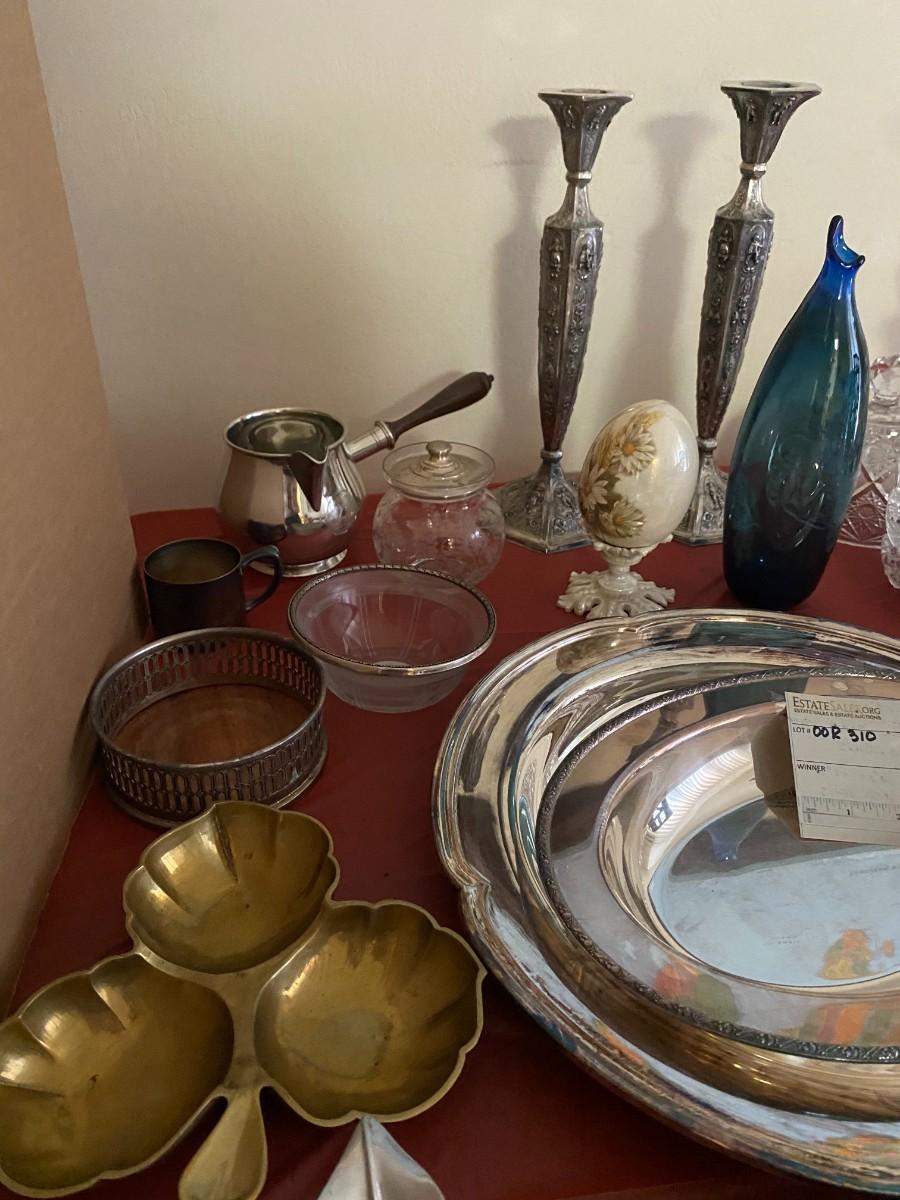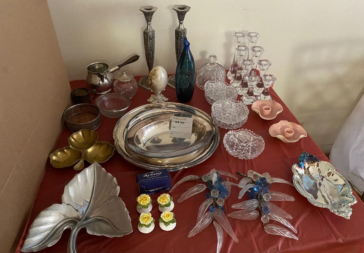 Vintage serving and decor, glass ceramic and metal Silver plated bowls, Salt and pepper shakers
