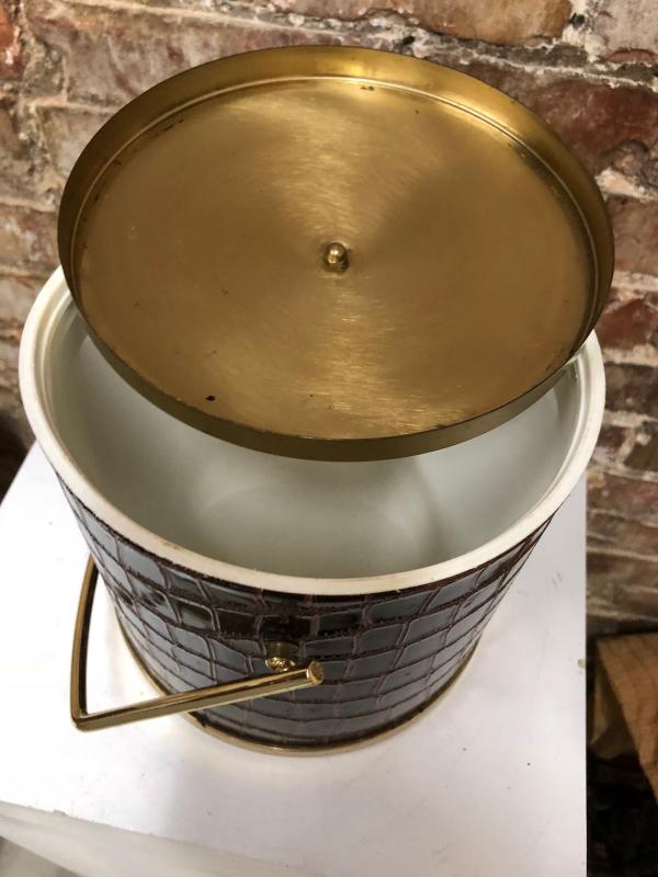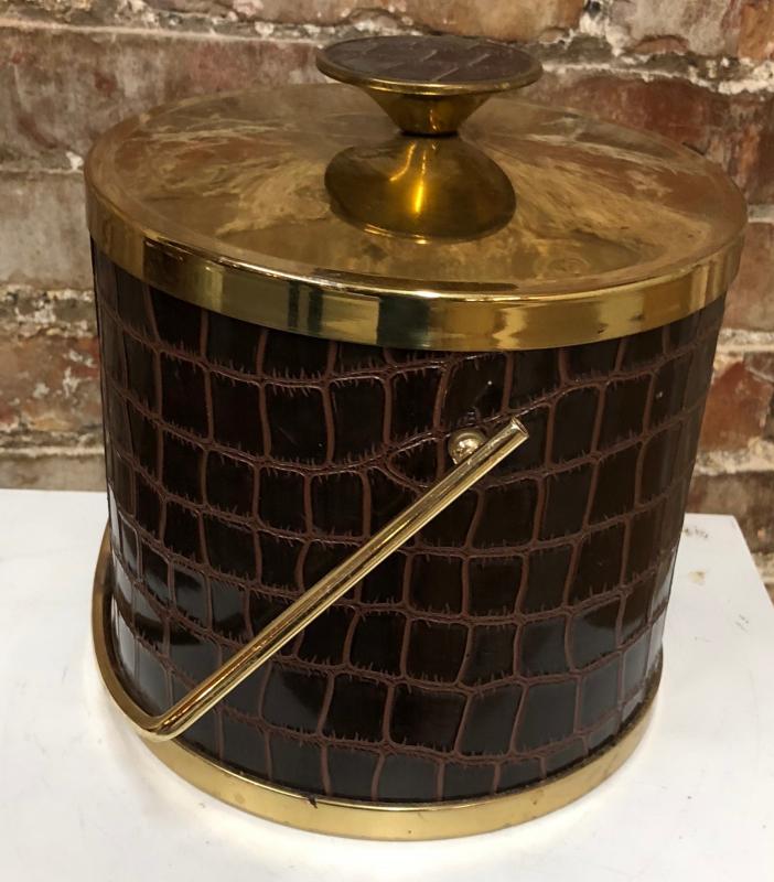 With a faux alligator covering here is a brass toned Serv-Master ice bucket in good used condition...light normal use wear...7" tall...