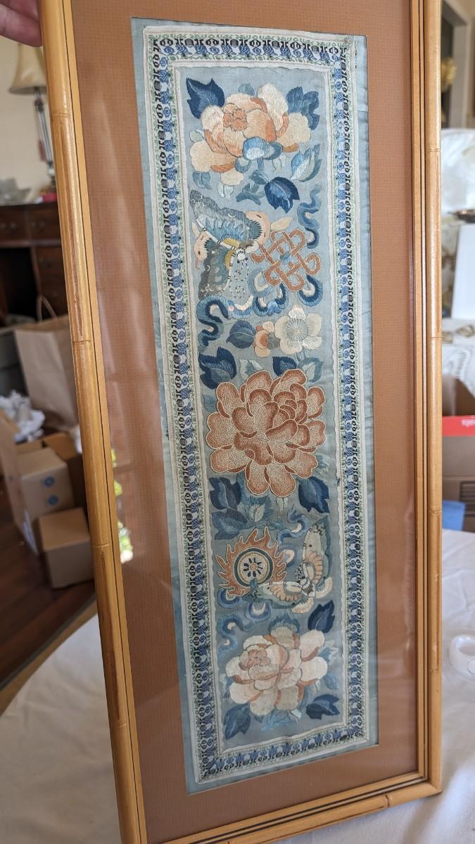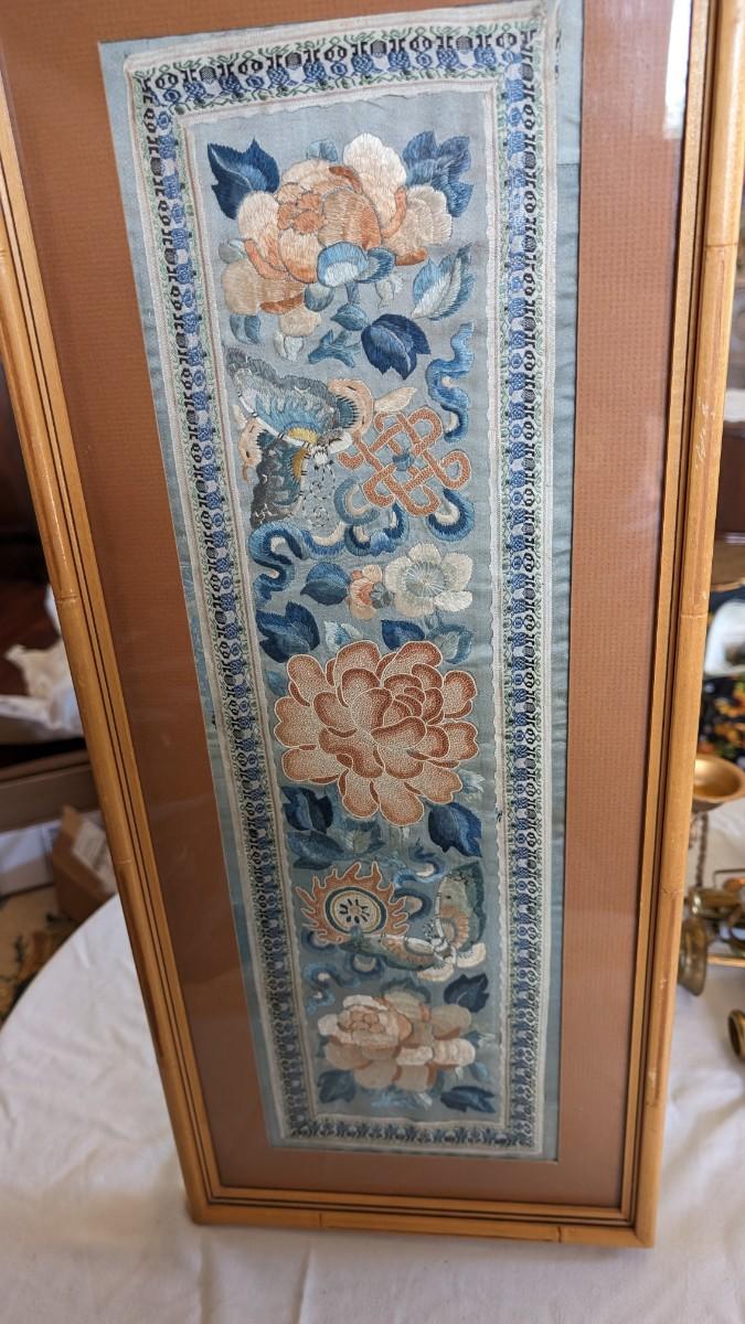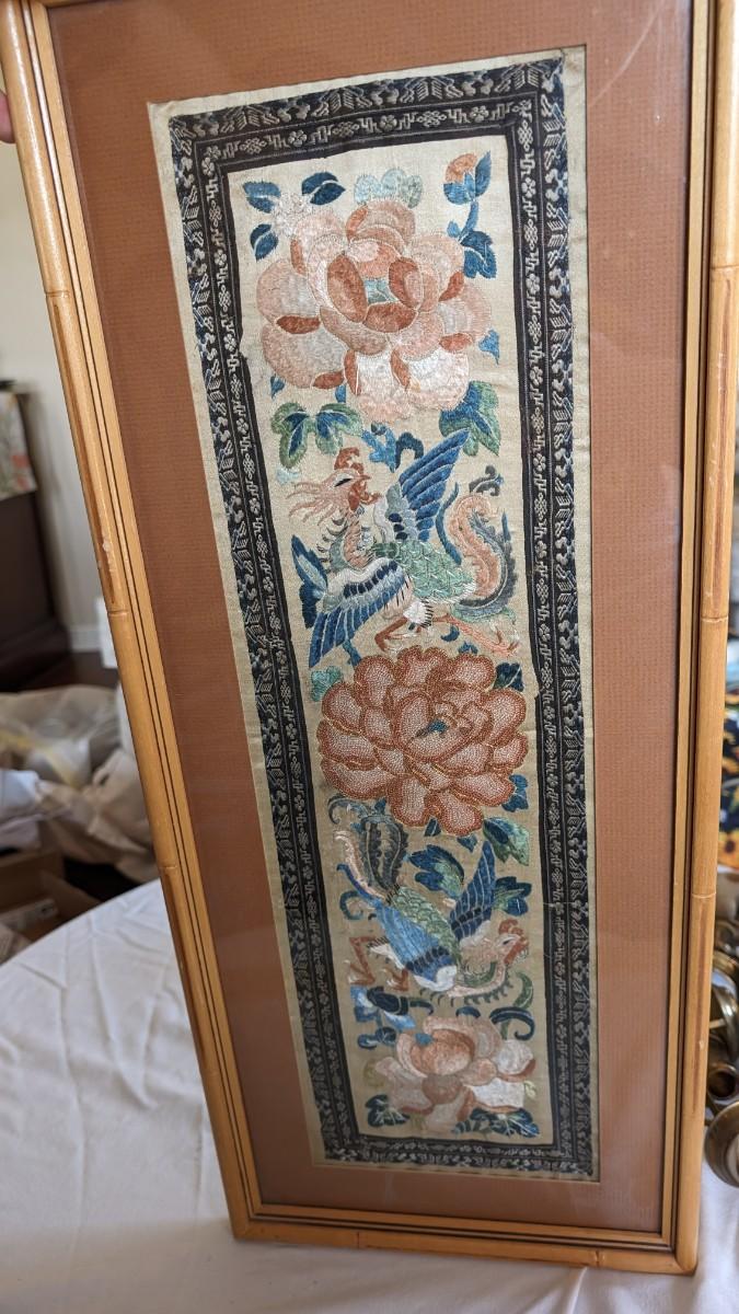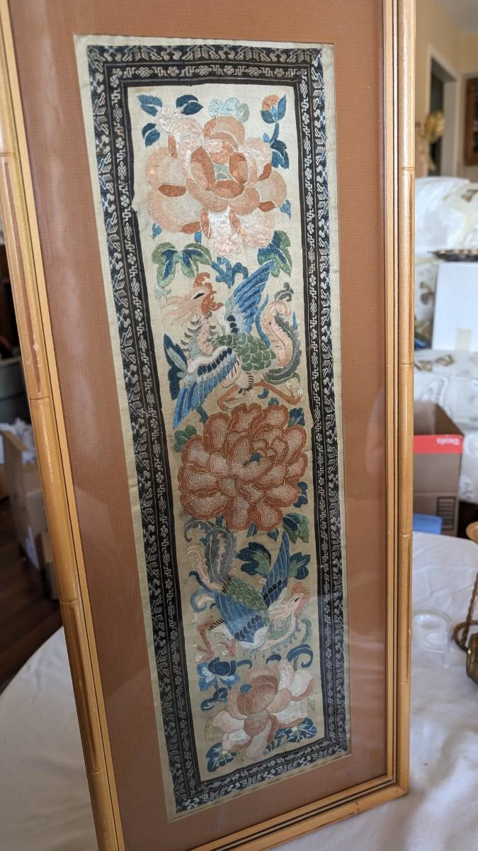 This is a set of two Bamboo-framed Silk fabric art embroidered. Approximately 25" x 10.25 x 1"