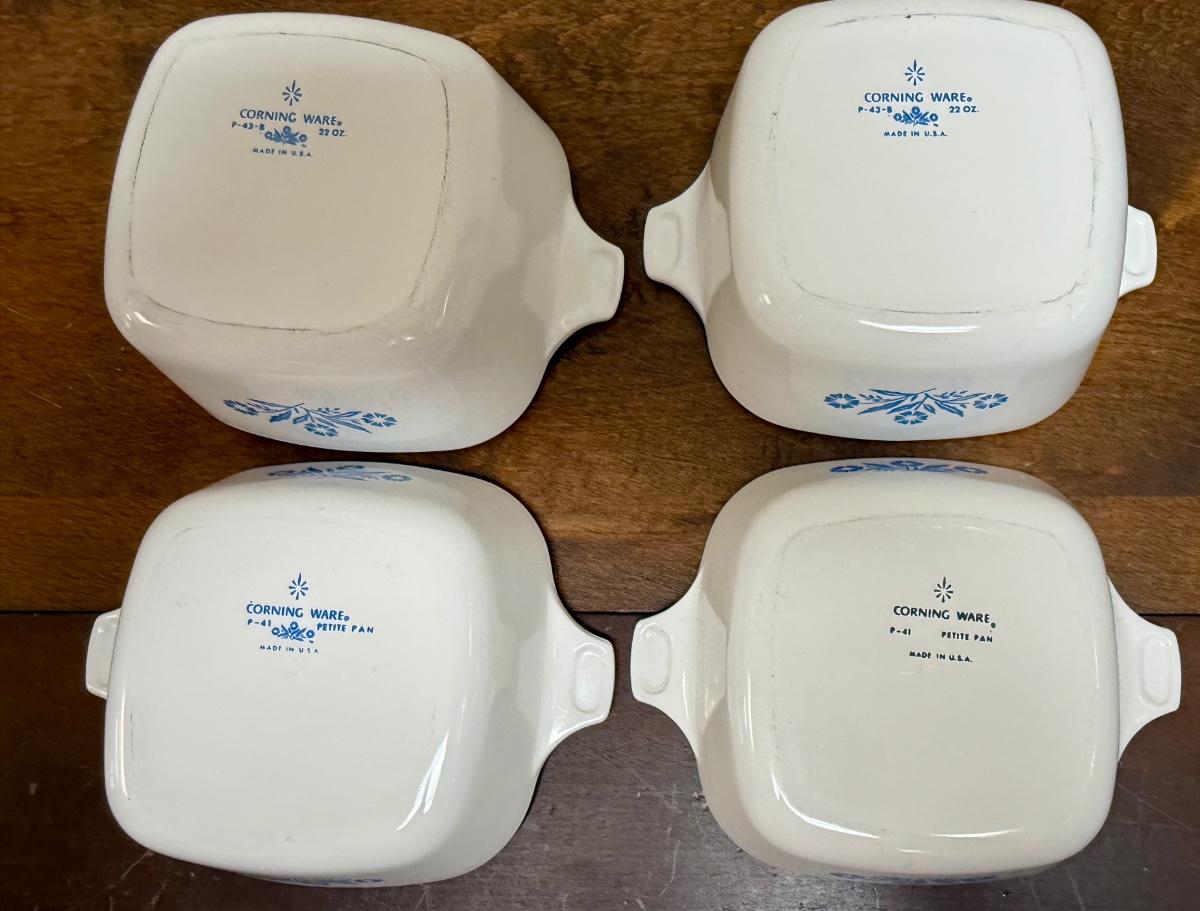 From the late 1950's: 2 P-41 Petite Pans and 2 P-43-b 22-oz Pans. White with blue cornflower design. Blue identification stamps of the bottoms. No Lids. All in good condition.