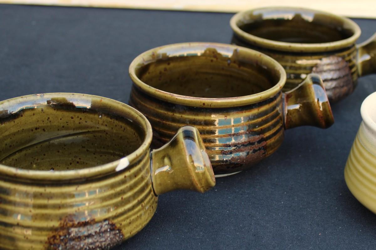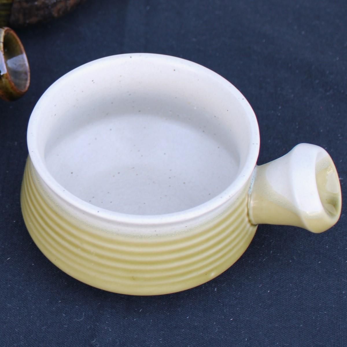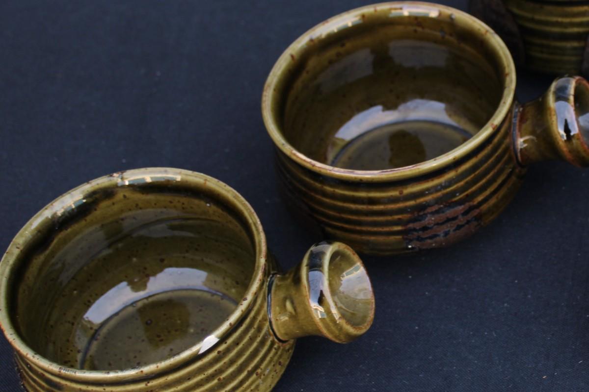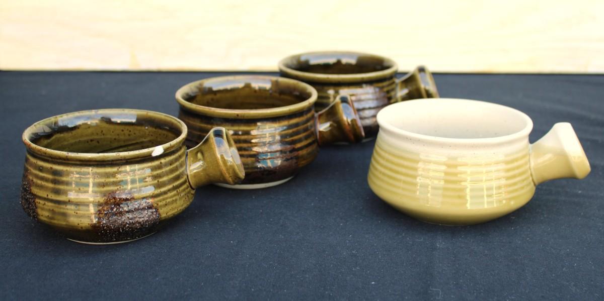 Vintage set of 4 French Onion Soup Bowls. Modern Mid Century Dishes. Genuine Stoneware. 3 matching, one a lighter color.