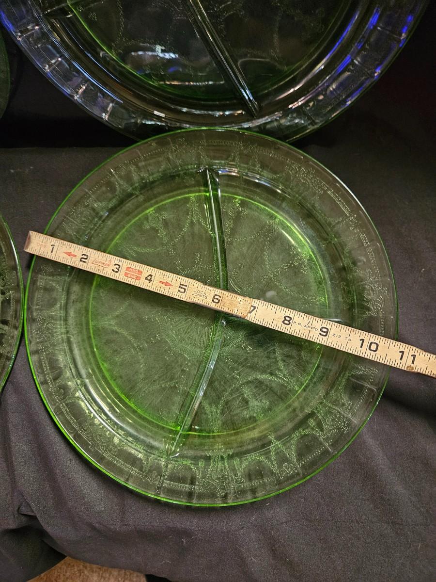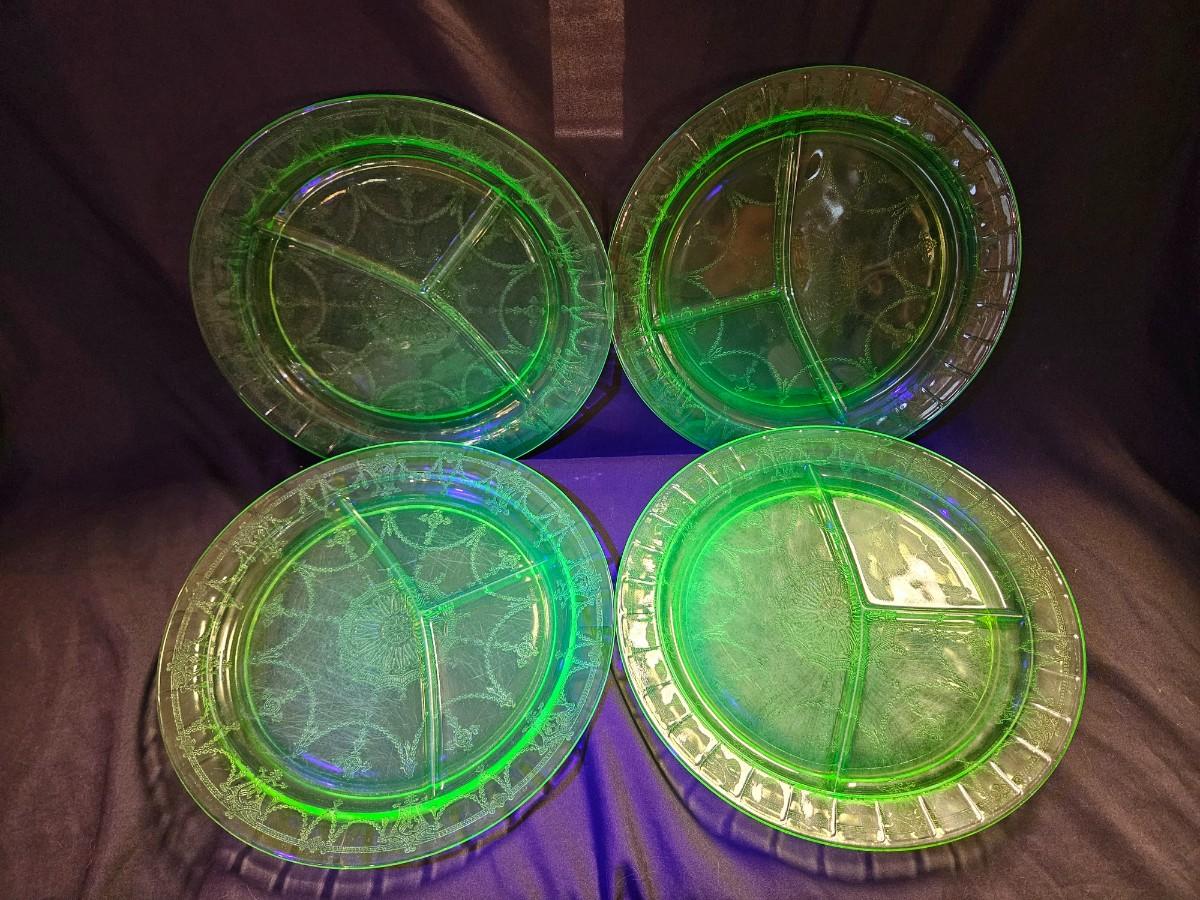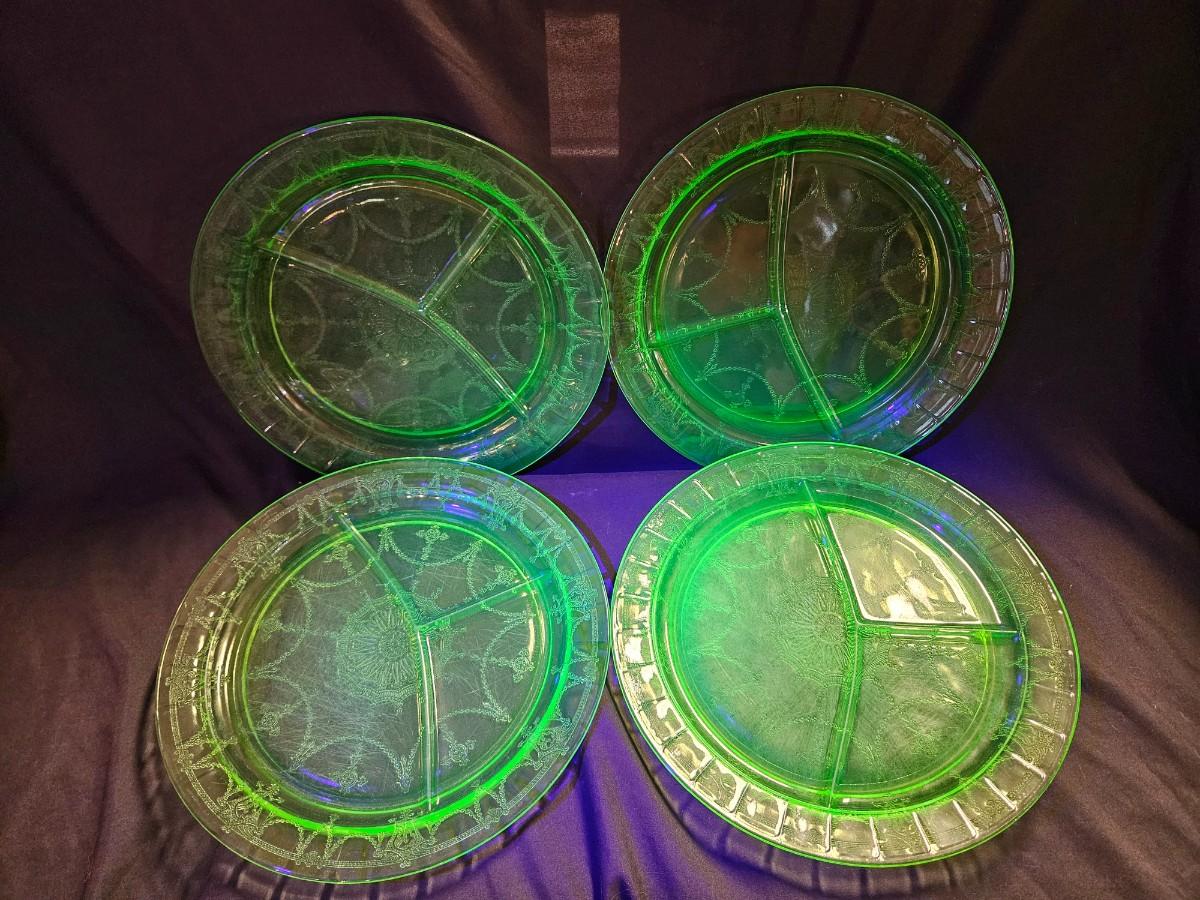 Vintage Set of 4 Uranium Green Depression Divided Plates