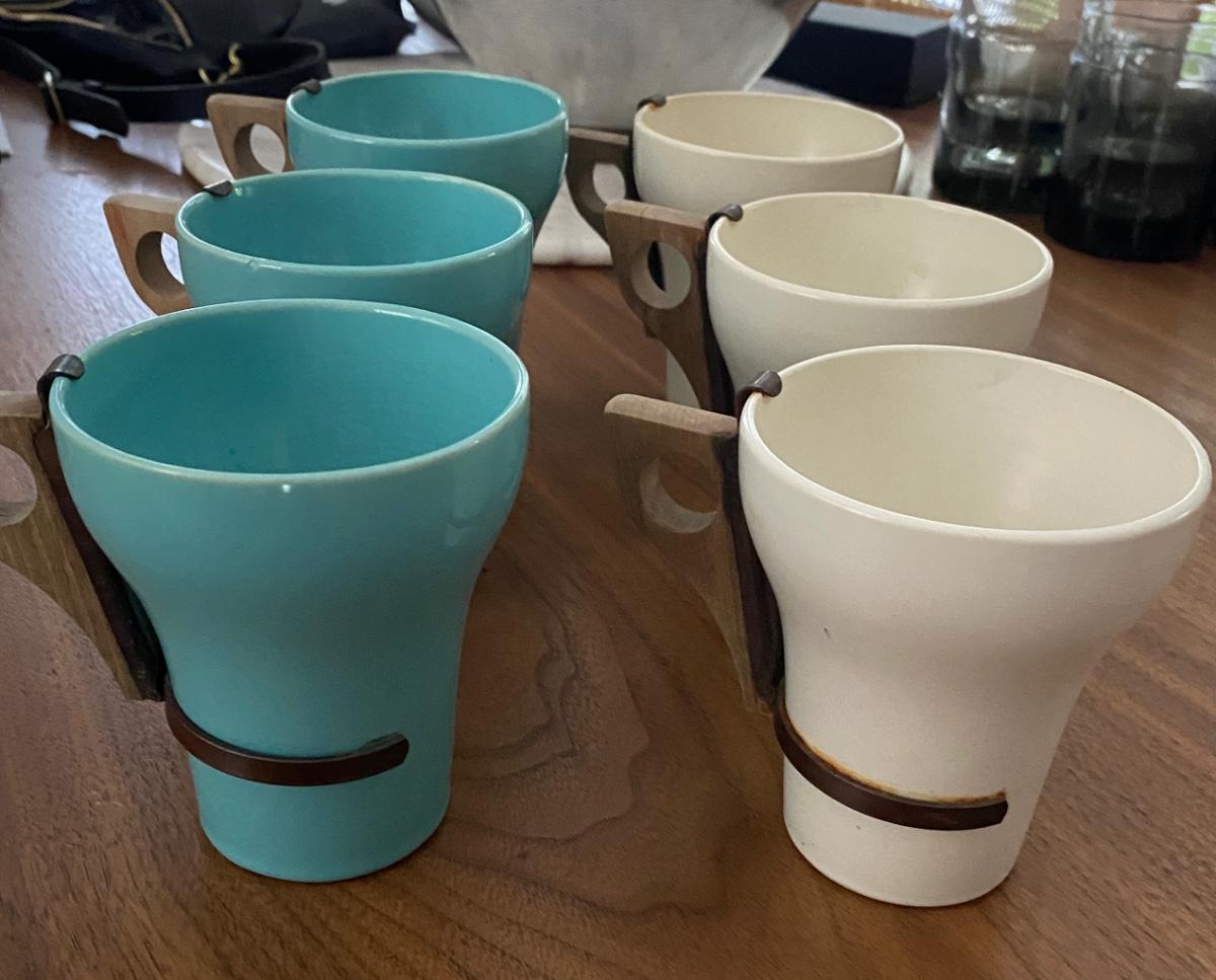 Mugs are ceramic with cooper and wood handles. 3 cream/3 blue