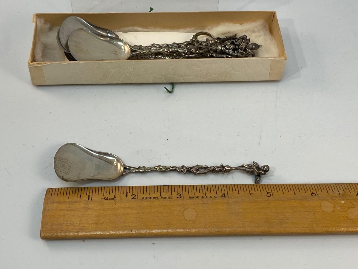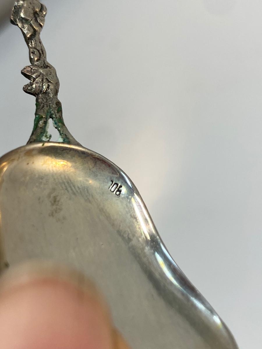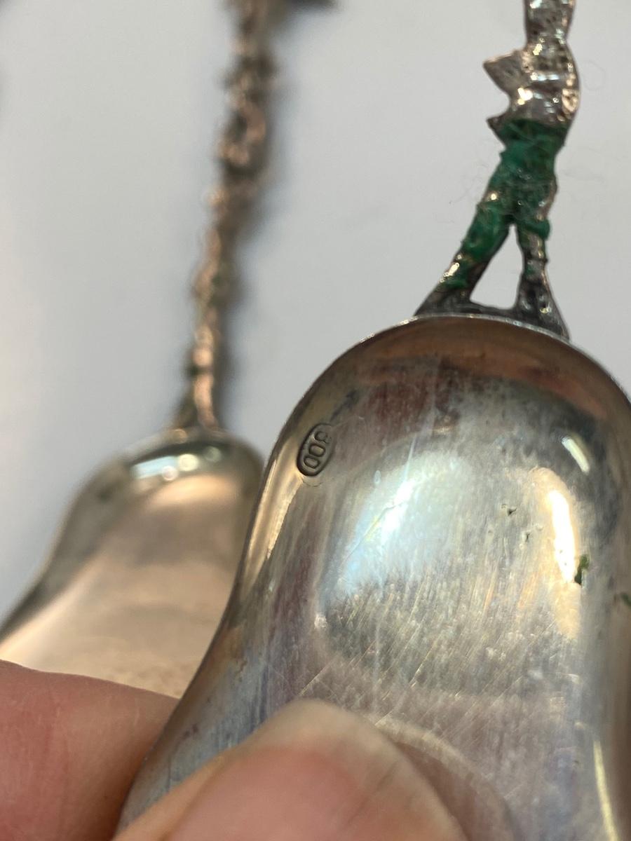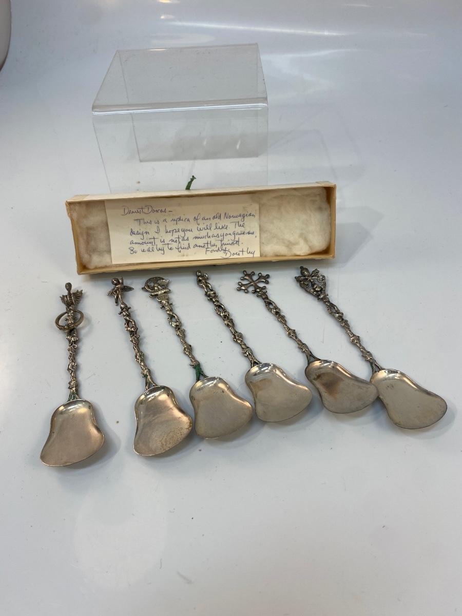 Vintage Set of 6 Silver Norwegian Collector Sugar Spoons 800 Silver Stamped. Each one has a different handle. About 6" length. There is a stamp in the flat part of each spoon that looks to be 800. Small handwritten note included in box.