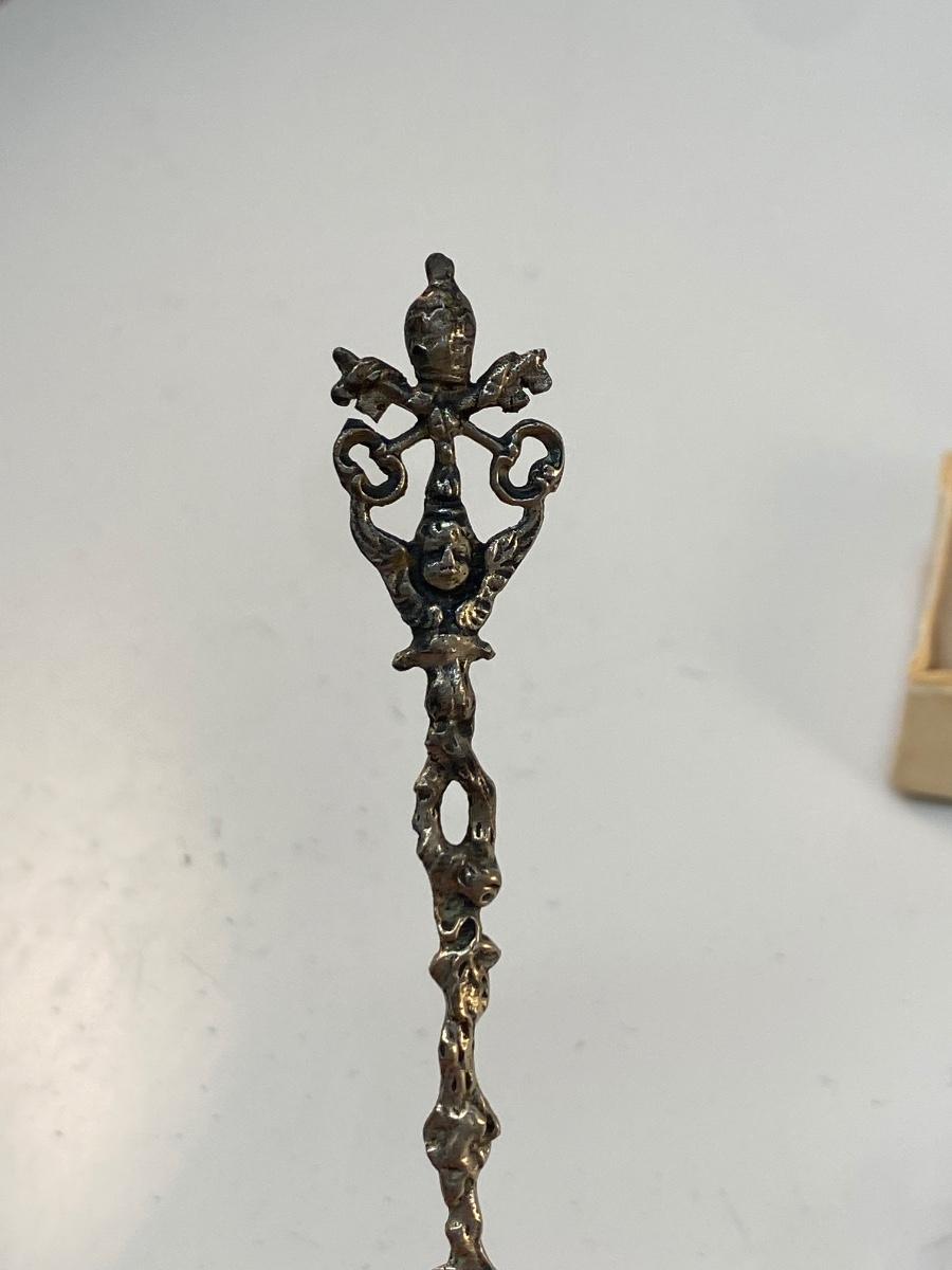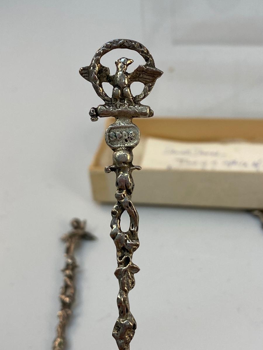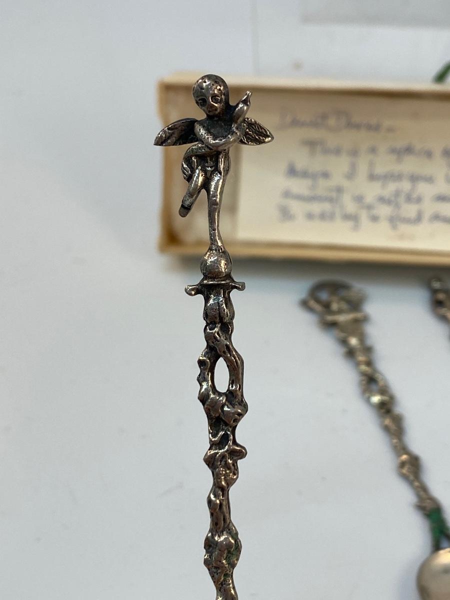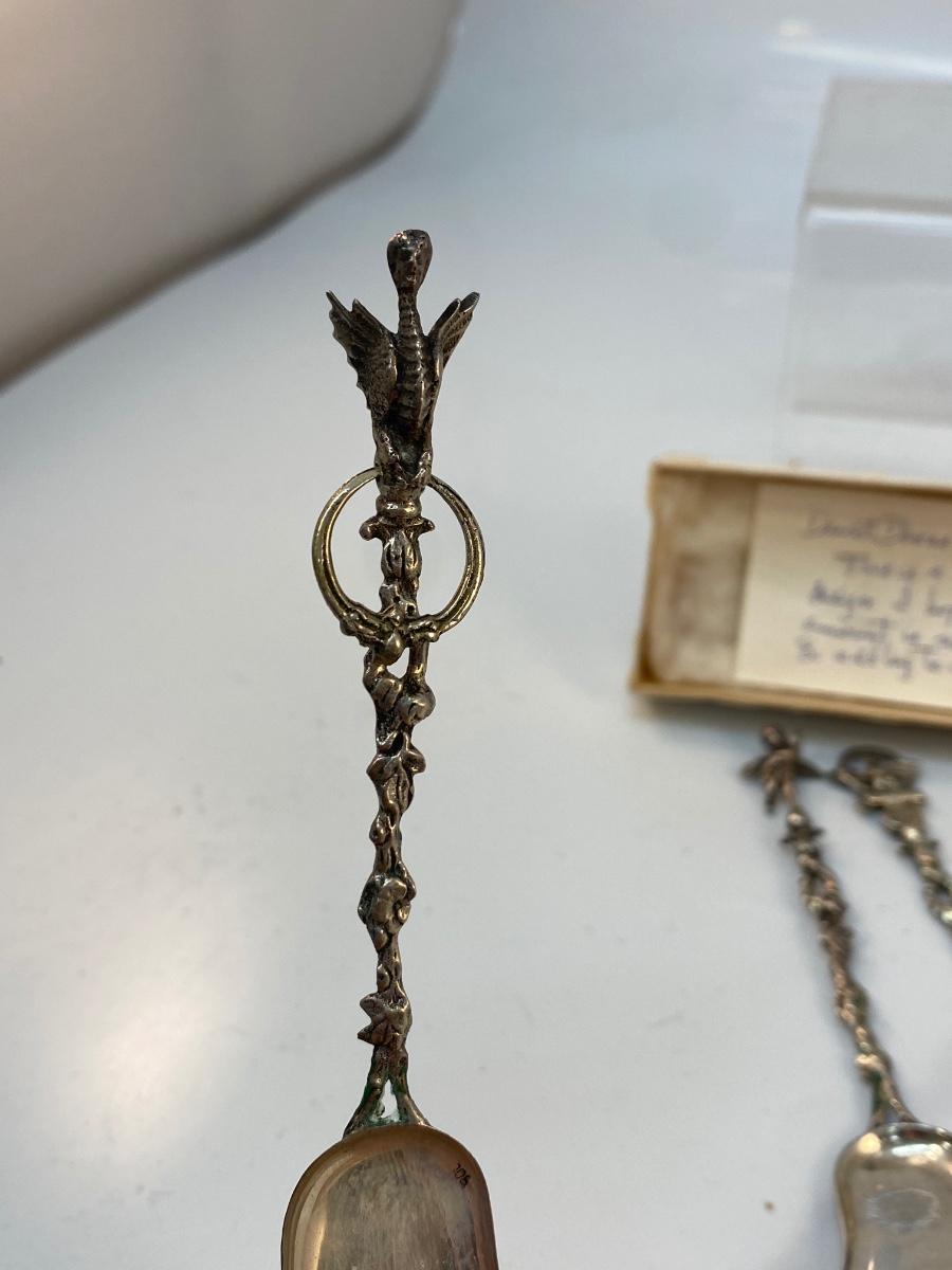 Vintage Set of 6 Silver Norwegian Collector Sugar Spoons 800 Silver Stamped. Each one has a different handle. About 6" length. There is a stamp in the flat part of each spoon that looks to be 800. Small handwritten note included in box.
