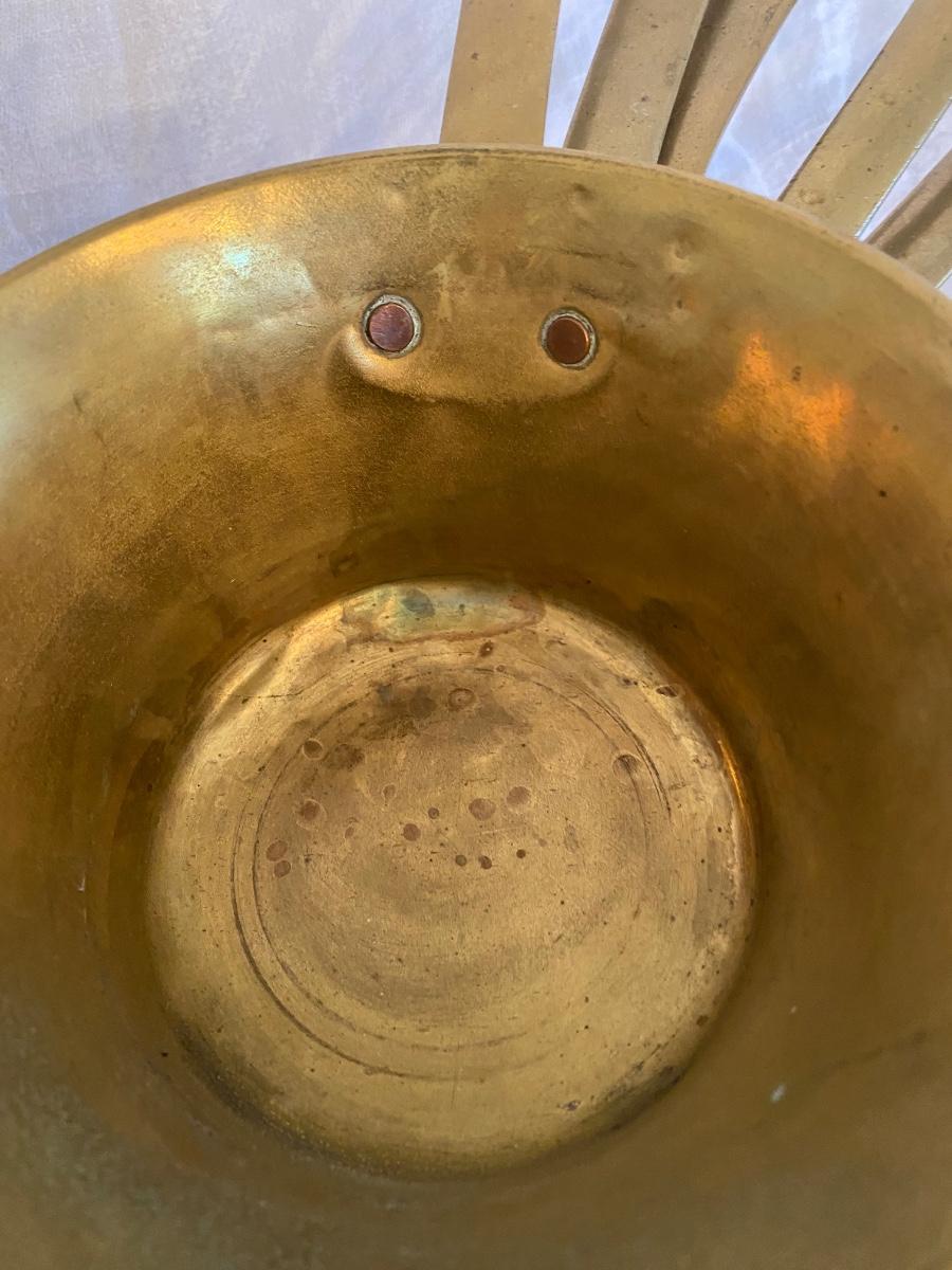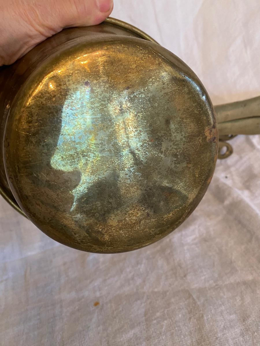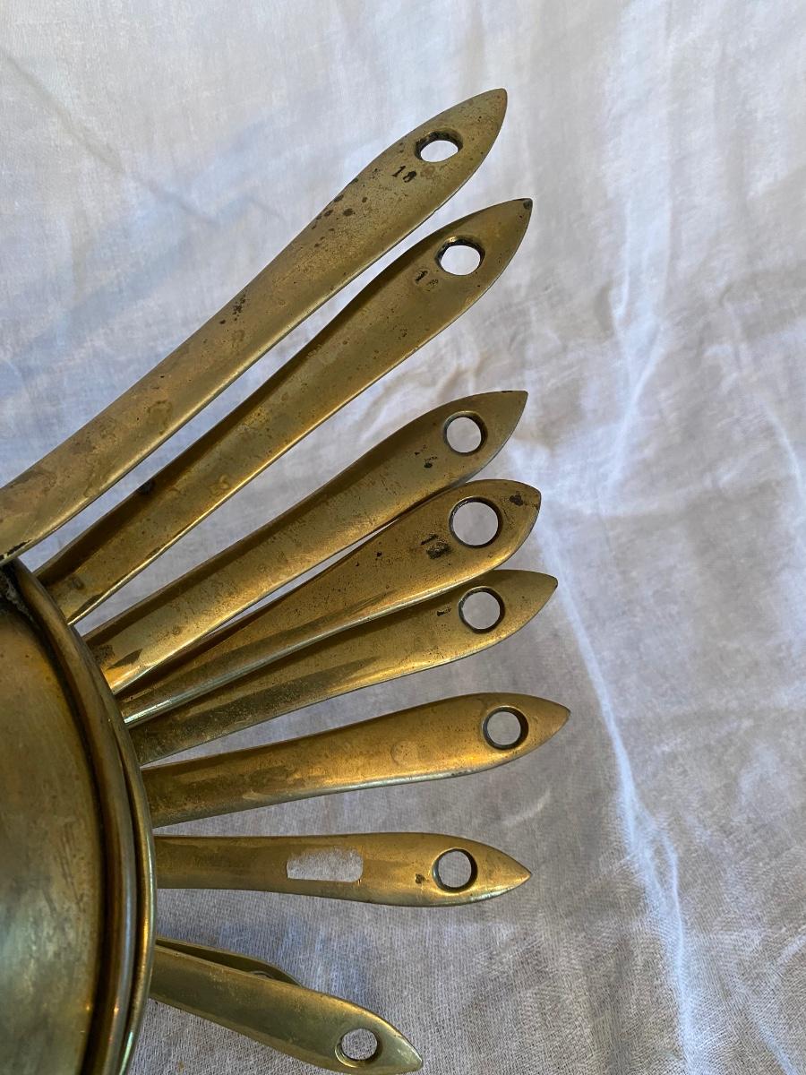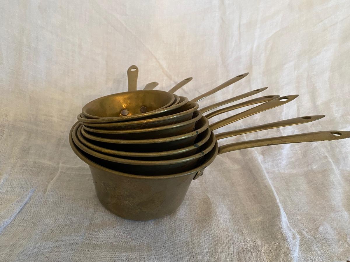 Vinatge brass set ascending size of 8 'polenta' pots, mostly used for decoration. No mark on bottom.