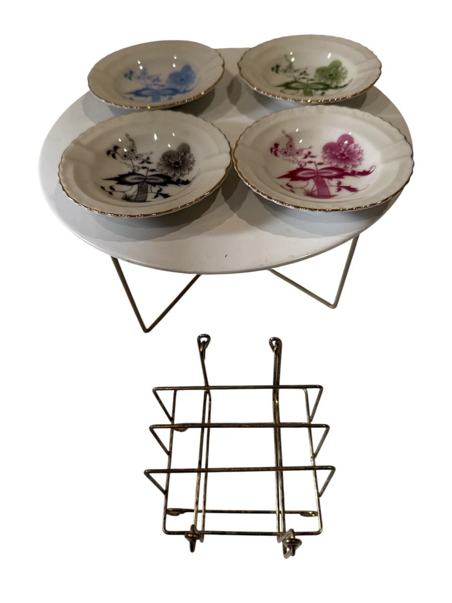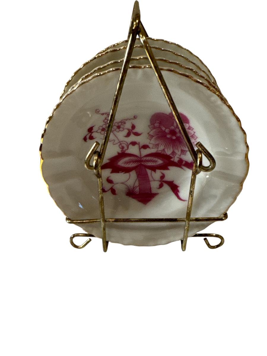 Set of 4 Porcelain Floral Dishes with Gold Rack