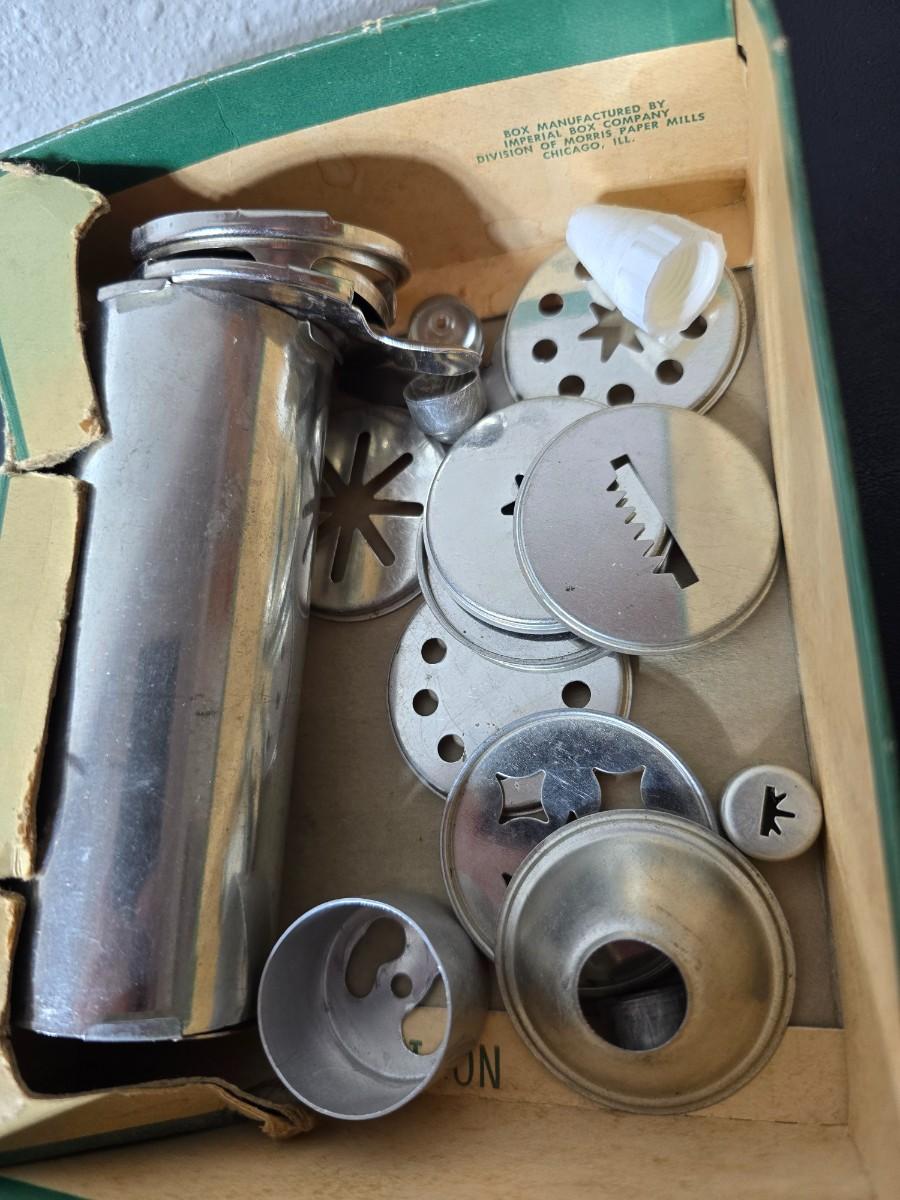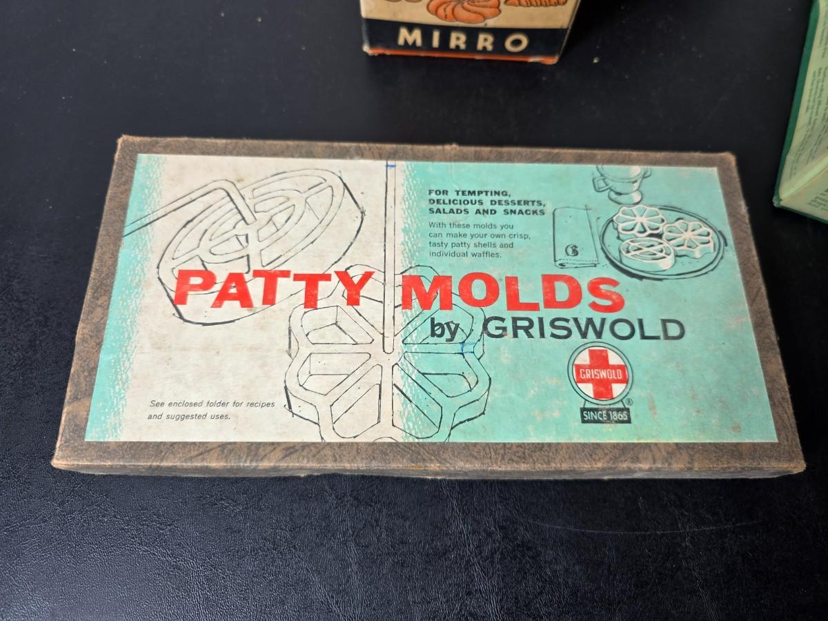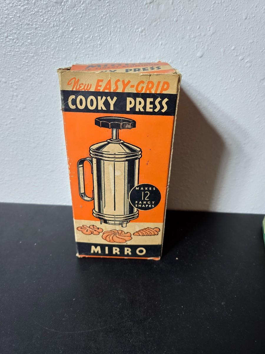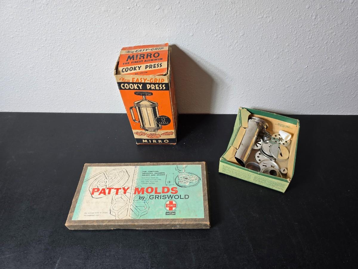 Vintage set of Griswold Patty Molds - Mirro "New Easy-Grip Cooky Press" in its original box and a vintage combination cake decorator and cookie maker set