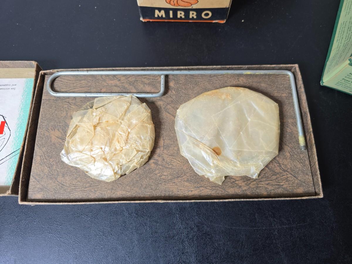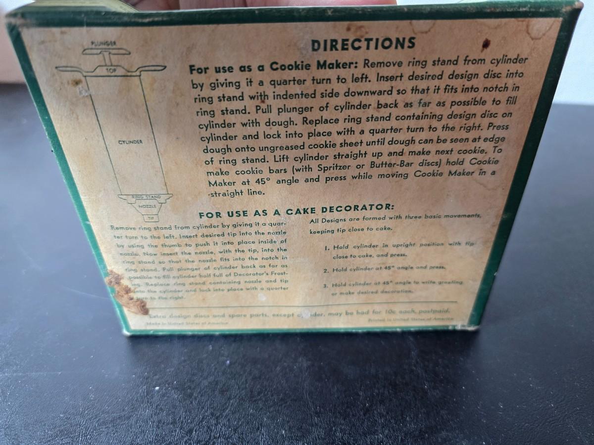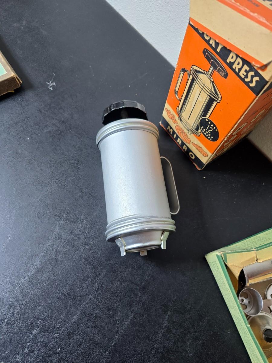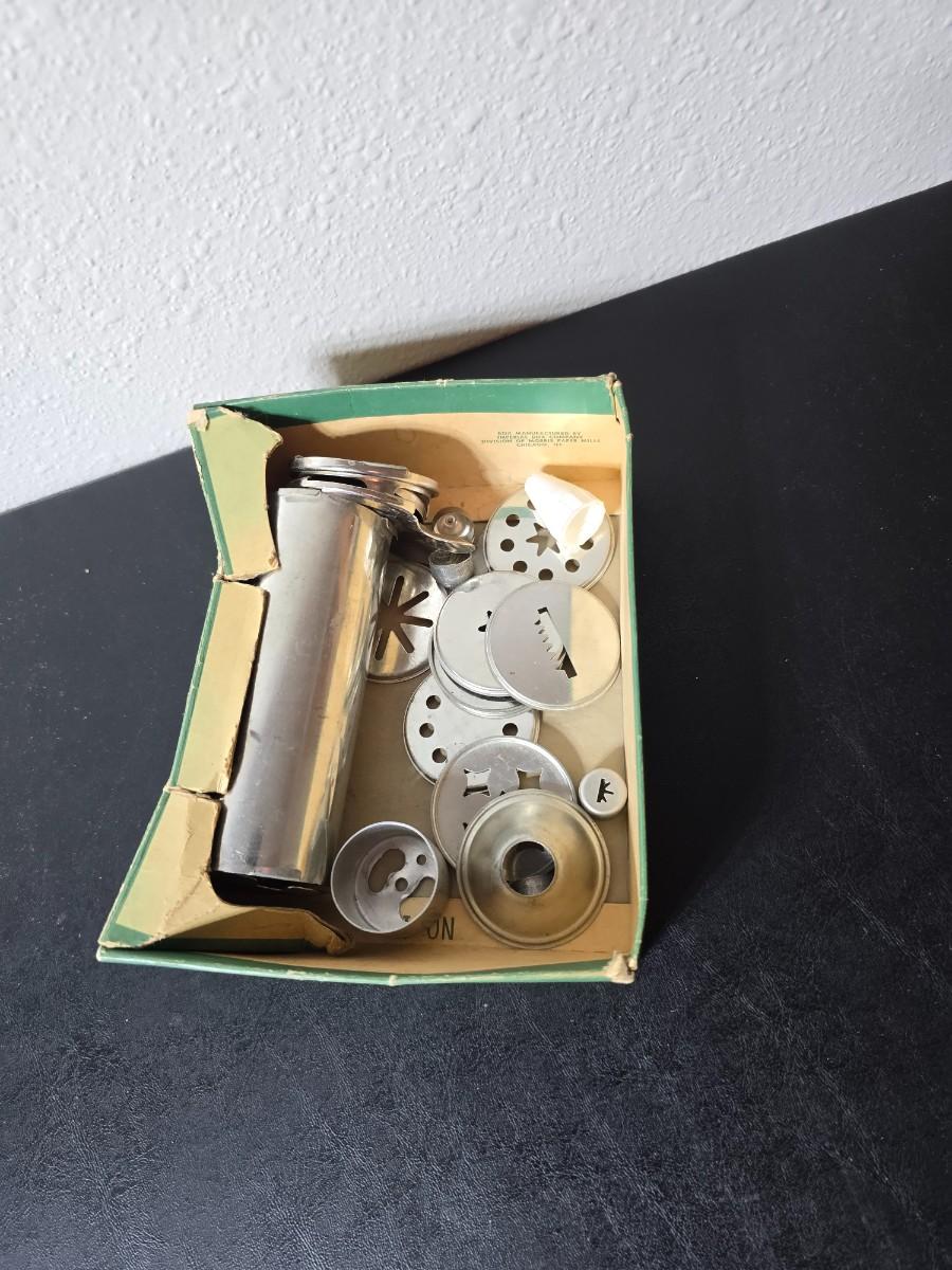 Vintage set of Griswold Patty Molds - Mirro "New Easy-Grip Cooky Press" in its original box and a vintage combination cake decorator and cookie maker set