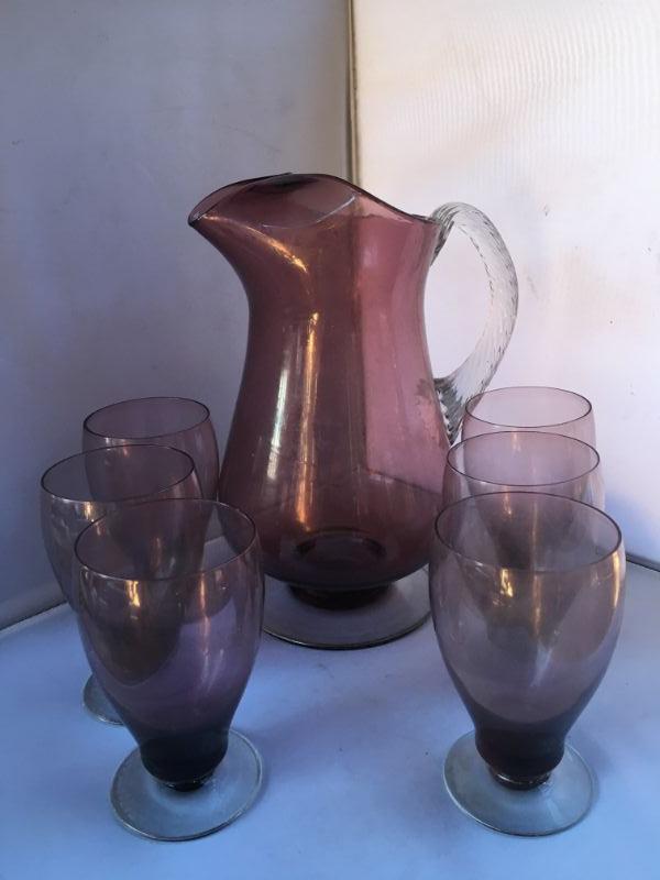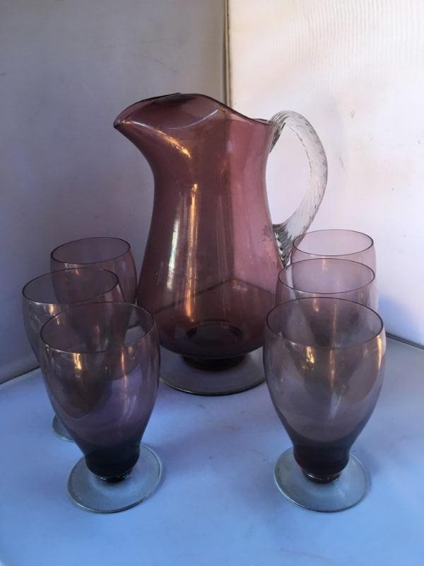 Vintage Set of Amethyst Pitcher and 6 Glasses