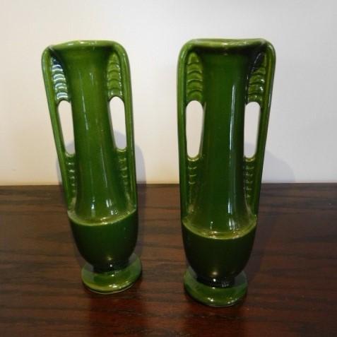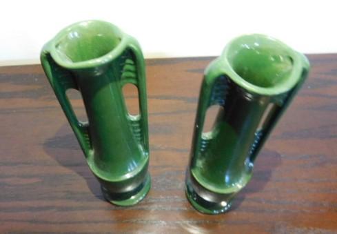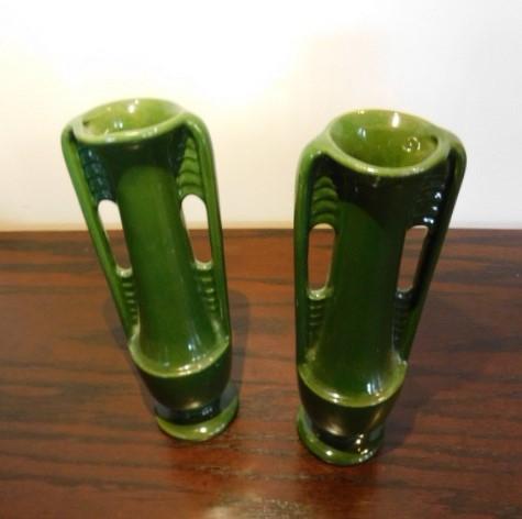 Vintage Set Shawnee Pottery Art Deco Green MCM Bud Vases 8" high gloss finish very collectible. Show little to no flaws