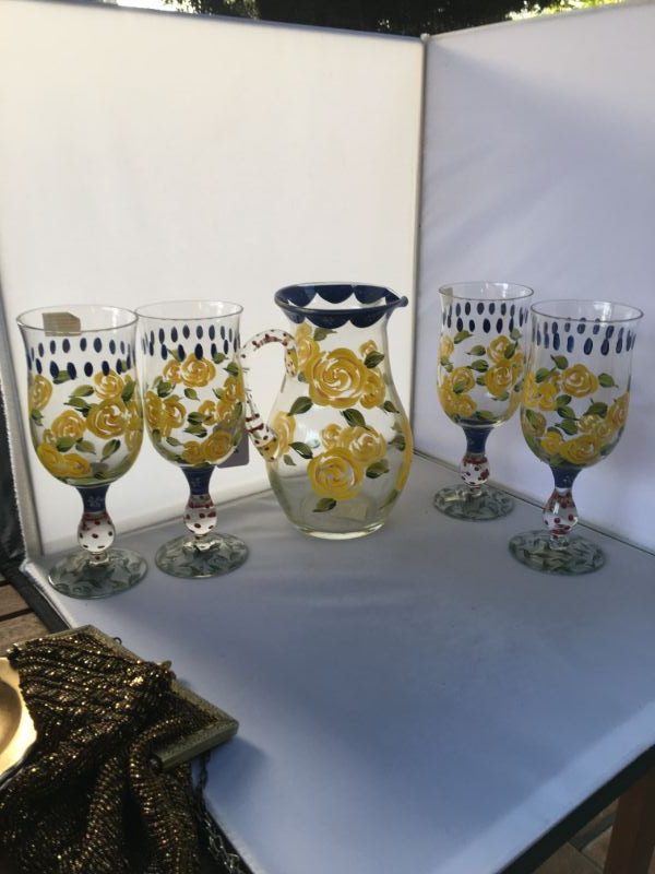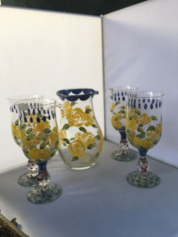 Beautiful vintage set, hand-painted; made by Tracy Porter; in as-new conditions; each glass measures 8'' height, and carafe measures 8''height