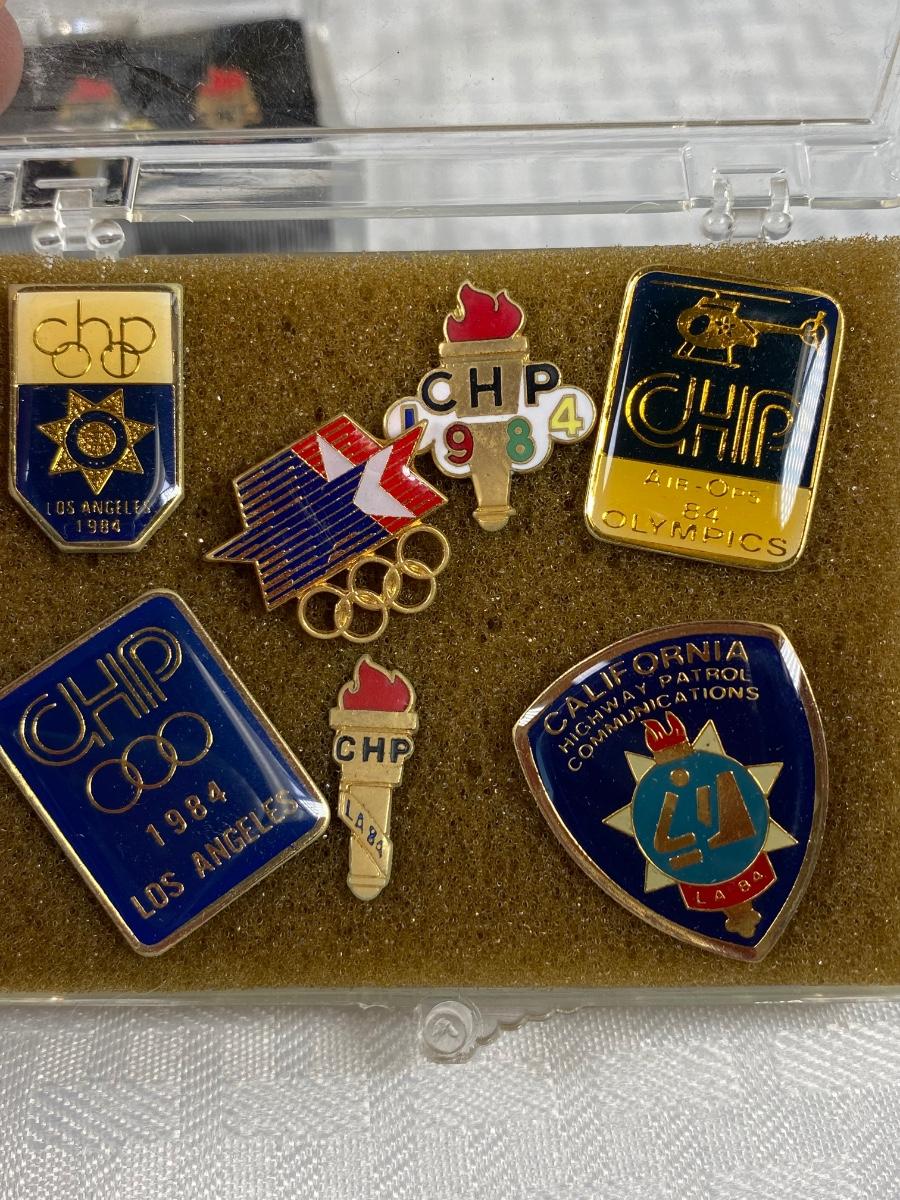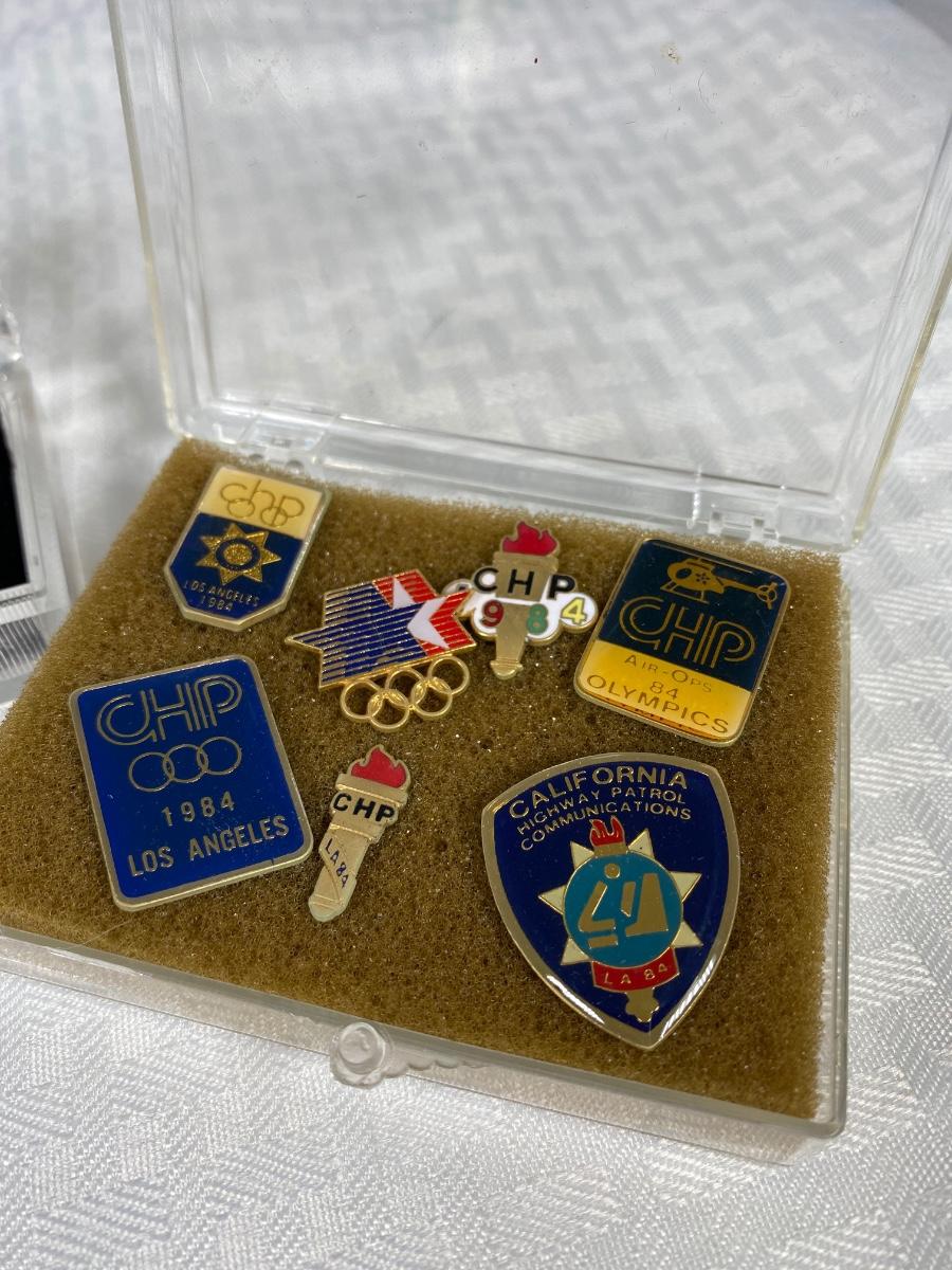 Vintage 1984 Los Angeles Olympics pin sets. Pins are specialty from the Los Angeles Police Dept. and the CHP, In original plastic cases, good condition.