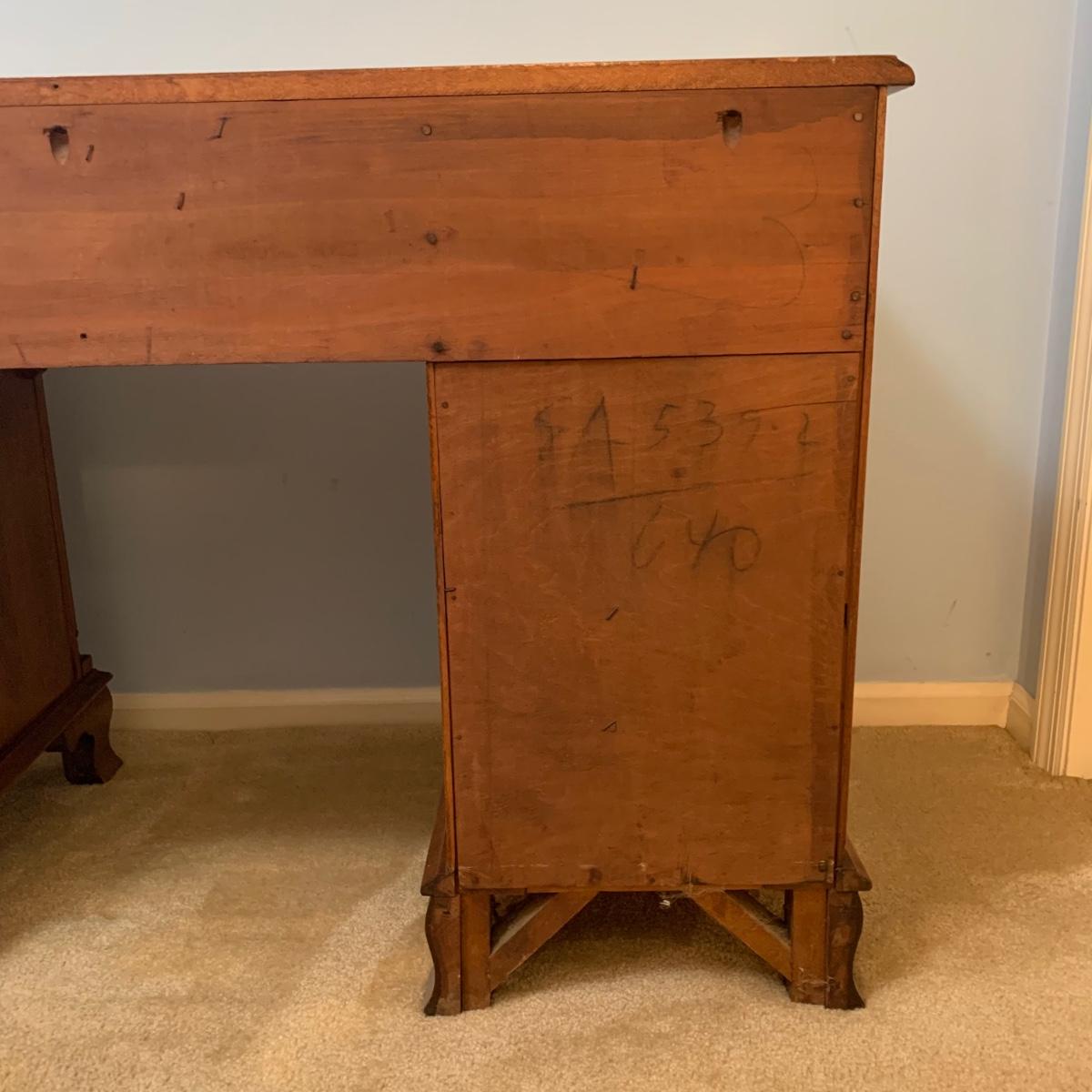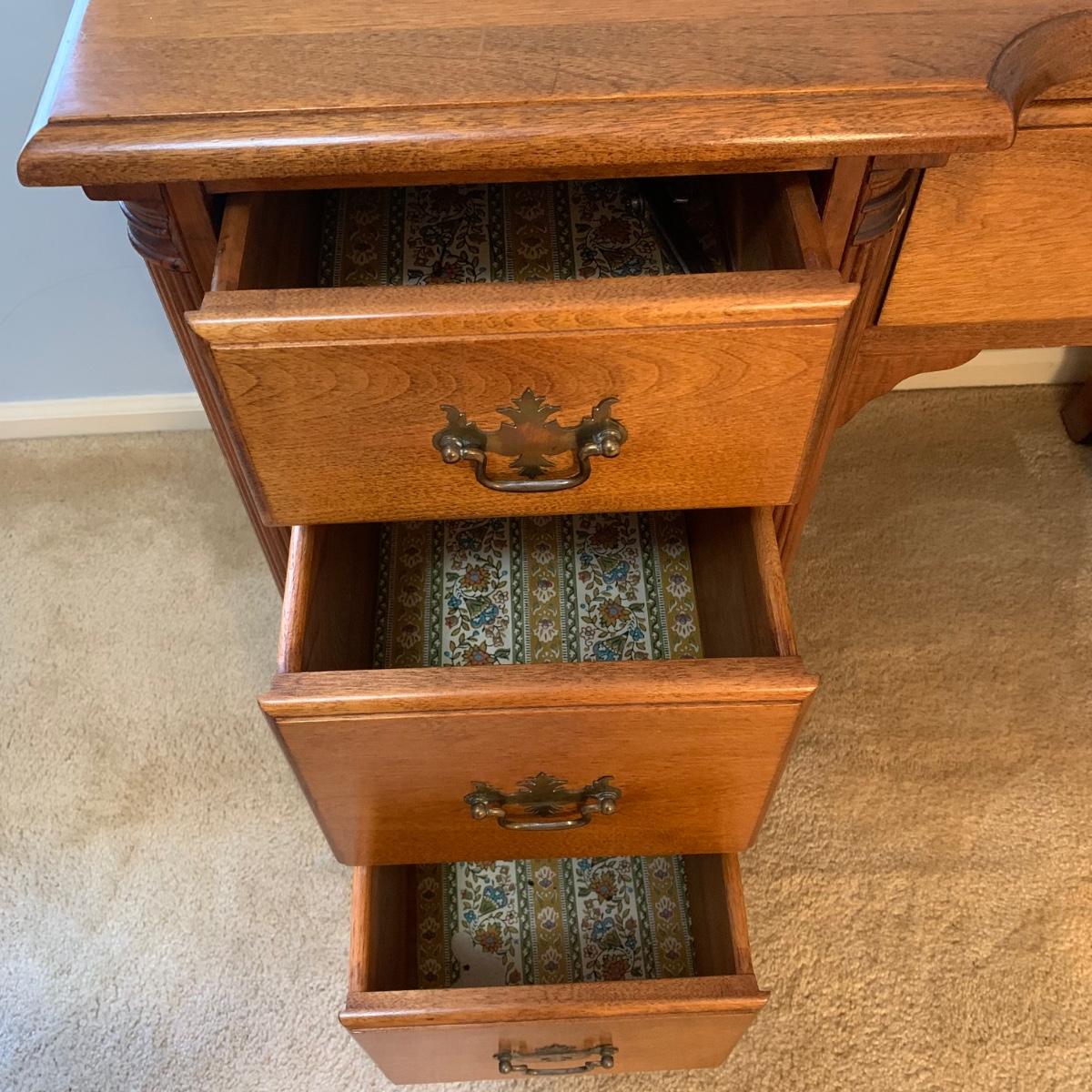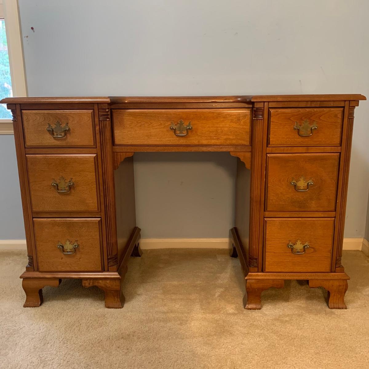 Vintage seven drawer wooden desk. Drawers are crafted using dovetail joinery, open and close with ease, and are lined with floral contact paper. Drawer pulls appear to be brass. This desk has a few scratches but is still in good condition. Please see photos for details. This item would be a beautiful addition to a home office. Desk measures 46”L x 19.25”W x 30”H.