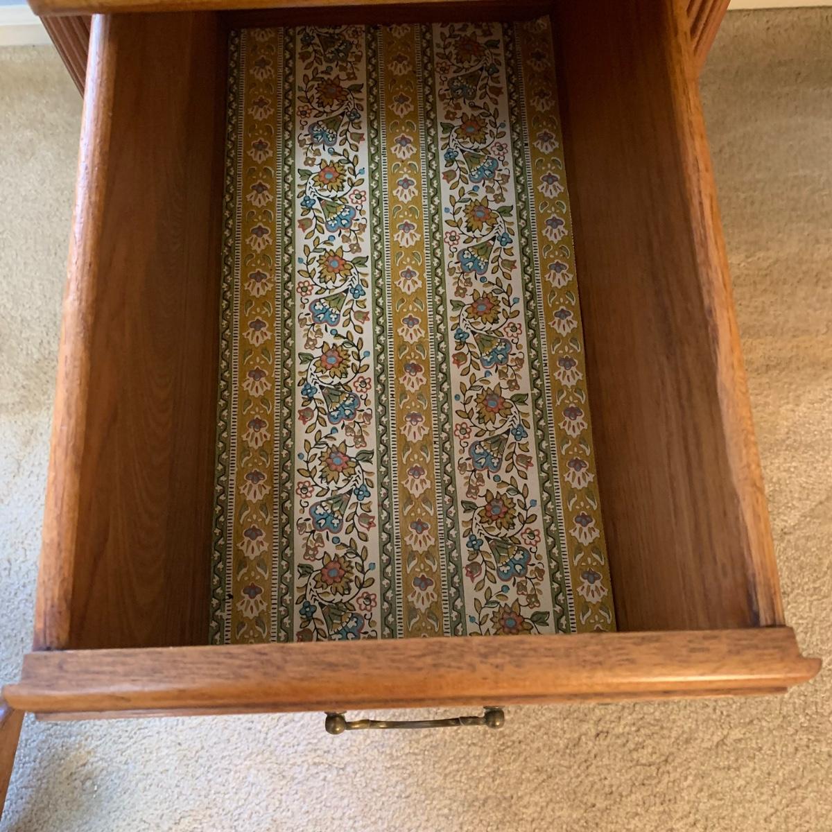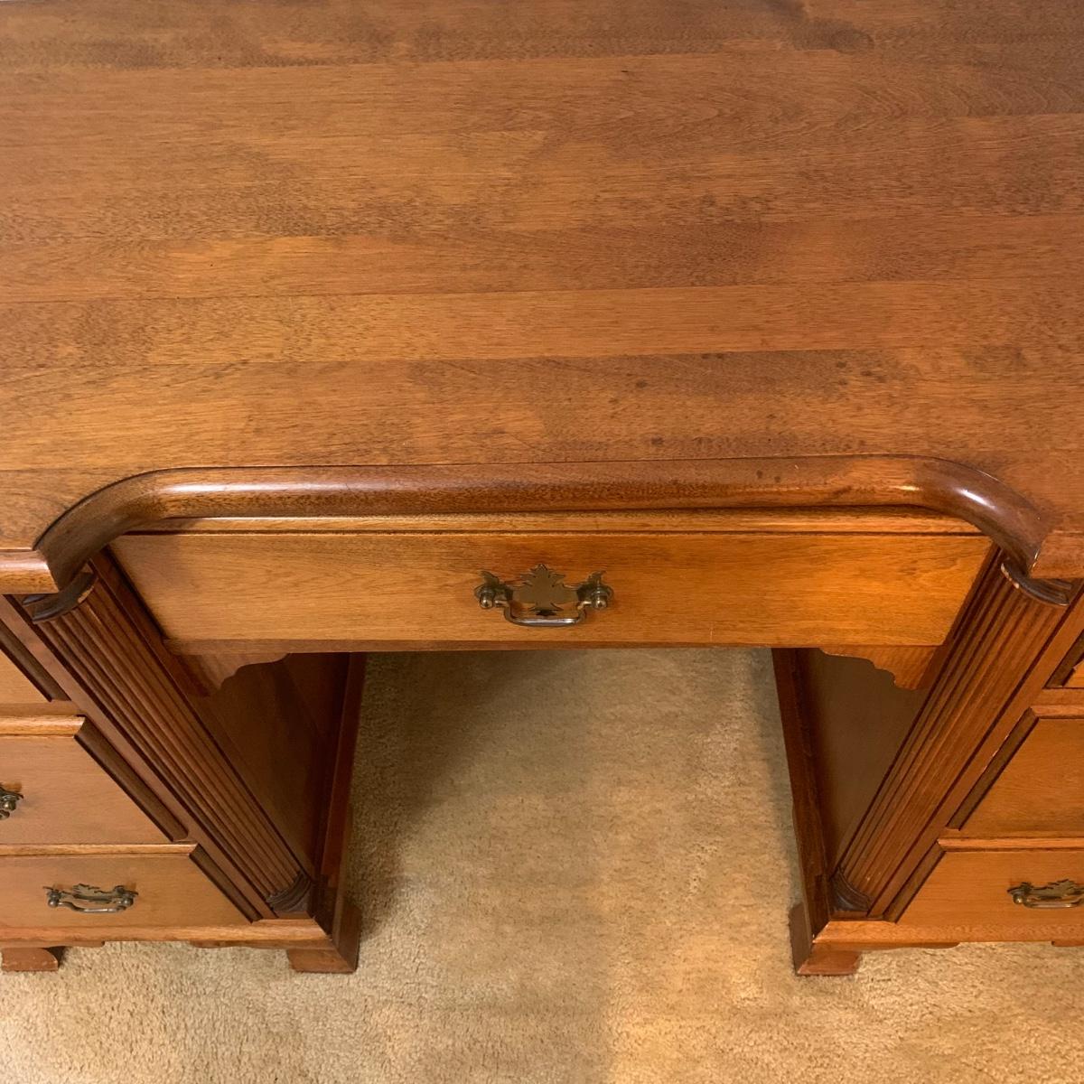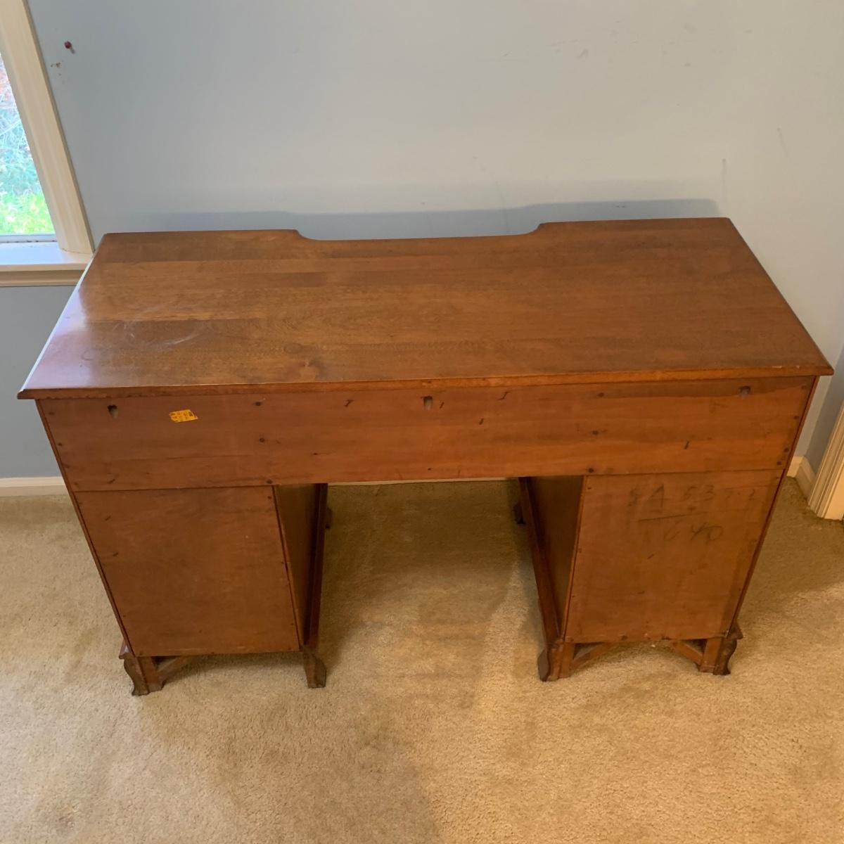 Vintage seven drawer wooden desk. Drawers are crafted using dovetail joinery, open and close with ease, and are lined with floral contact paper. Drawer pulls appear to be brass. This desk has a few scratches but is still in good condition. Please see photos for details. This item would be a beautiful addition to a home office. Desk measures 46”L x 19.25”W x 30”H.