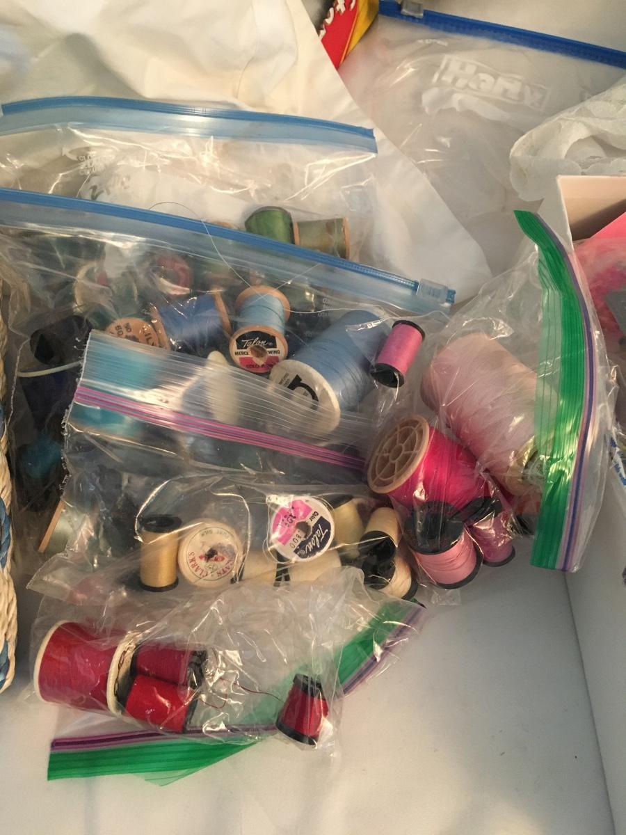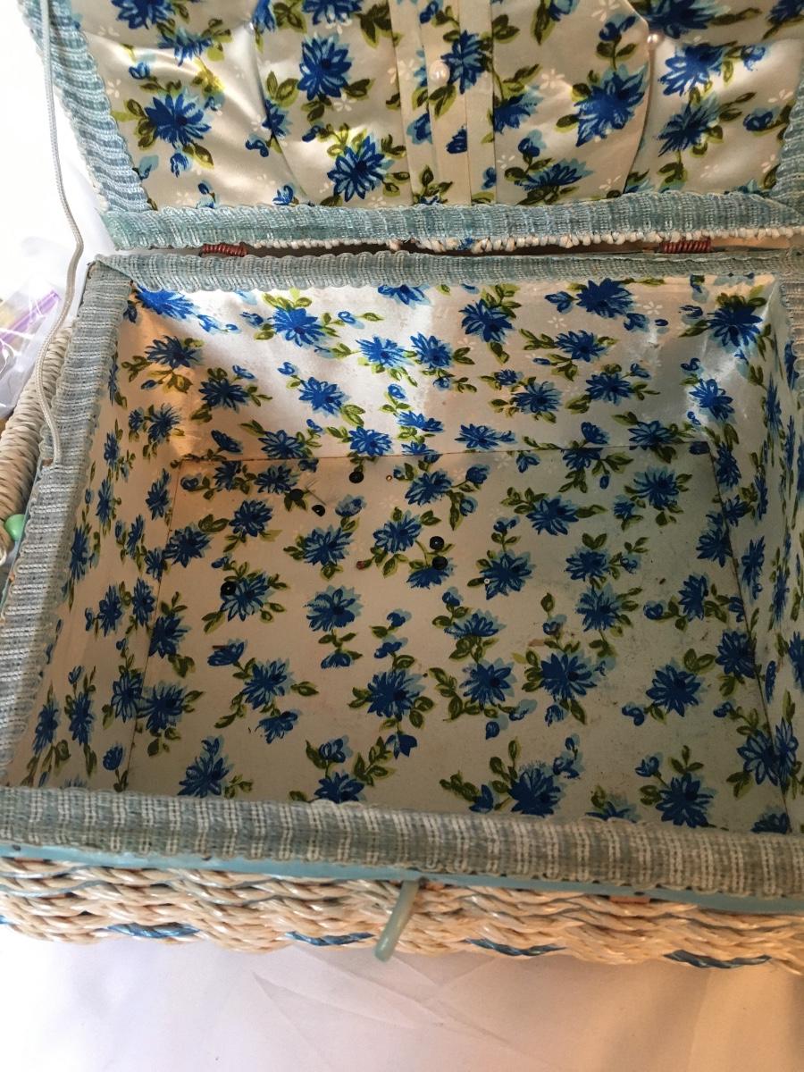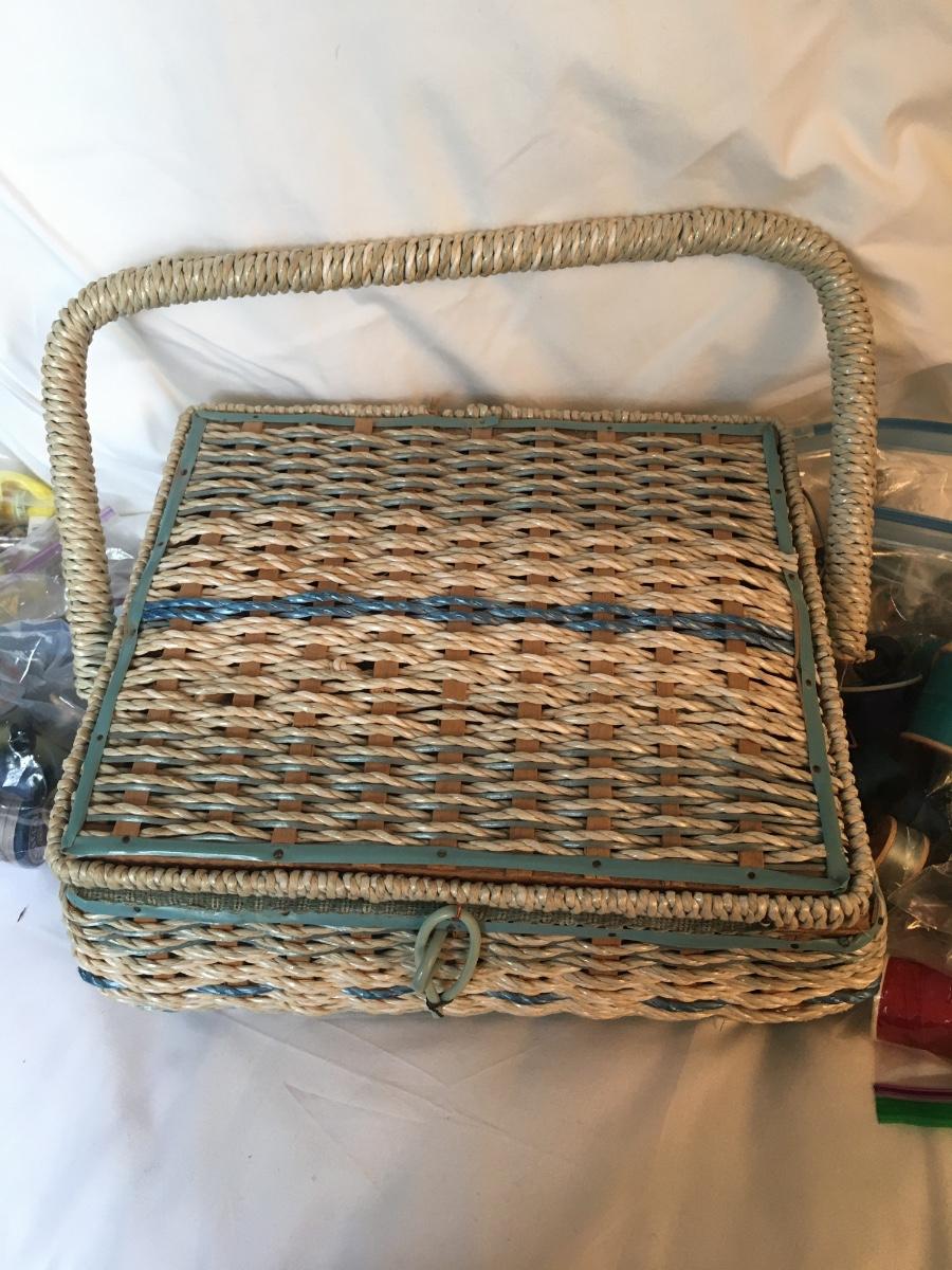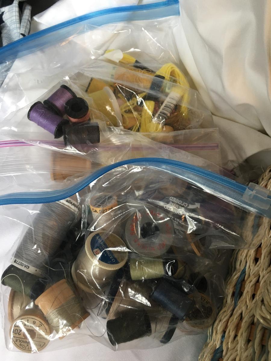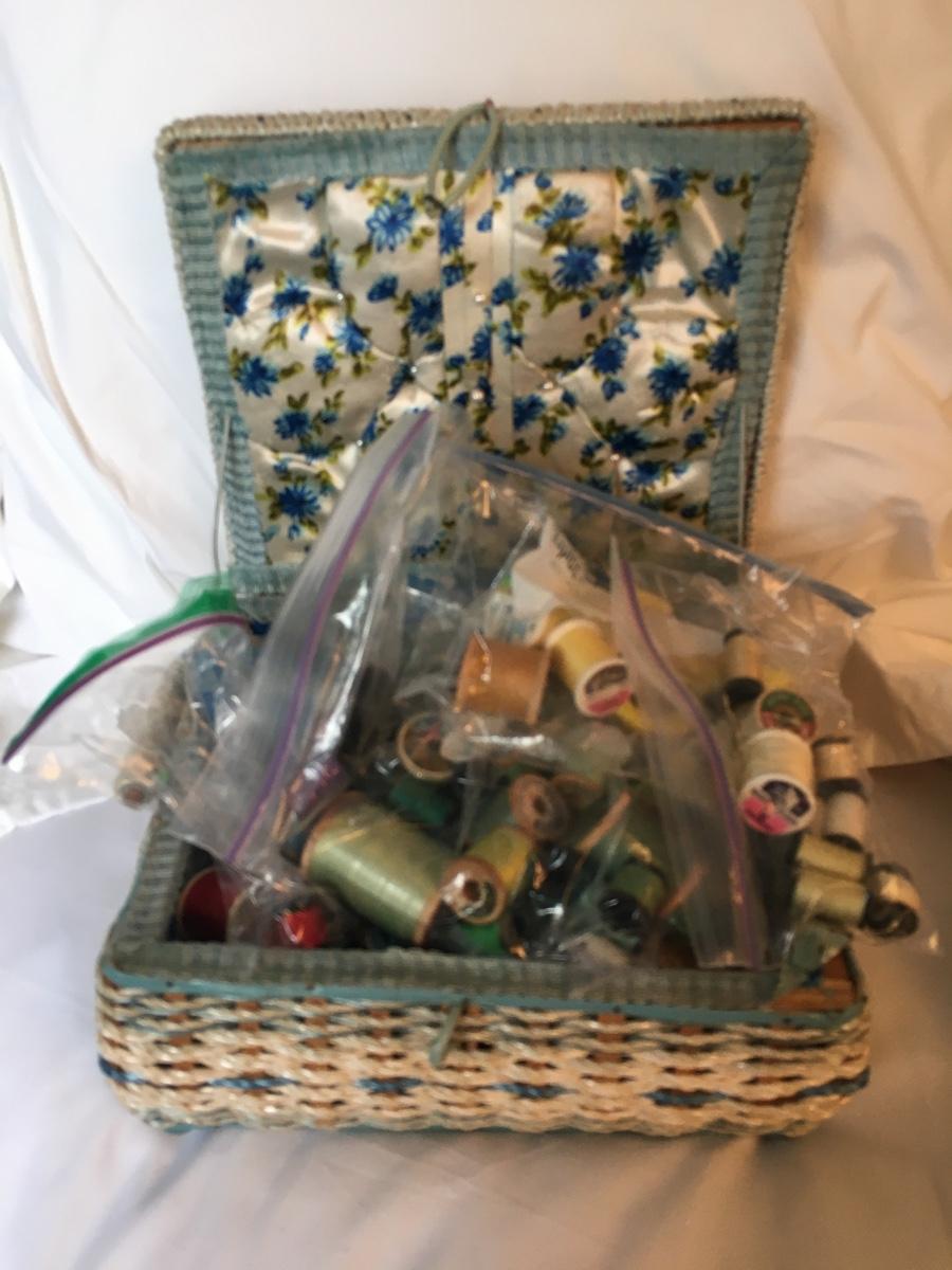 SWeet little sewing basket with at least 20 spools of thread. Quilted lining.