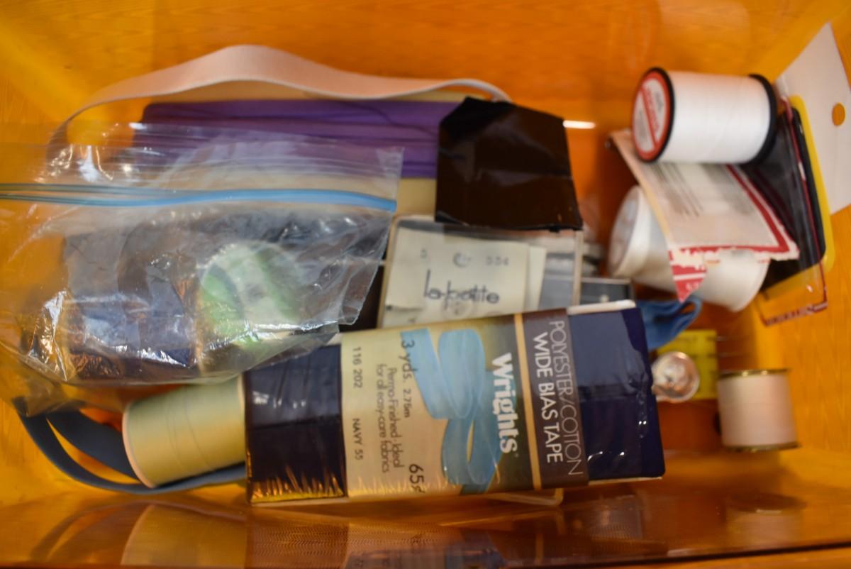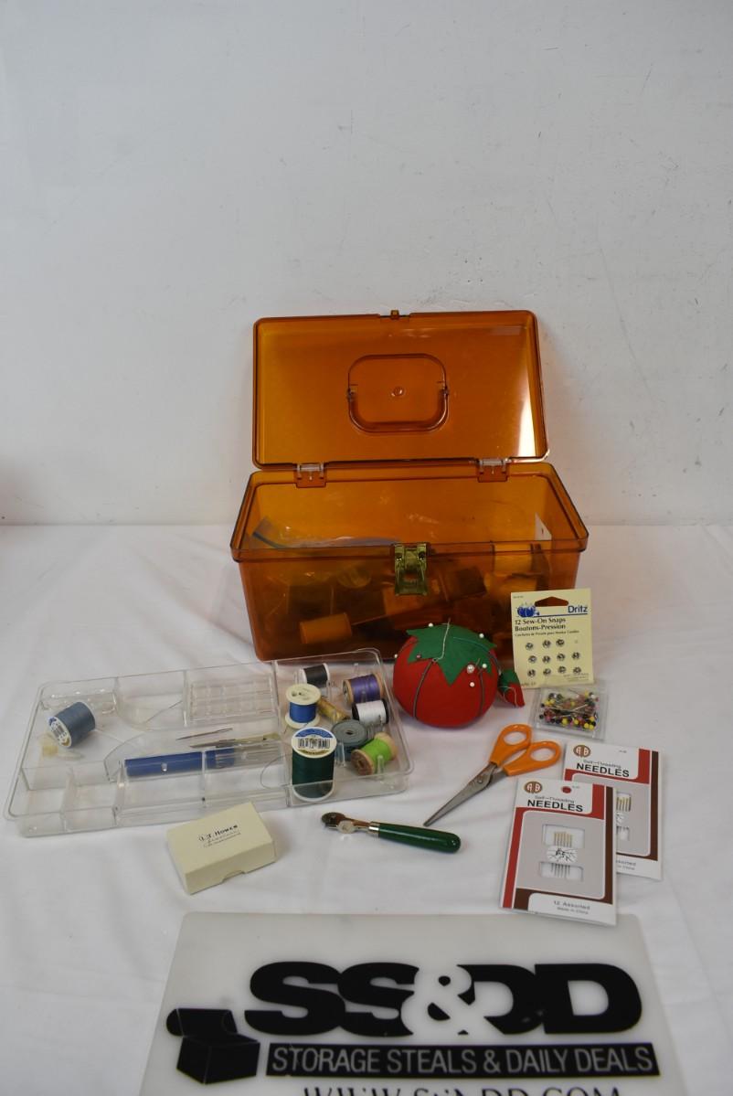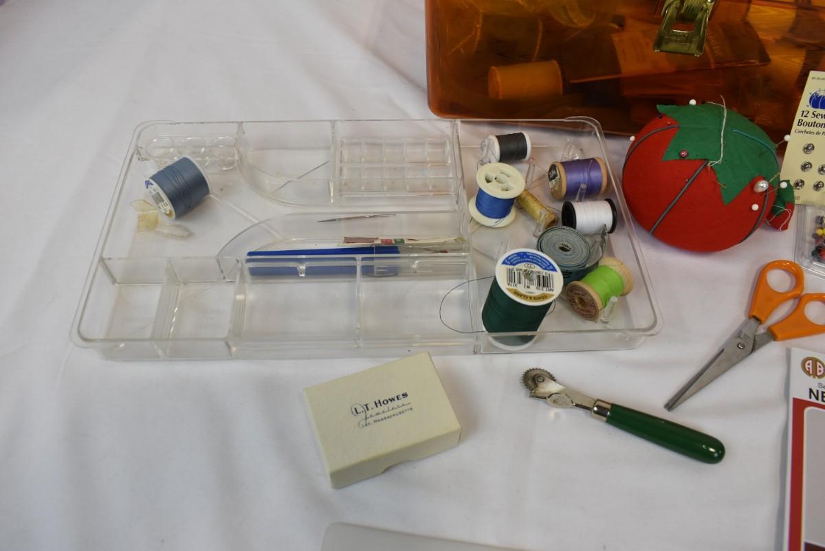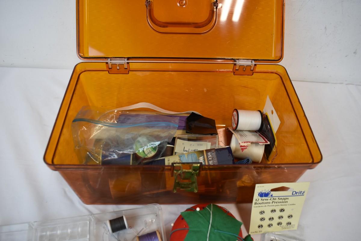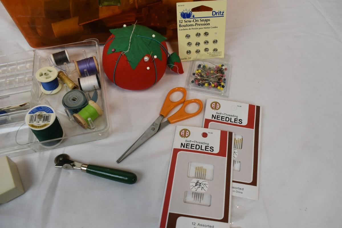 Vintage Sewing Box w/ Sewing Supplies Thread Needles, Pin Cushion