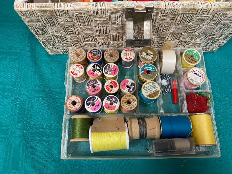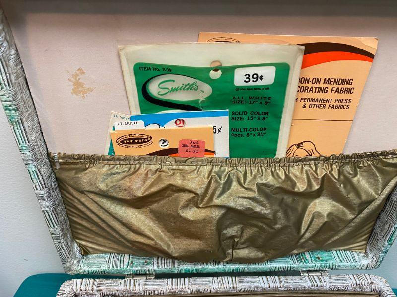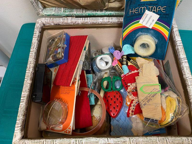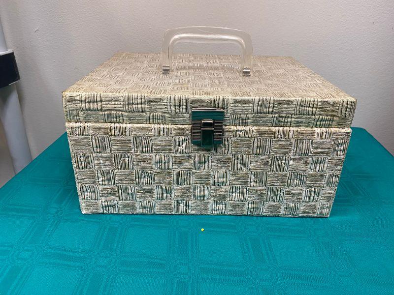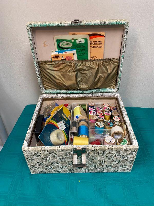 Vintage vinyl covered sewing box full of sewing accessories. Comes with everything pictured. The small lip on the tray is broken allowing the tray to fall into the box. Latches closed just fine.