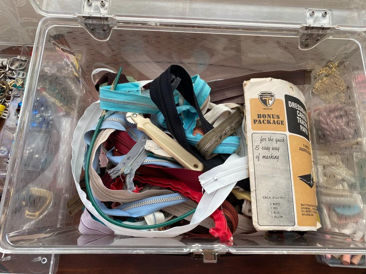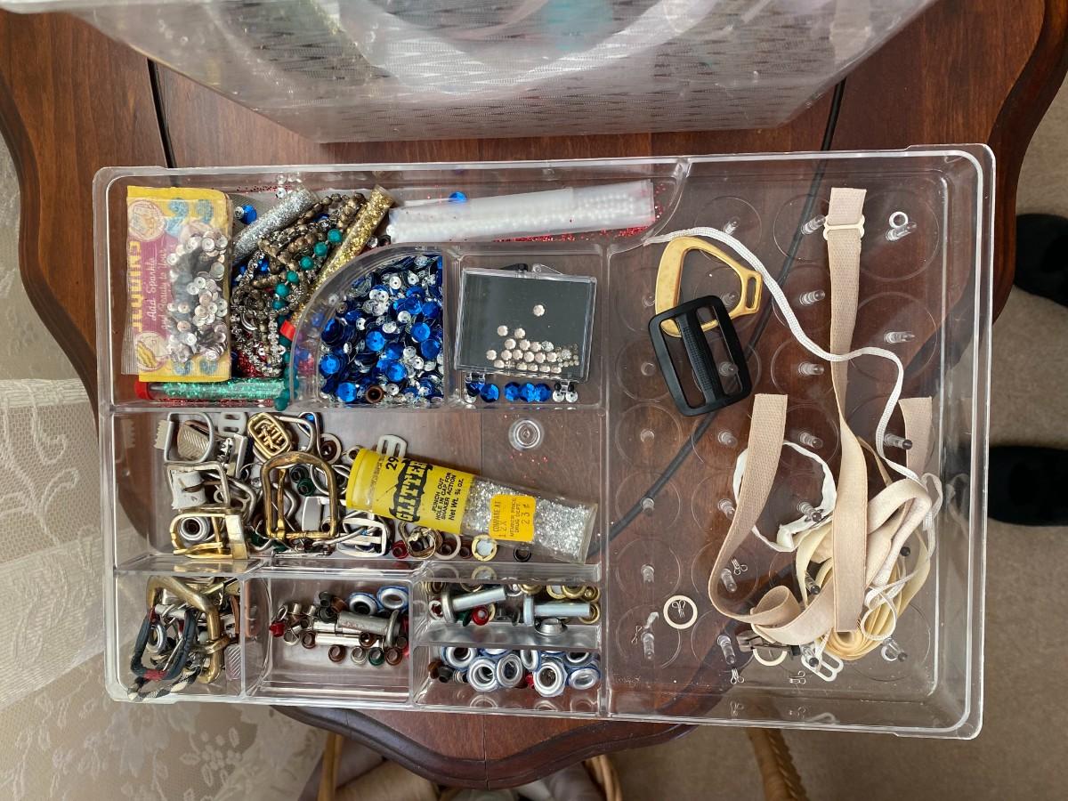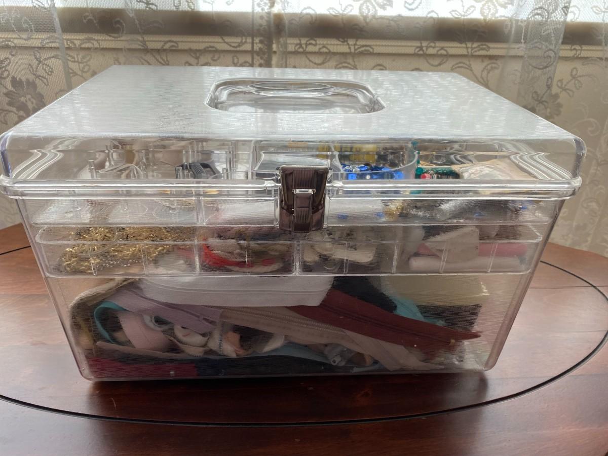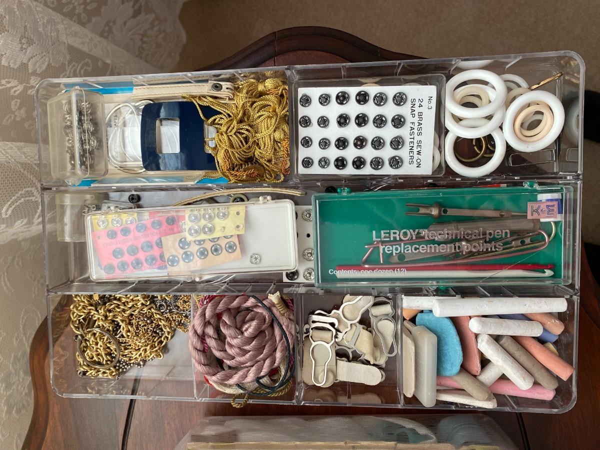 Vintage sewing box with two removable trays. Includes all of the notions pictured here. Very good condition. Approx. 14" W x 8-1/2" H x 8-1/2" D