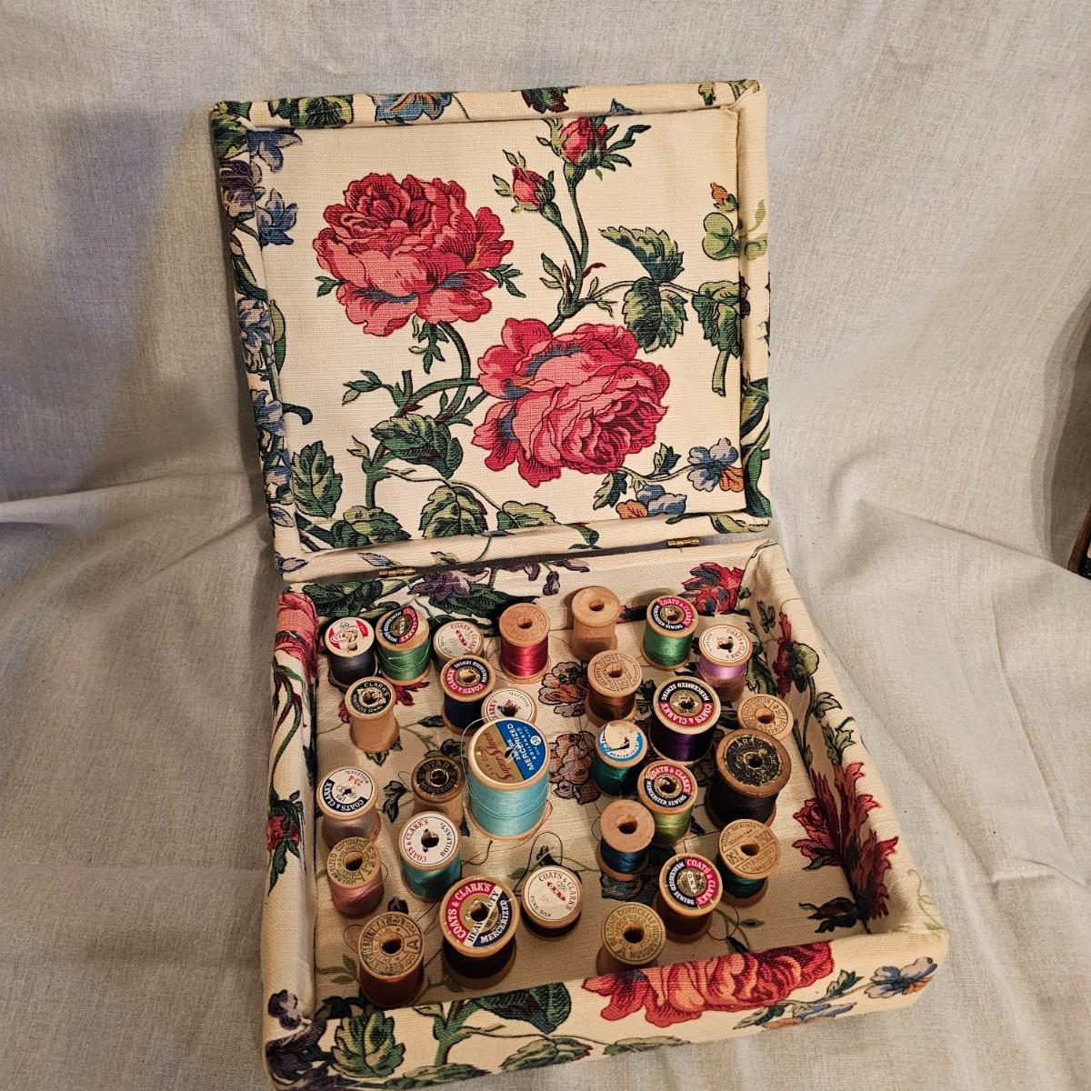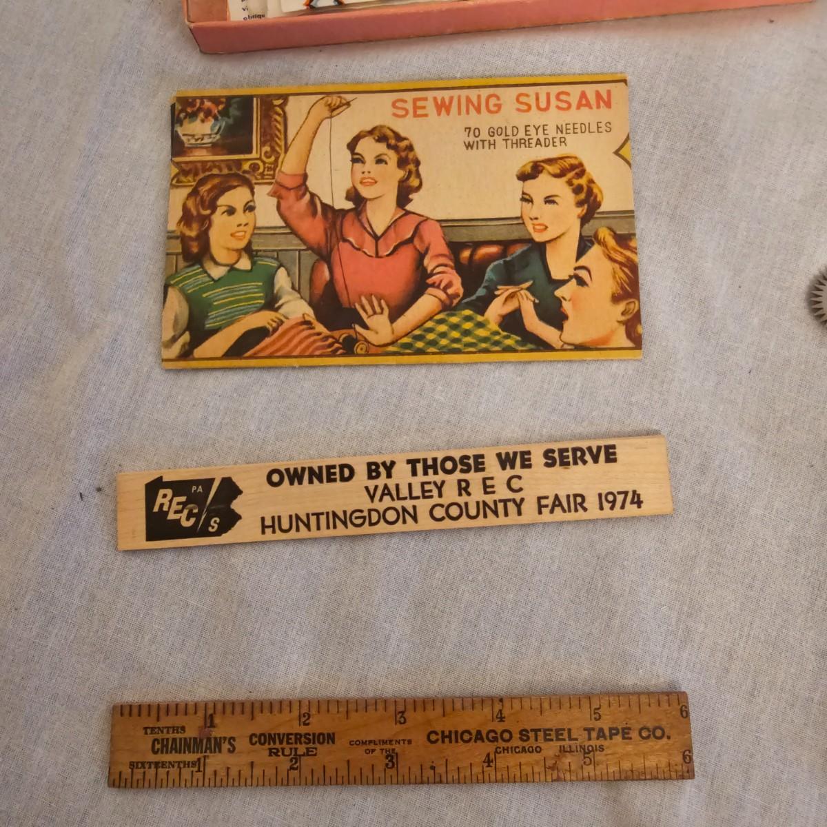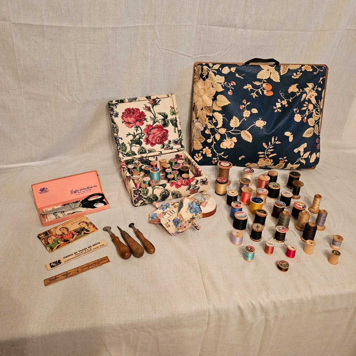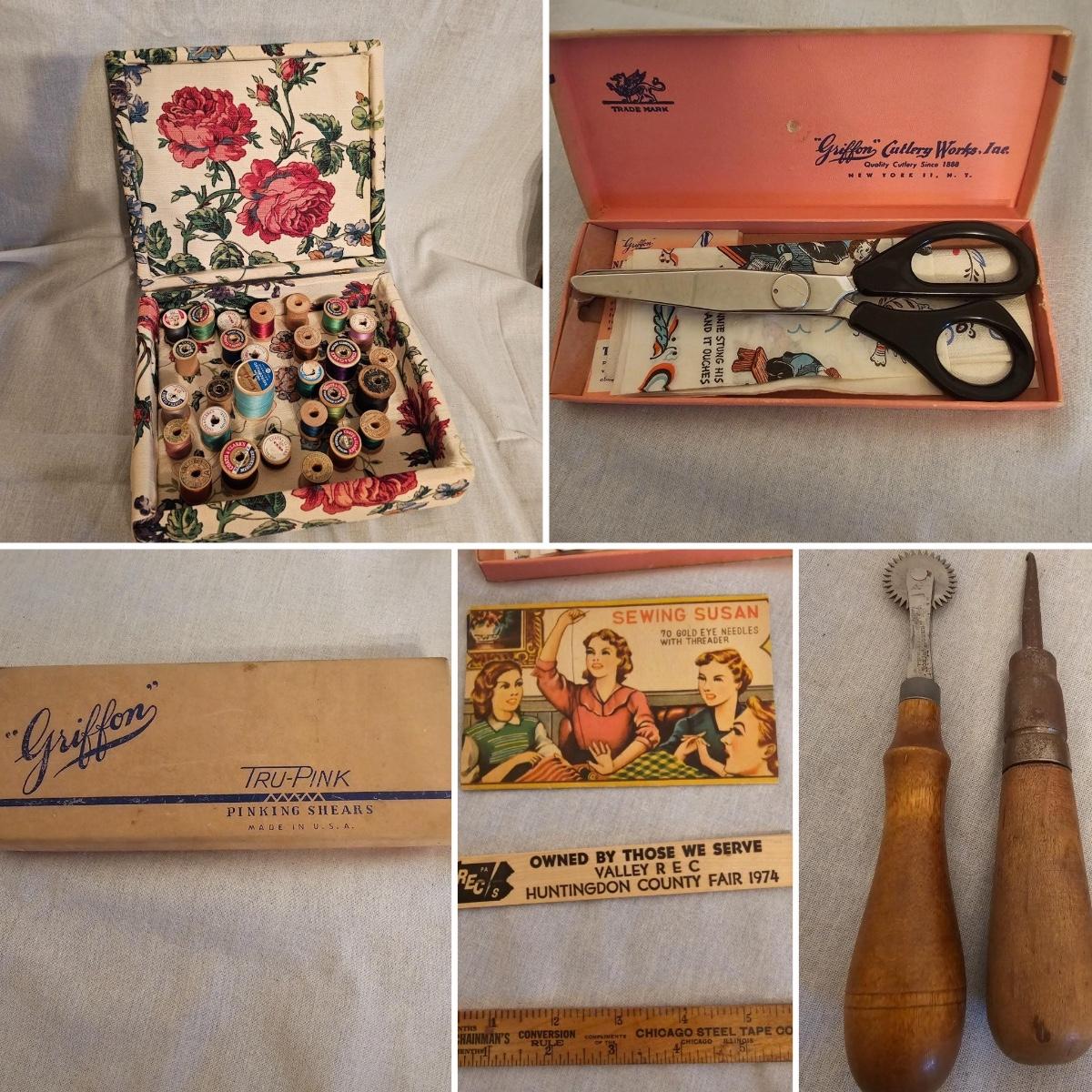 Wooden spools of thread, old rulers, vintage ponce wheels. Sewing items from the past, this also includes a fold up carry sewing kit, a needlepoint pin cushion and a padded notions box to hold it all. Box measures 10"W x 8.75"D x 3.5"H. Lap pad is by Nieman Marcus, measures 18.5"W x 3.5"D x 15"H. One pair Griffon 7" Pinking Shears in original box. Multiple wooden spools of vintage thread, nice to look at but probably not strong enough for sewing. See photos for details. Shipping available.