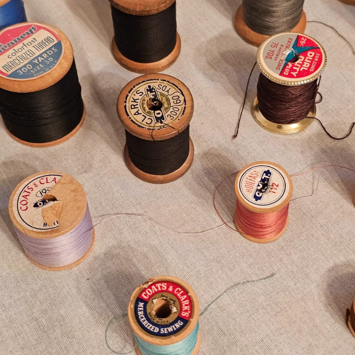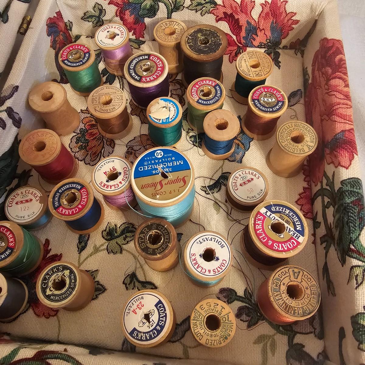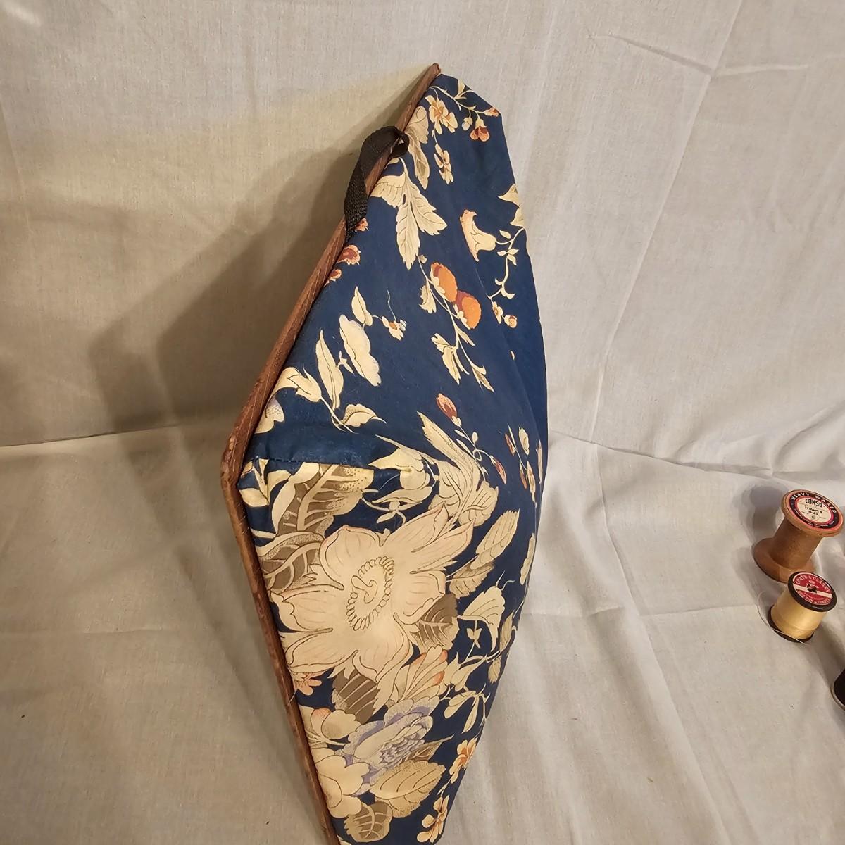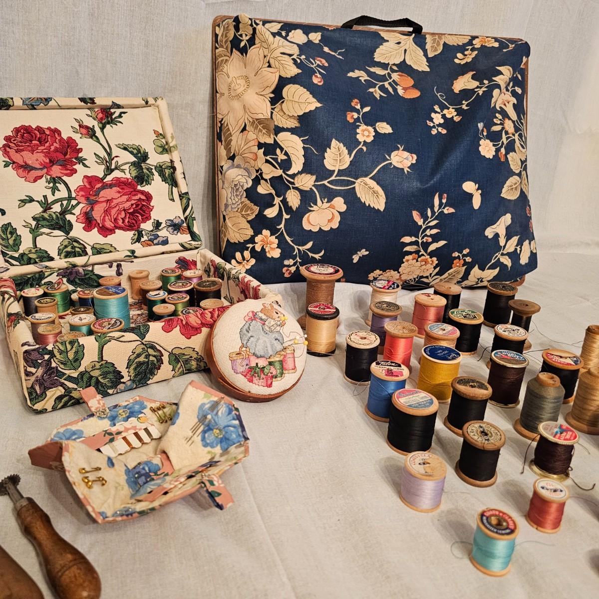 Wooden spools of thread, old rulers, vintage ponce wheels. Sewing items from the past, this also includes a fold up carry sewing kit, a needlepoint pin cushion and a padded notions box to hold it all. Box measures 10"W x 8.75"D x 3.5"H. Lap pad is by Nieman Marcus, measures 18.5"W x 3.5"D x 15"H. One pair Griffon 7" Pinking Shears in original box. Multiple wooden spools of vintage thread, nice to look at but probably not strong enough for sewing. See photos for details. Shipping available.