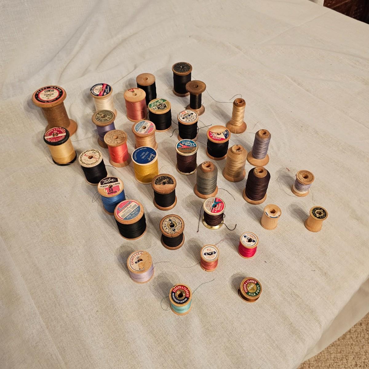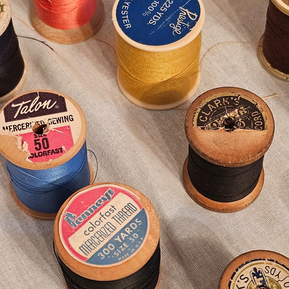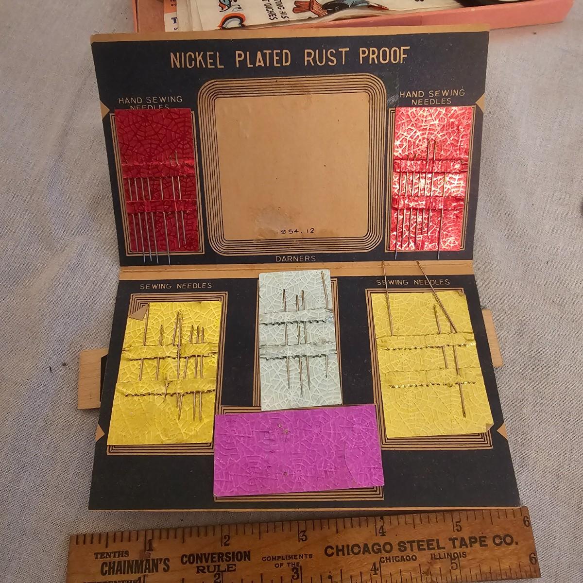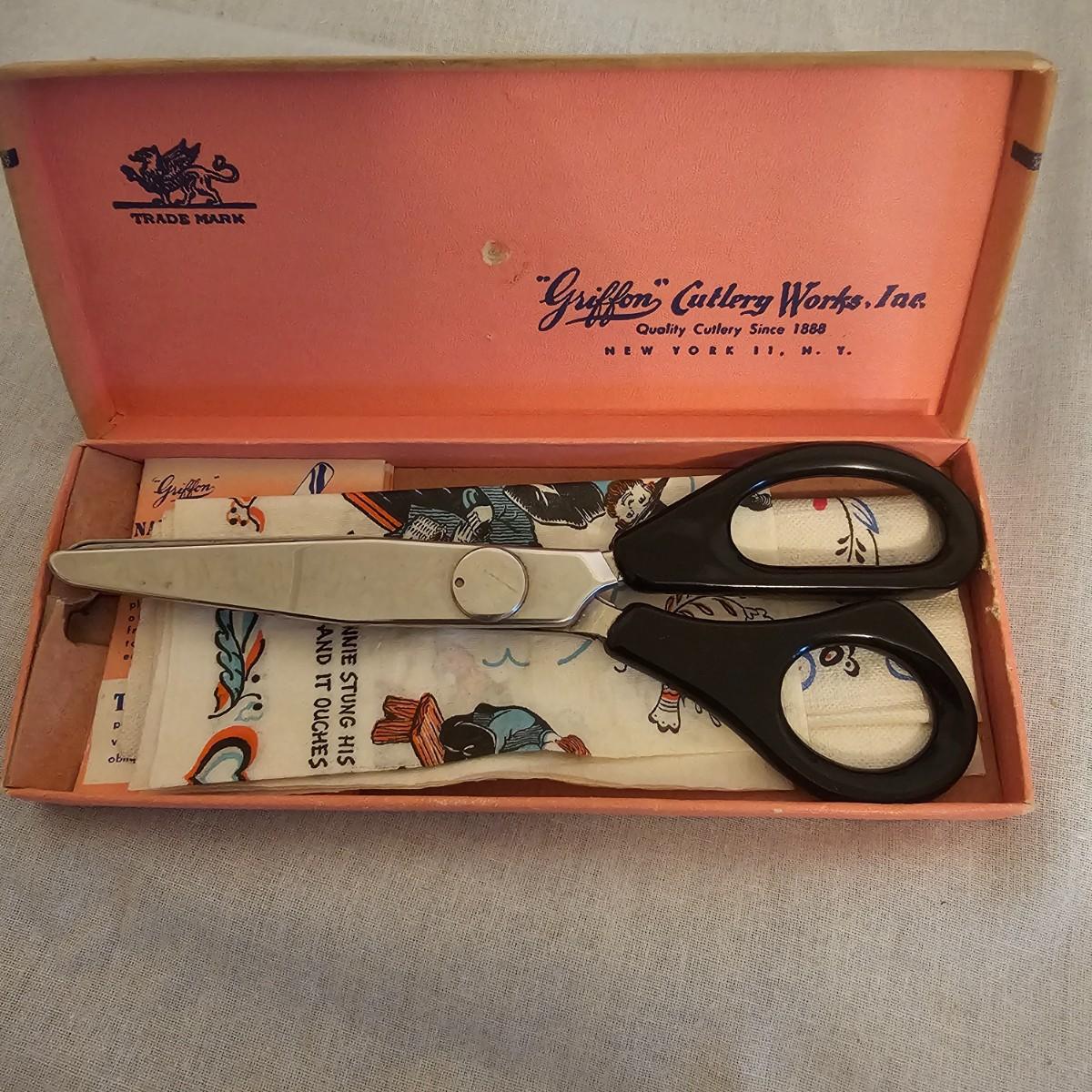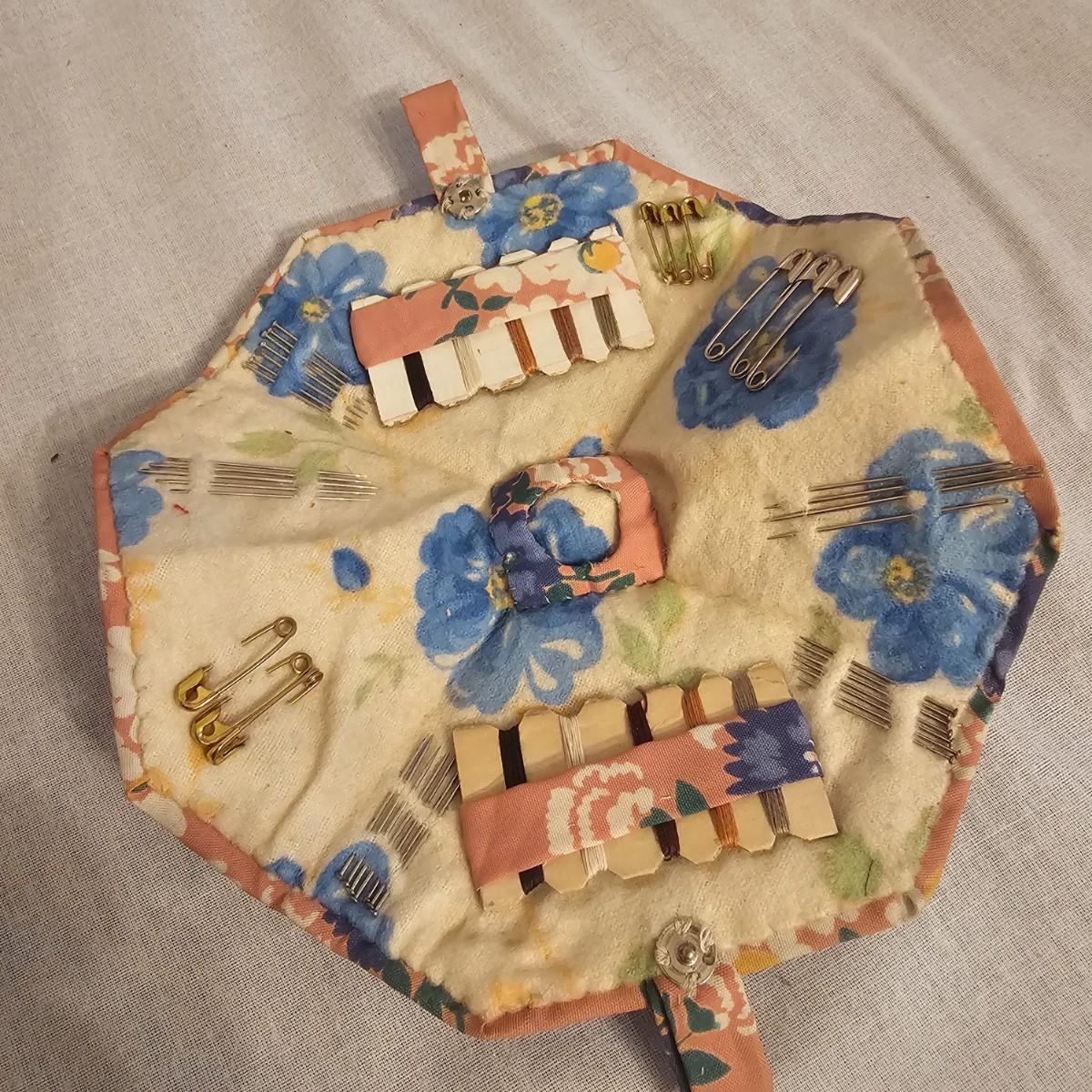 Wooden spools of thread, old rulers, vintage ponce wheels. Sewing items from the past, this also includes a fold up carry sewing kit, a needlepoint pin cushion and a padded notions box to hold it all. Box measures 10"W x 8.75"D x 3.5"H. Lap pad is by Nieman Marcus, measures 18.5"W x 3.5"D x 15"H. One pair Griffon 7" Pinking Shears in original box. Multiple wooden spools of vintage thread, nice to look at but probably not strong enough for sewing. See photos for details. Shipping available.