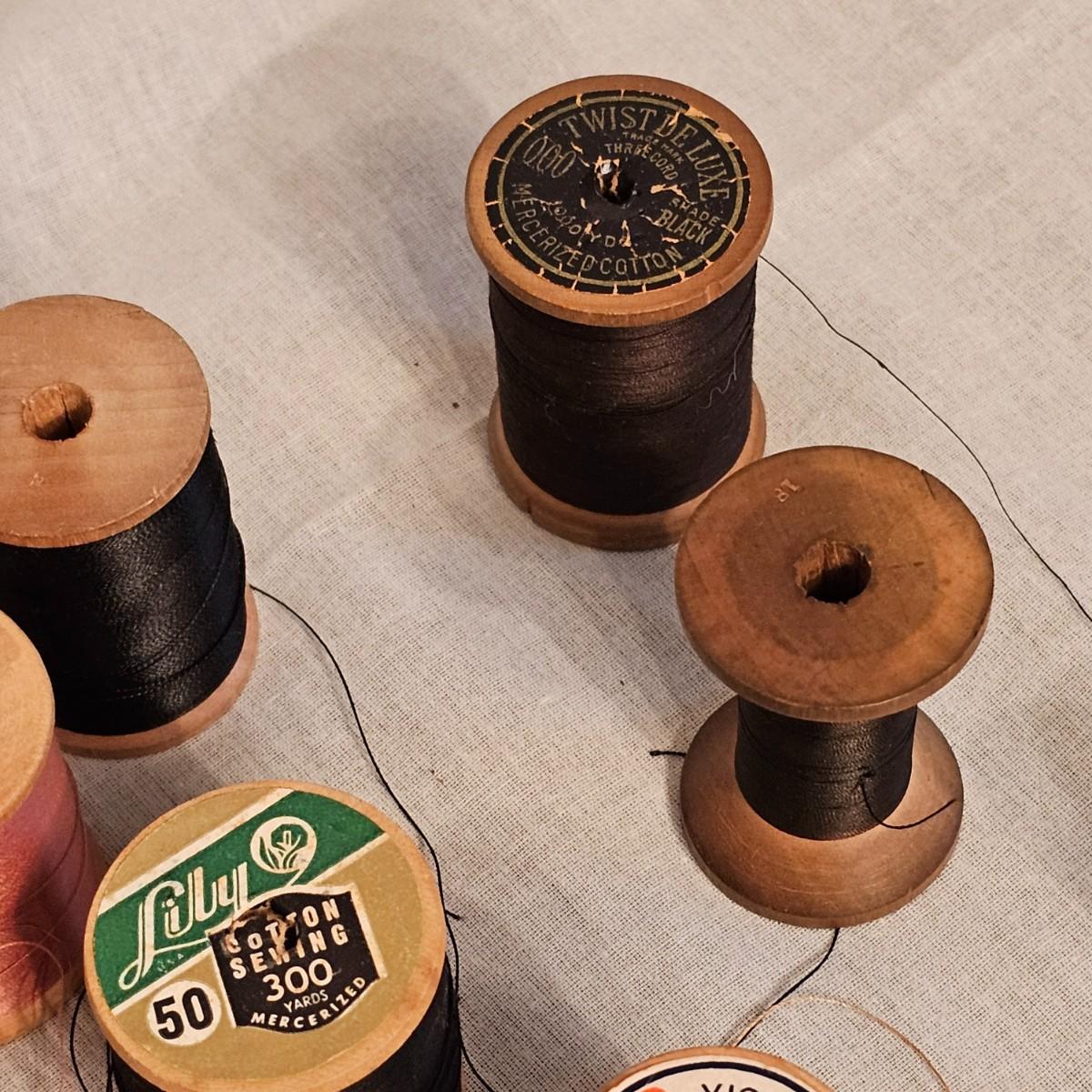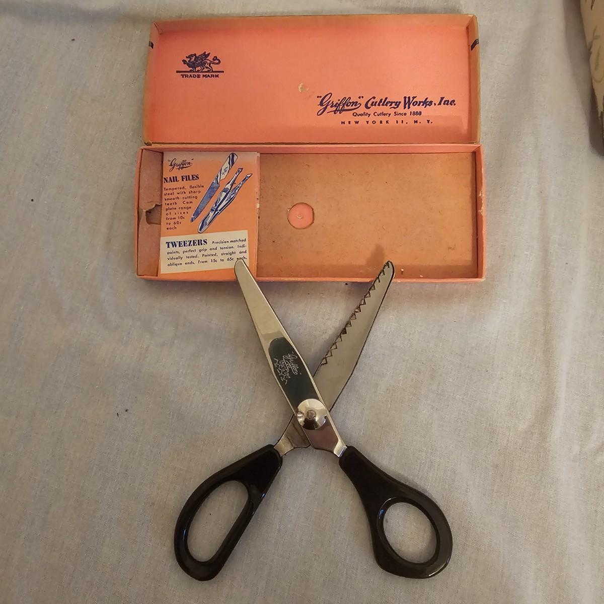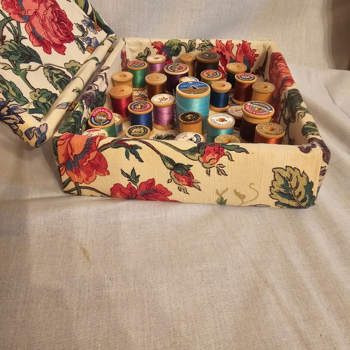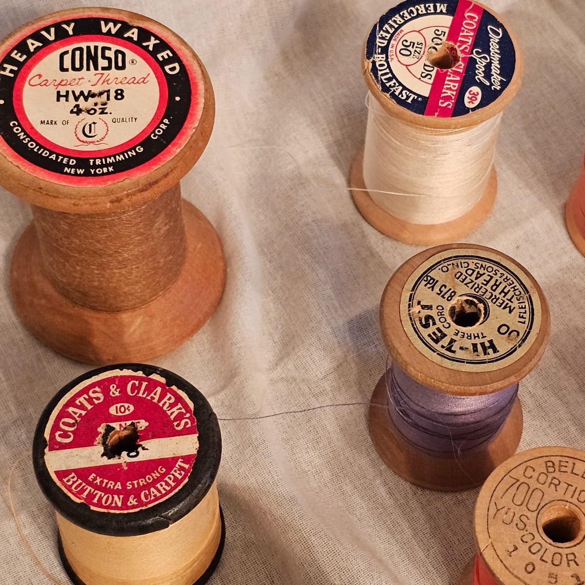 Wooden spools of thread, old rulers, vintage ponce wheels. Sewing items from the past, this also includes a fold up carry sewing kit, a needlepoint pin cushion and a padded notions box to hold it all. Box measures 10"W x 8.75"D x 3.5"H. Lap pad is by Nieman Marcus, measures 18.5"W x 3.5"D x 15"H. One pair Griffon 7" Pinking Shears in original box. Multiple wooden spools of vintage thread, nice to look at but probably not strong enough for sewing. See photos for details. Shipping available.