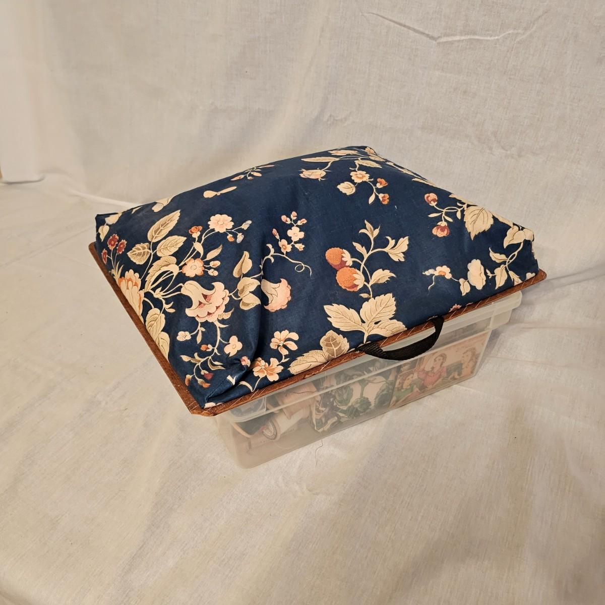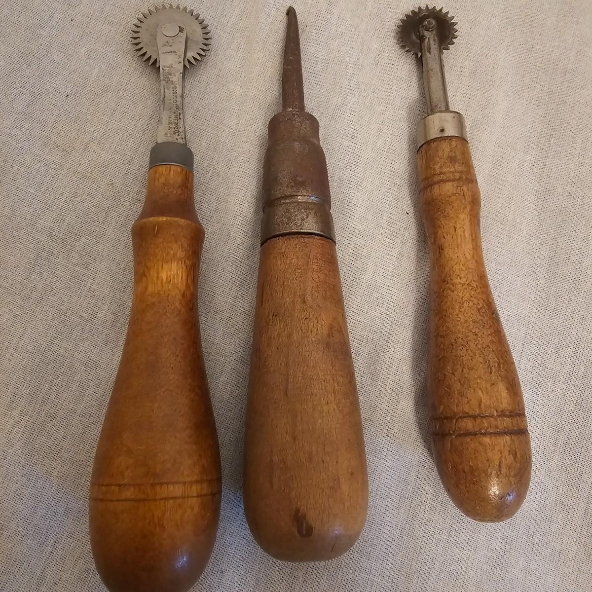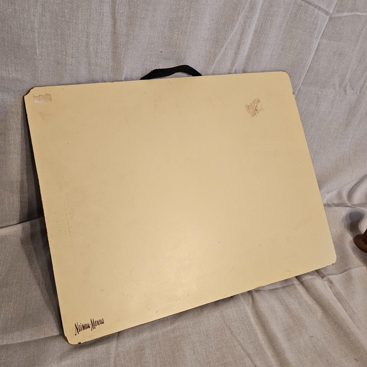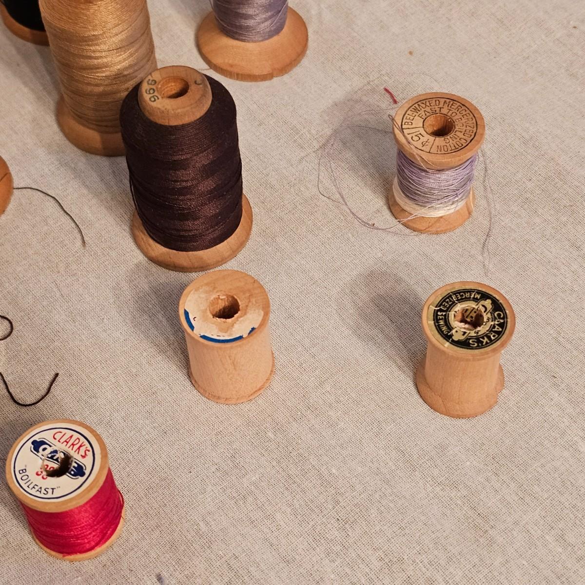Wooden spools of thread, old rulers, vintage ponce wheels. Sewing items from the past, this also includes a fold up carry sewing kit, a needlepoint pin cushion and a padded notions box to hold it all. Box measures 10"W x 8.75"D x 3.5"H. Lap pad is by Nieman Marcus, measures 18.5"W x 3.5"D x 15"H. One pair Griffon 7" Pinking Shears in original box. Multiple wooden spools of vintage thread, nice to look at but probably not strong enough for sewing. See photos for details. Shipping available.