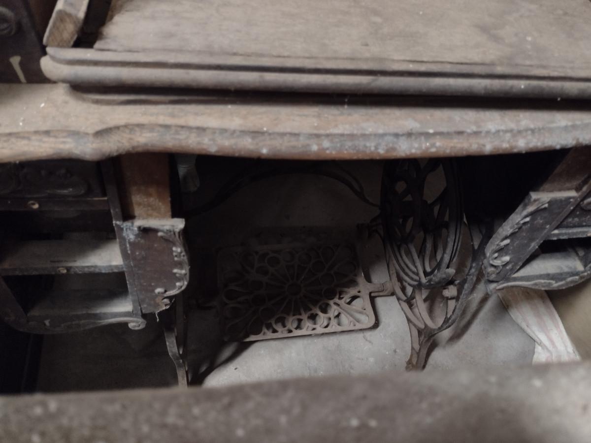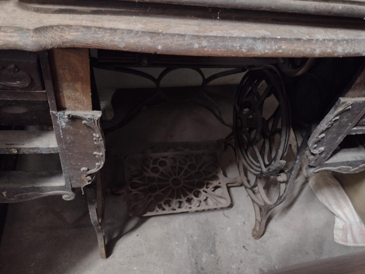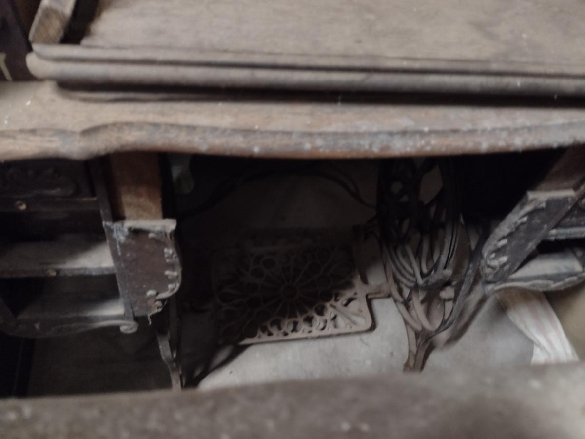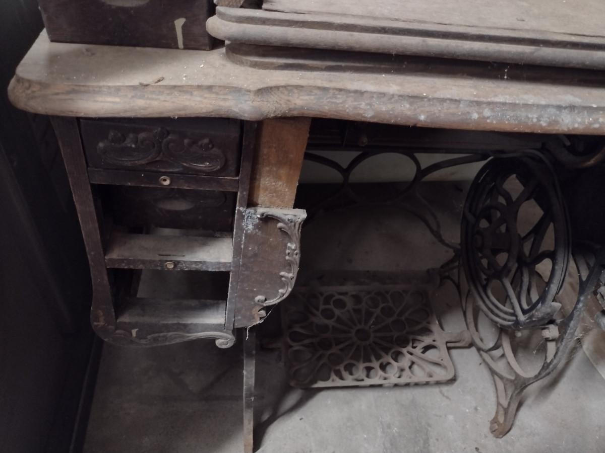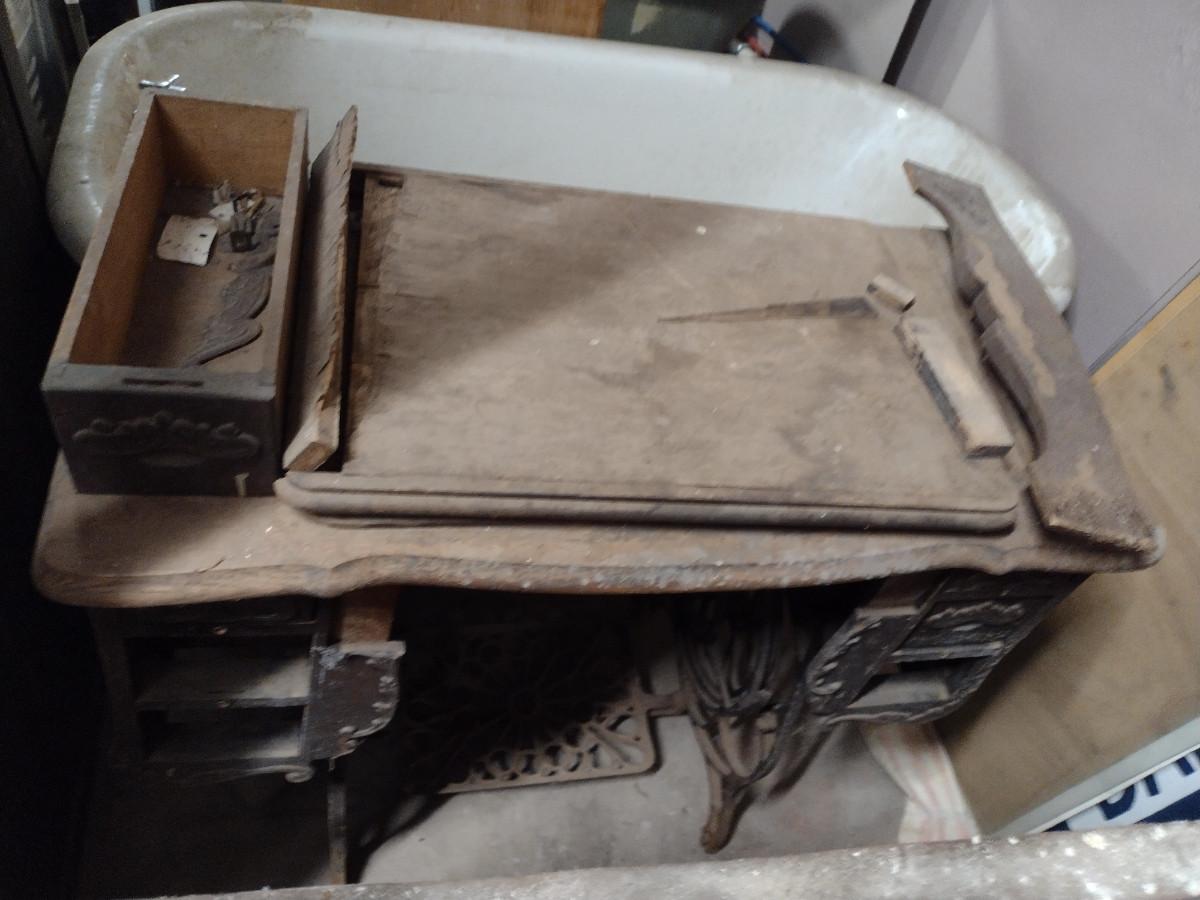 Vintage Sewing Machine Cabinet with Cast Iron Treadle Base. Wooden cabinet is severely damaged and all pieces may not be present.