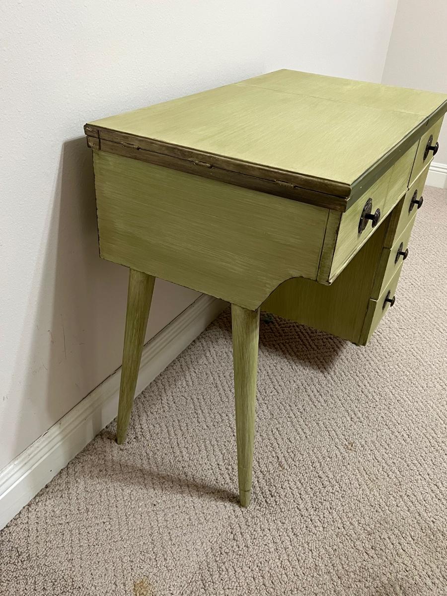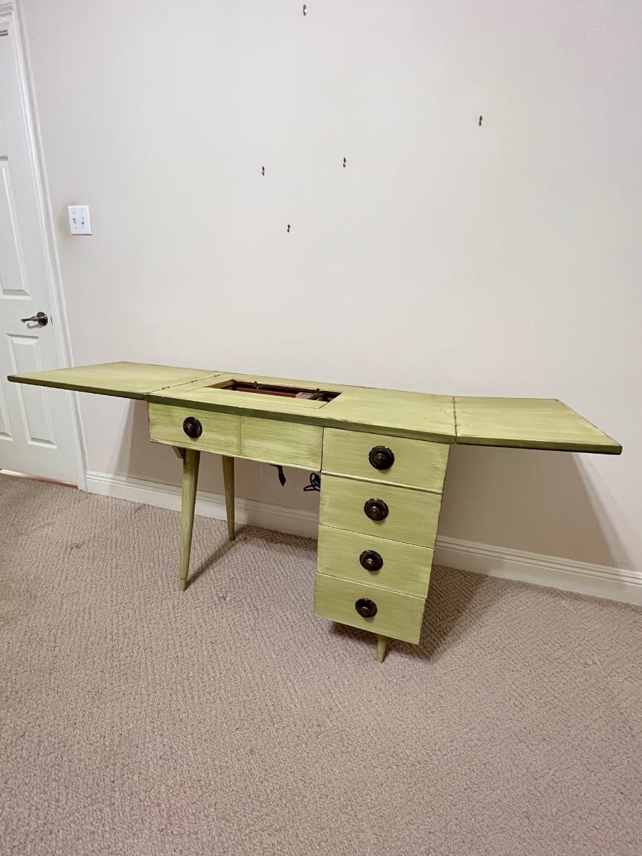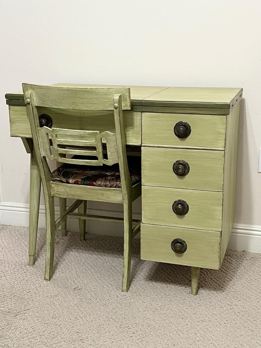 Use as a desk, vanity or add a sewing machine ~ Includes: cabinet, chair & sewing supplies in the desk ~ All drawers slide in & out easily ~ Sewing machine inside the cabinet does not work ~ Desk = 30” H x 33.5” W x 19” D ~ Leaves extended = 68” W ~ Chair = 32” H x 16.5” W x 20” D
