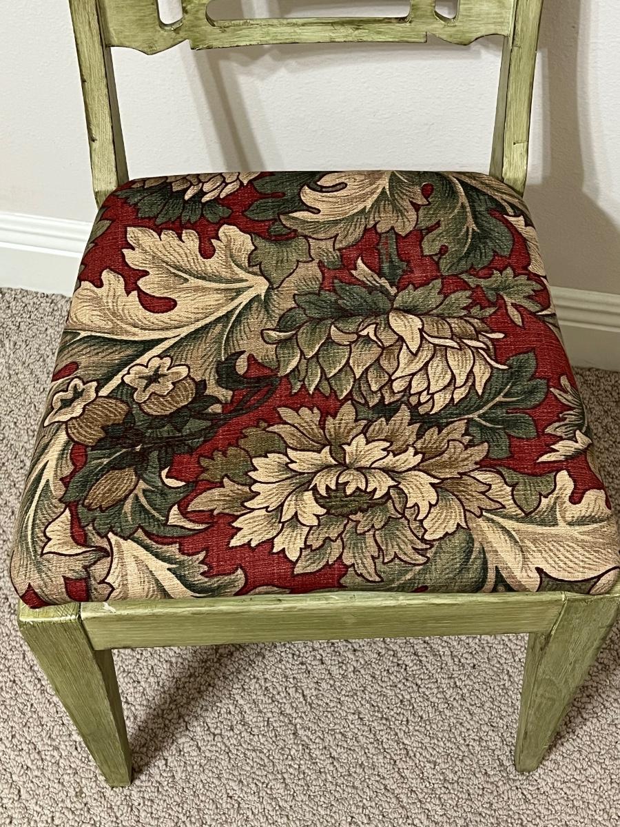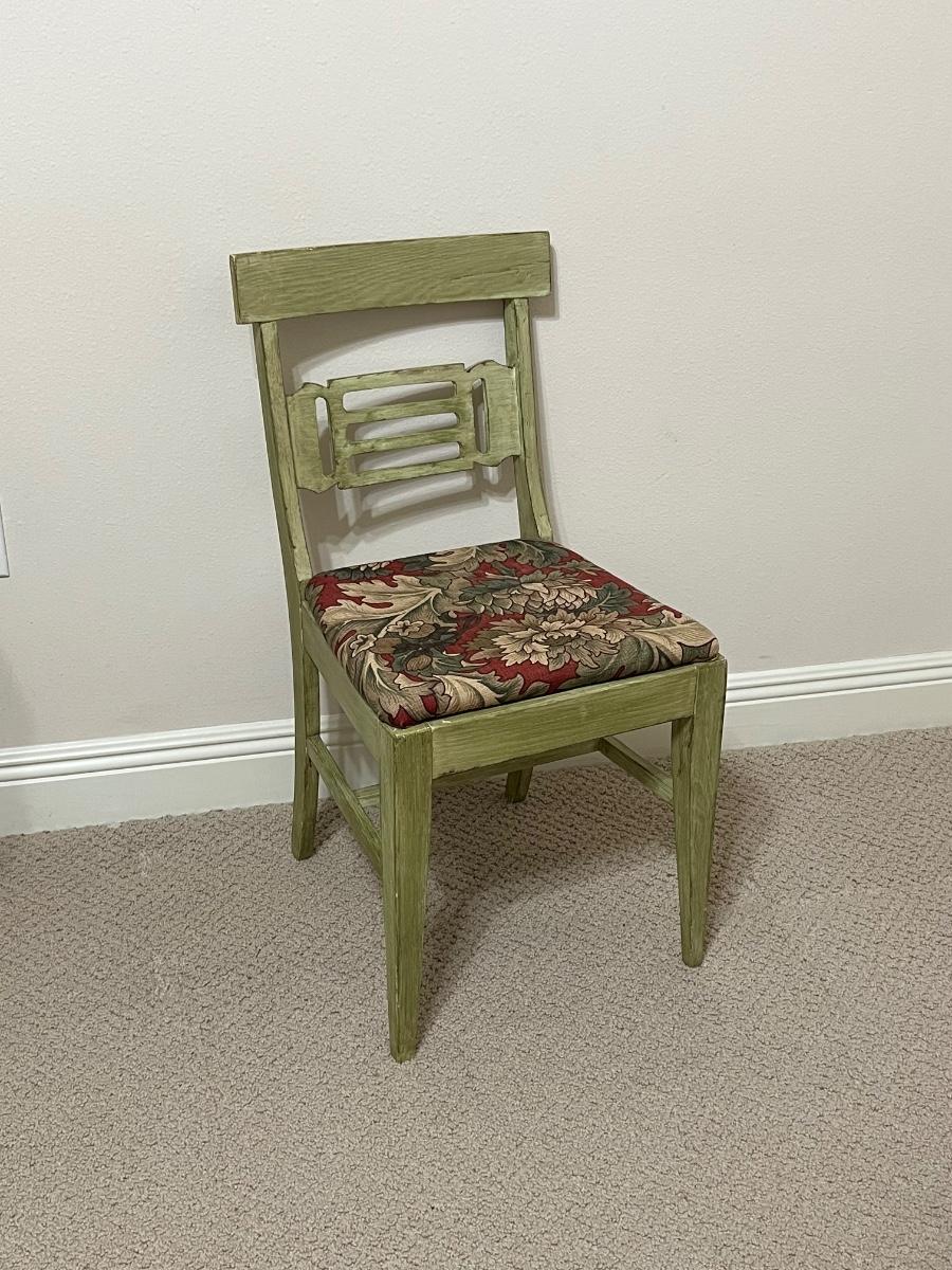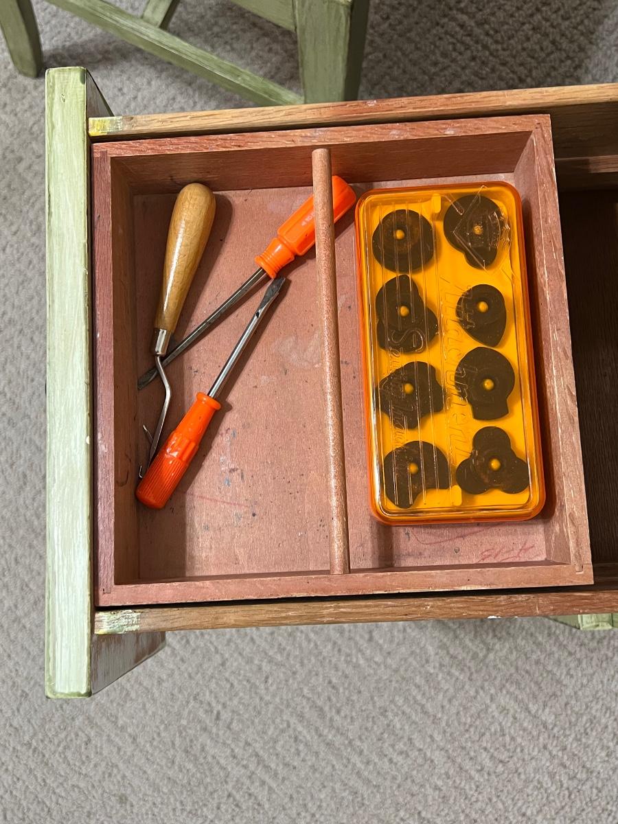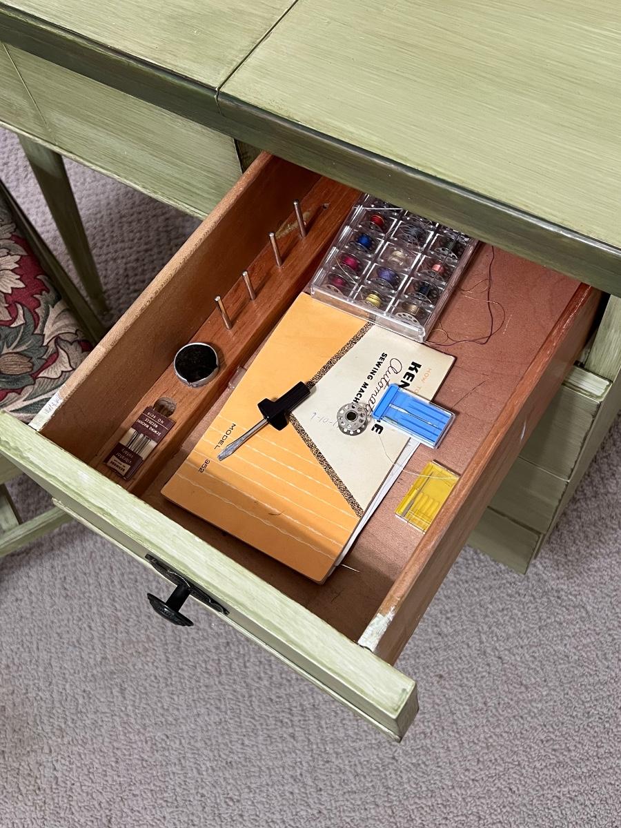 Use as a desk, vanity or add a sewing machine ~ Includes: cabinet, chair & sewing supplies in the desk ~ All drawers slide in & out easily ~ Sewing machine inside the cabinet does not work ~ Desk = 30” H x 33.5” W x 19” D ~ Leaves extended = 68” W ~ Chair = 32” H x 16.5” W x 20” D