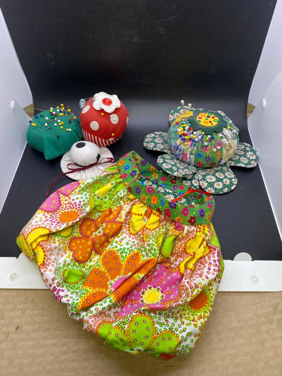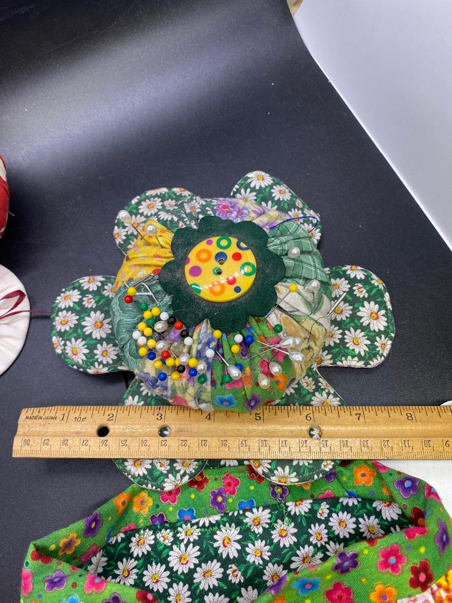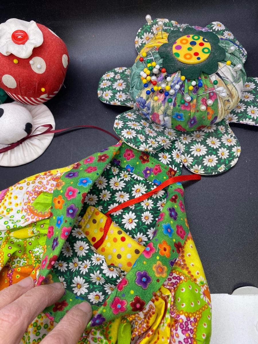 Vintage pin cushion lot. Three small cushions, look home made. The large retro fabric daisy pin cushion has a accessory/scraps bag attached. Good condition.