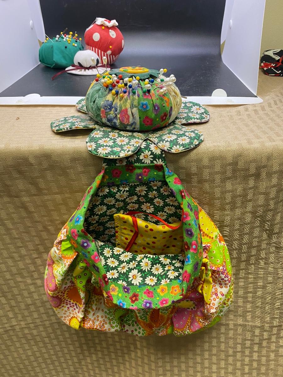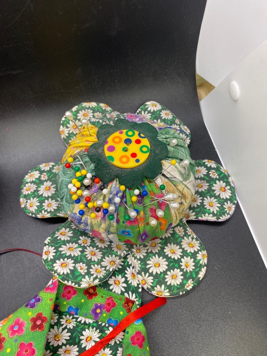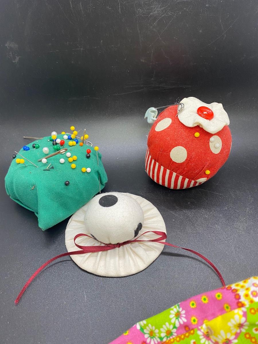 Vintage pin cushion lot. Three small cushions, look home made. The large retro fabric daisy pin cushion has a accessory/scraps bag attached. Good condition.
