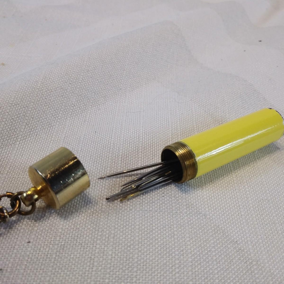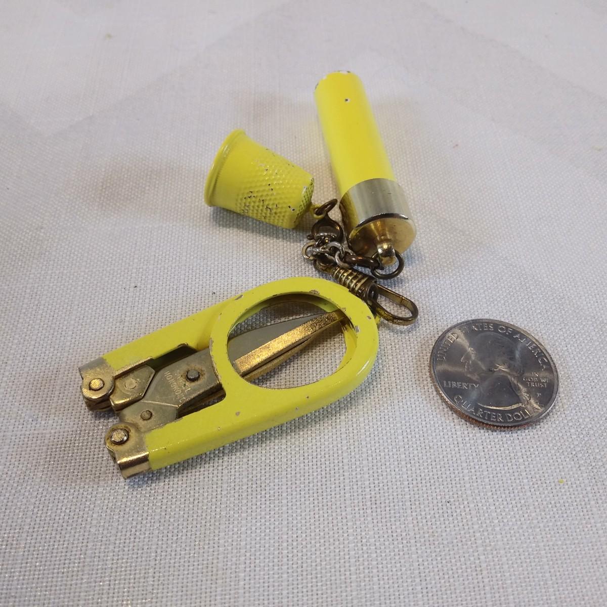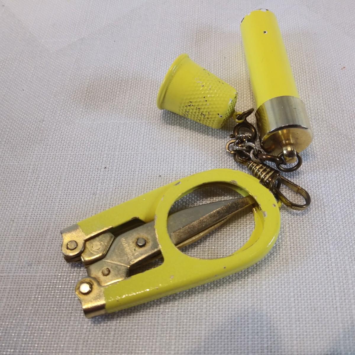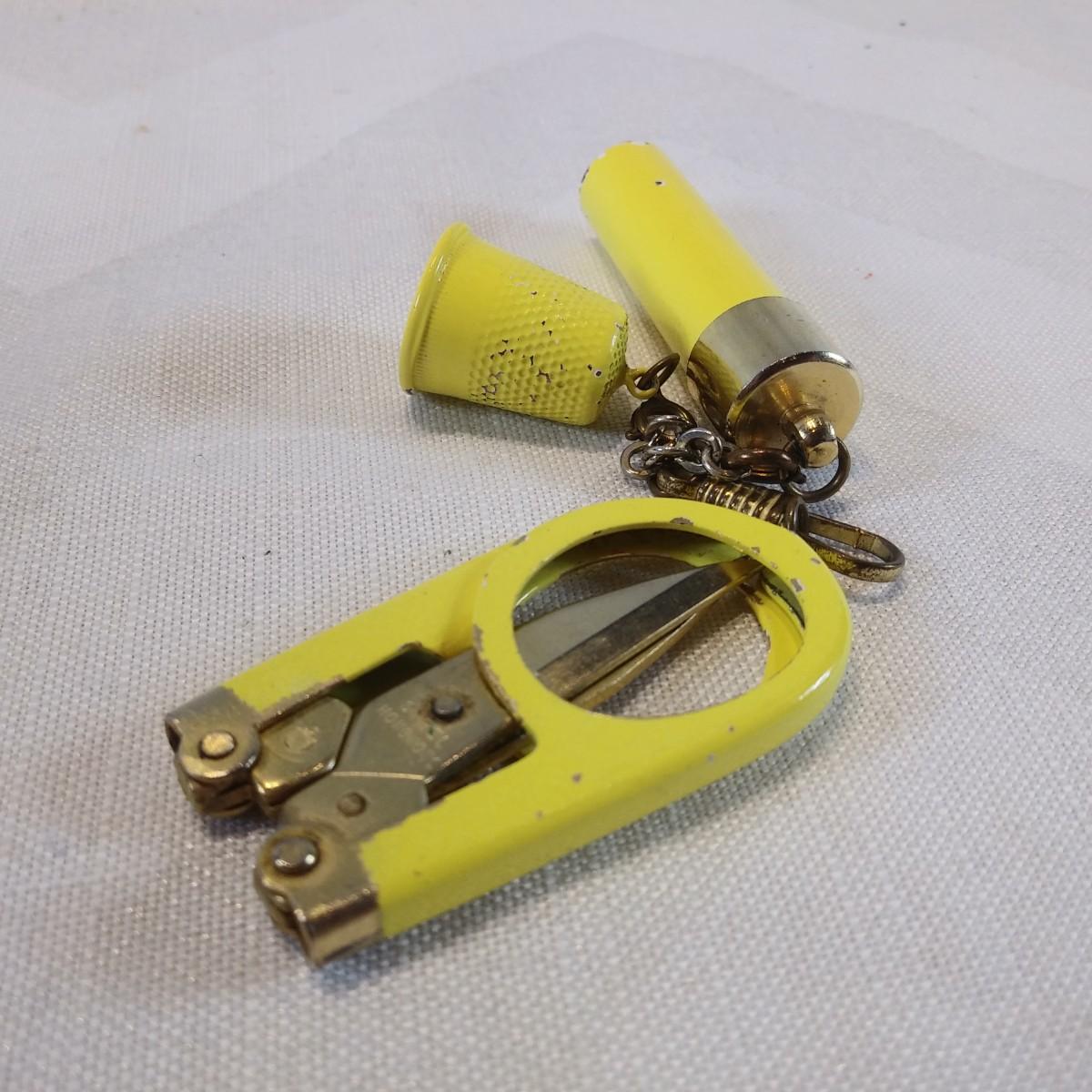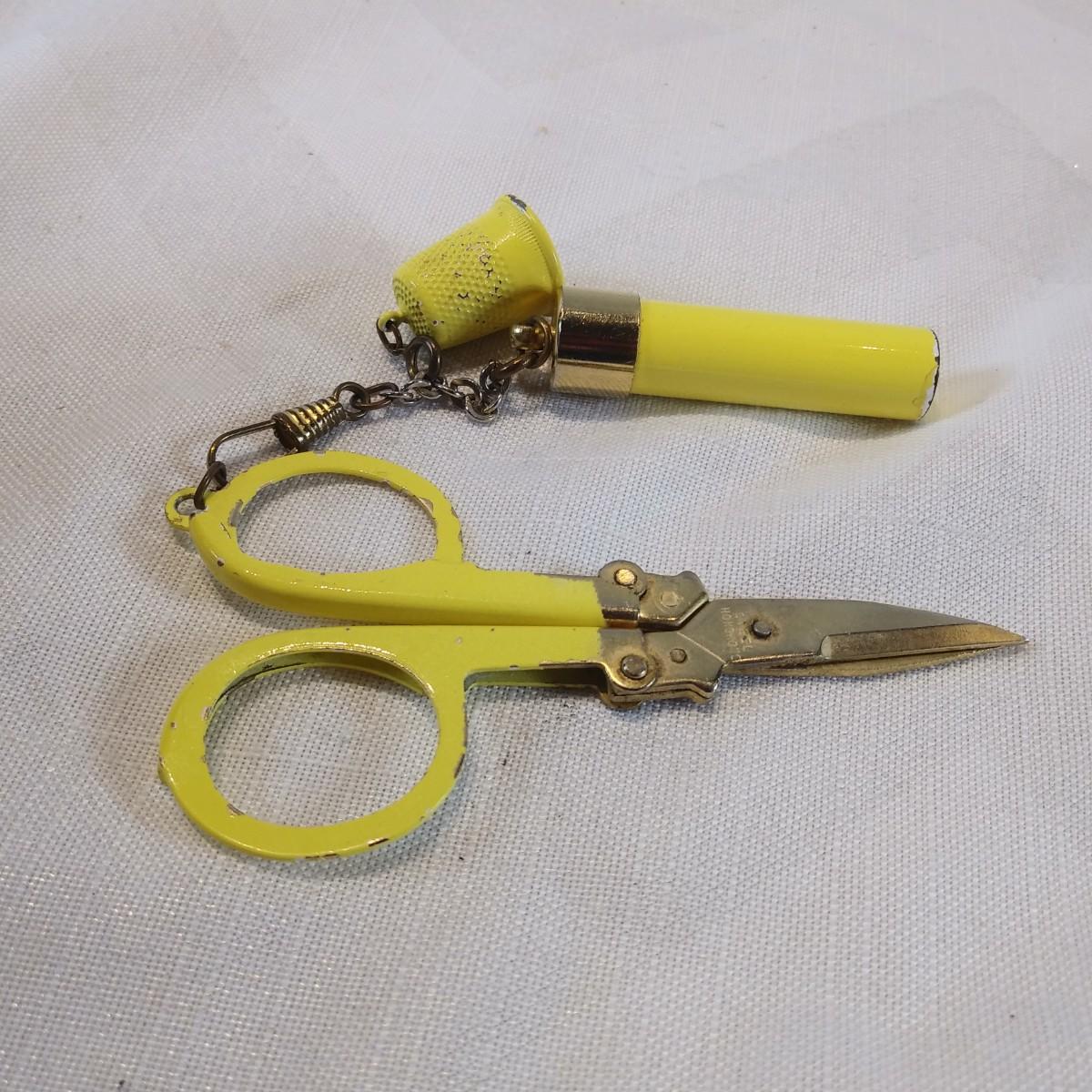 This auction lot is for a Vintage Sewing Set. An unusual set of three yellow sewing tools: folding scissors, thimble and a needle holder with needles. Very vintage and cool. Scratches consistent with age and use, overall in very good condition. The needles look sharp and unused.